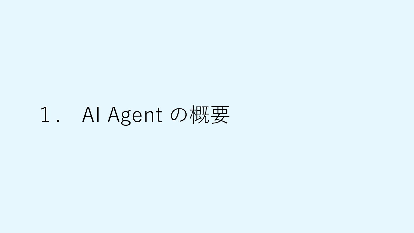 Think Input Prompt Output Action Action Think Input: Complex Task Output Action Agent Reflect Agent AI Agent とは タスクを実行できるAI • ルール・ベース (xの場合、yを実行) • 事前に定義されたアクションのみ行う • エラー発生時は停止 • 一方通行のアクション類推 • ゴール・ベース • ゴールに向けて自律的にアクションを実行 • 自己修正 • 思考と実行のループによるアクション類推