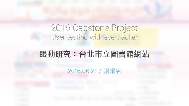 本研究為 2016 年使用者行為研究之課堂 Milestone Project。以當時的台北市立圖書館網站為測試標的,招募 7 位受測者進行眼動研究。本研究之眼動儀為 Tobii Pro,感謝百喻研究室的提供設備以及研究回饋。