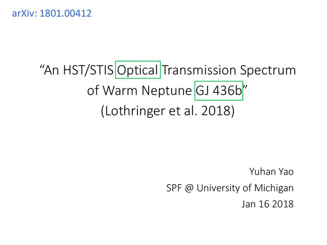 This slides is for a paper talk for the "star, planet, and formation meeting" at the University of Michigan. The authors obtained HST optical transmission spectrum for the exoplanet GJ 436b -- a JWST GTO target !