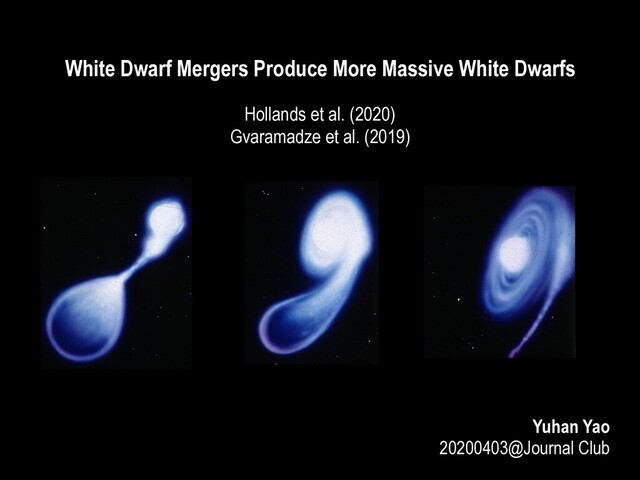 viscous envelope, giant phase (2)—(3): ionize material, form nebula, no H He (3)—(4): contract, C flame reaches the center Beyond: Kelvin-Helmholtz contraction White dwarf basics WD merger products Hollands+2000 Gvaramadze+2019 Final remarks Schwab et al. (2016) !10