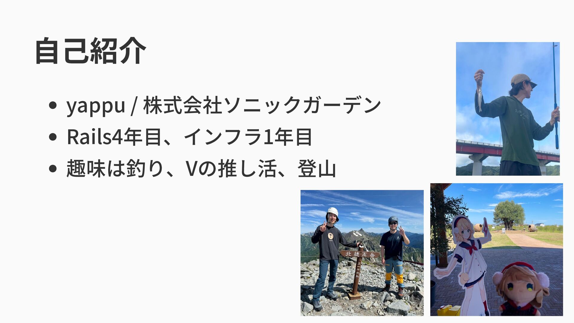自己紹介 yappu / 株式会社ソニックガーデン Rails4年目、インフラ1年目 趣味は釣り、Vの推し活、登山