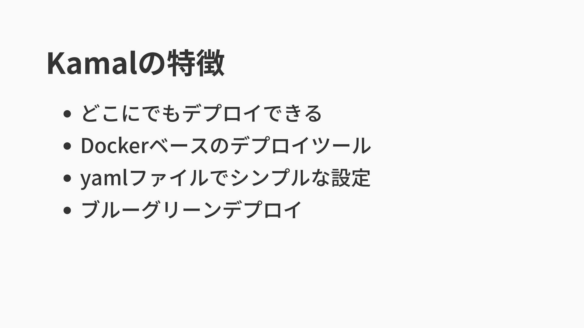 Kamalの特徴 どこにでもデプロイできる Dockerベースのデプロイツール yamlファイルでシンプルな設定 ブルーグリーンデプロイ