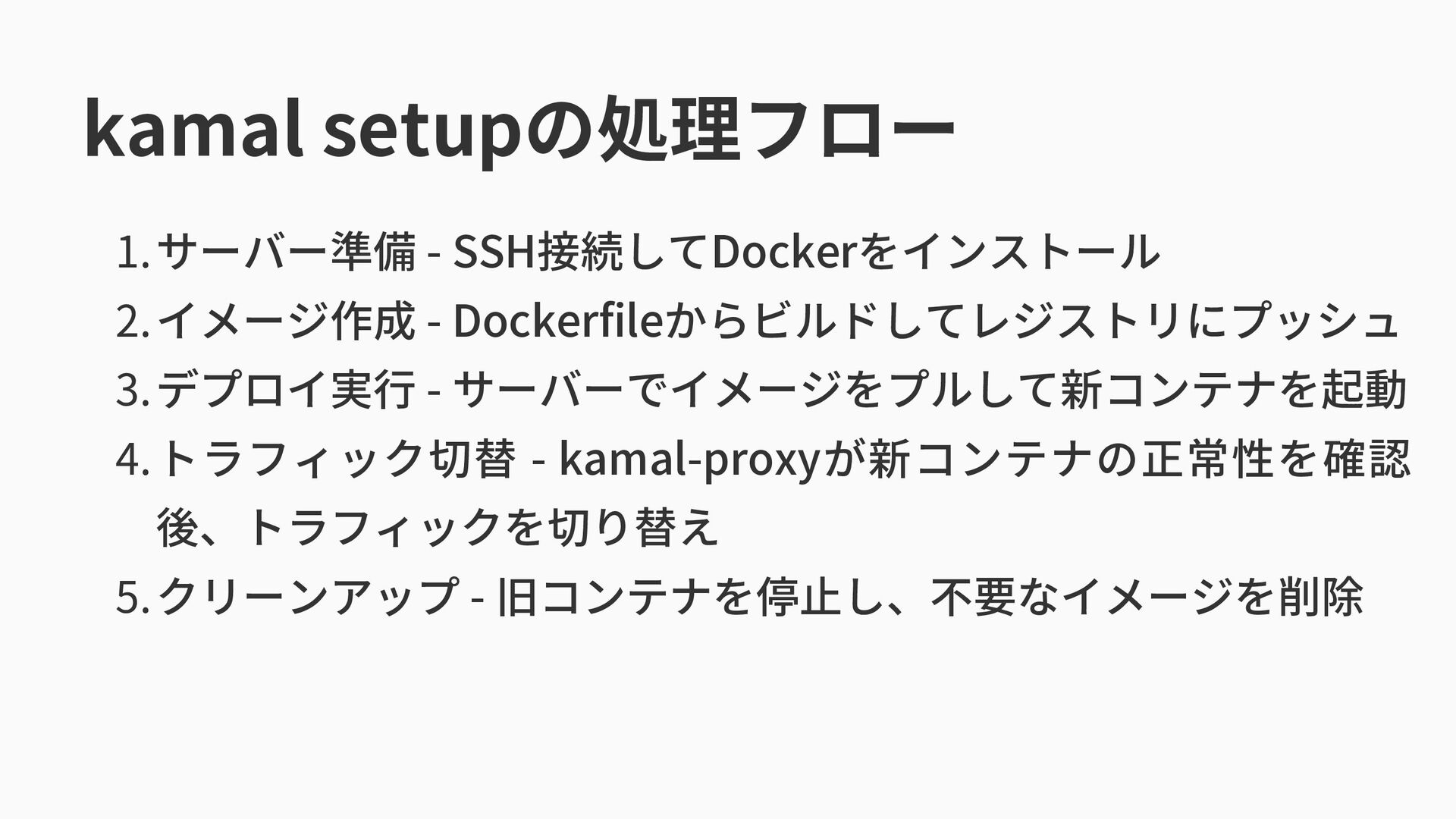 サーバーでイメージをプルして新コンテナを起動 4.トラフィック切替 - kamal-proxyが新コンテナの正常性を確認 後、トラフィックを切り替え 5.クリーンアップ - 旧コンテナを停止し、不要なイメージを削除