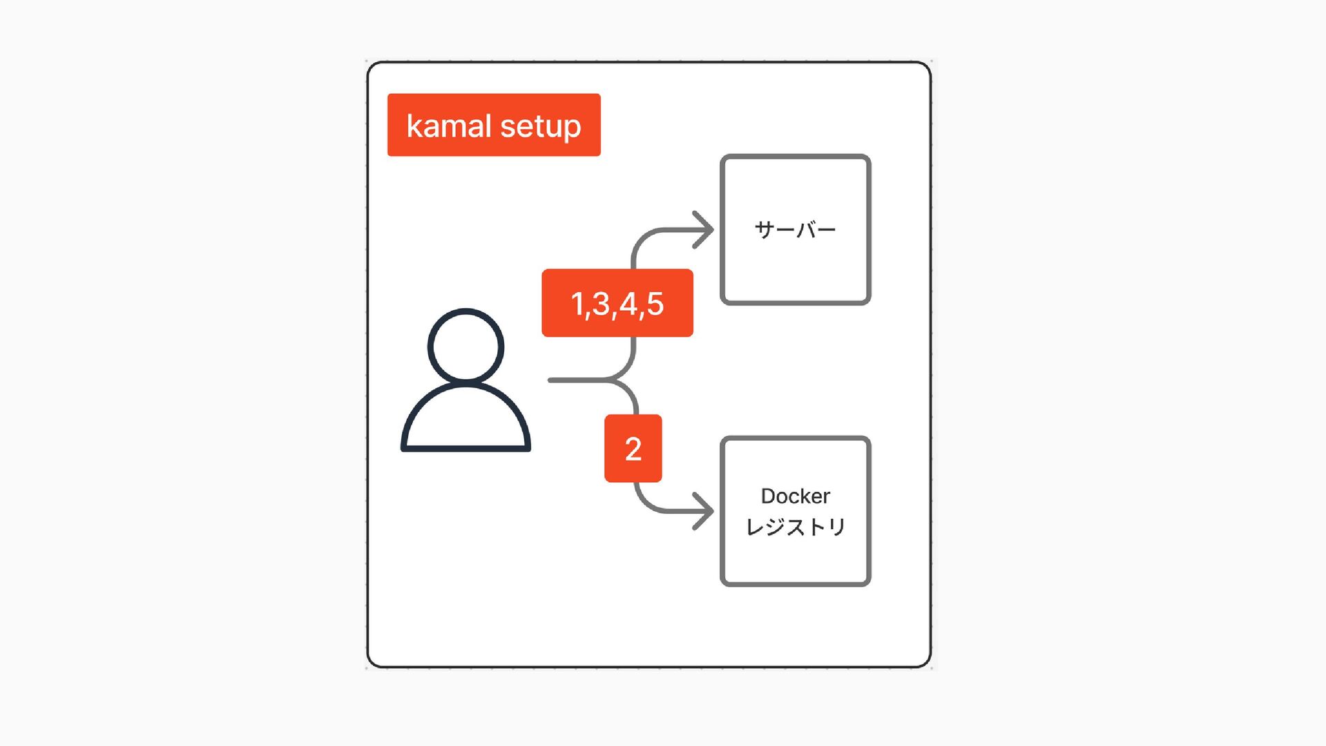 kamal setupの処理フロー 1.サーバー準備 - SSH接続してDockerをインストール 2.イメージ作成 - Dockerfileからビルドしてレジストリにプッシュ 3.デプロイ実行 -