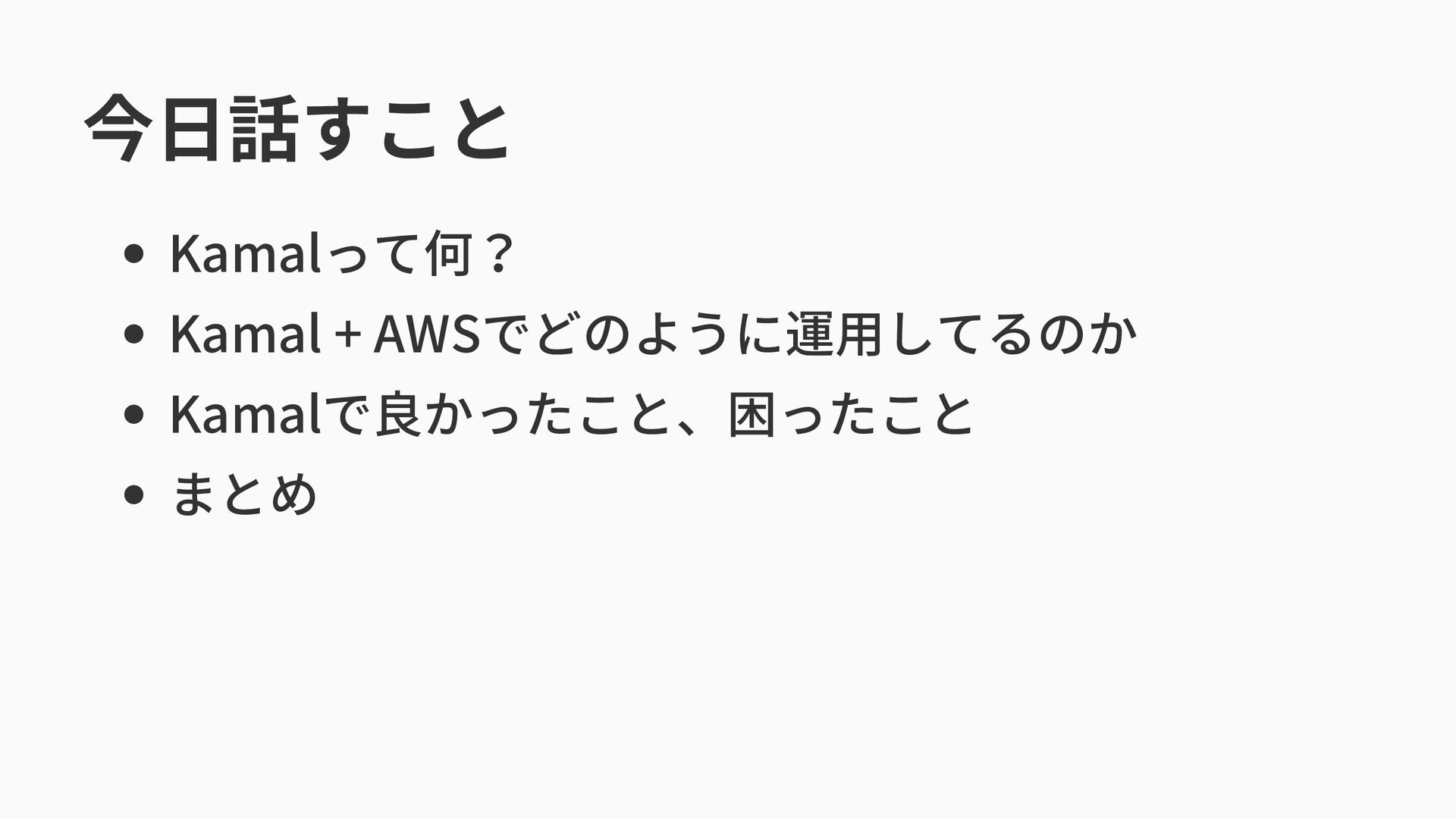 今日話すこと Kamalって何? Kamal + AWSでどのように運用してるのか Kamalで良かったこと、困ったこと まとめ