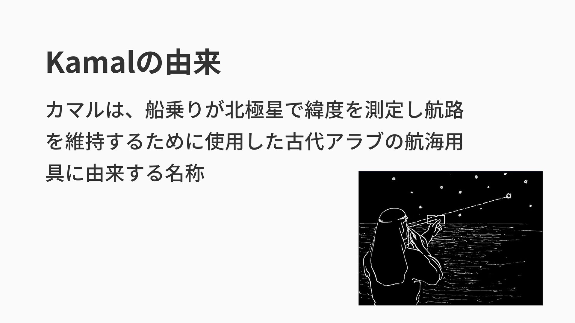 Kamalの由来 カマルは、船乗りが北極星で緯度を測定し航路 を維持するために使用した古代アラブの航海用 具に由来する名称