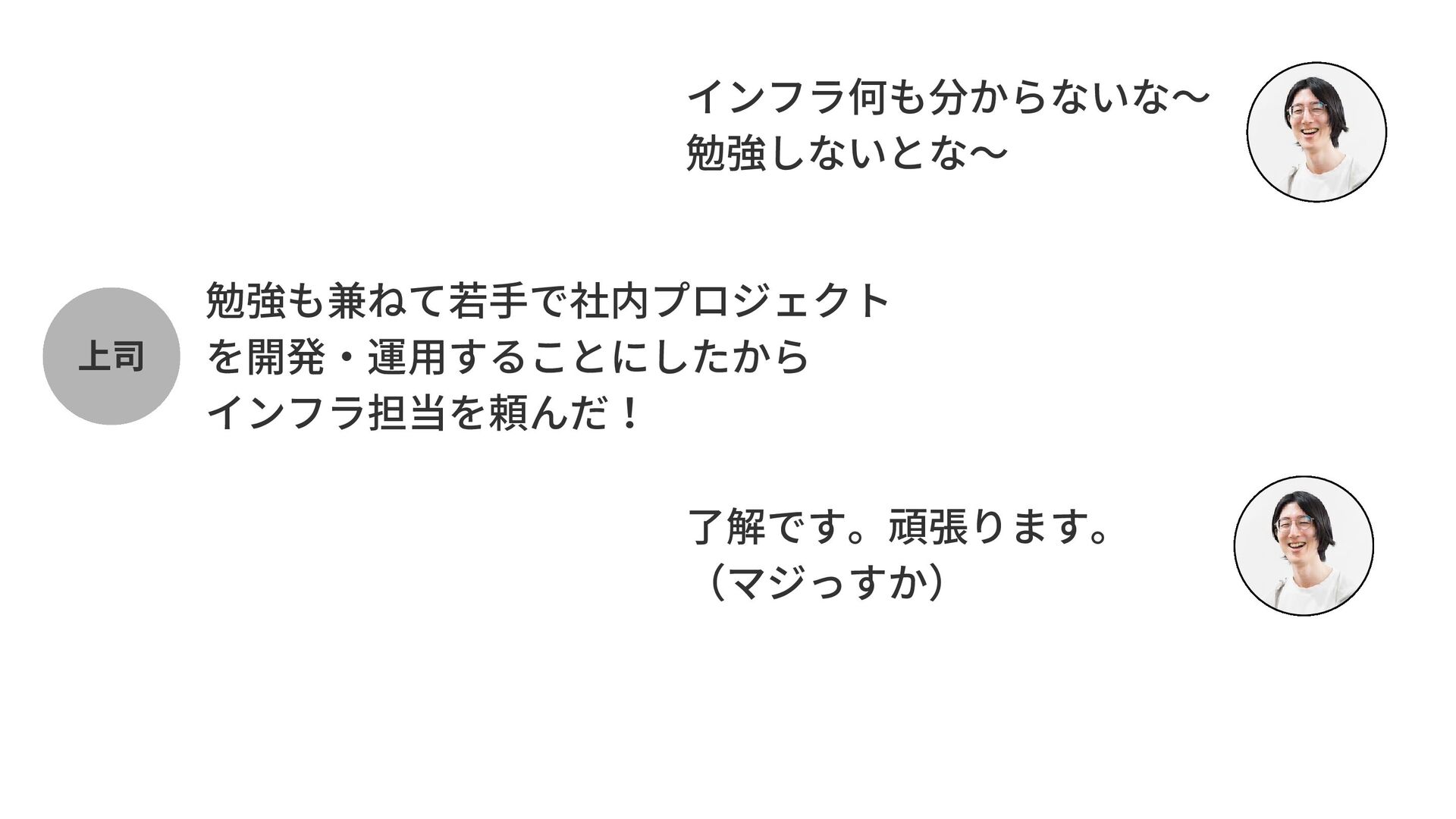 インフラ何も分からないな〜 勉強しないとな〜 上司 勉強も兼ねて若手で社内プロジェクト を開発・運用することにしたから インフラ担当を頼んだ! 了解です。頑張ります。 (マジっすか)