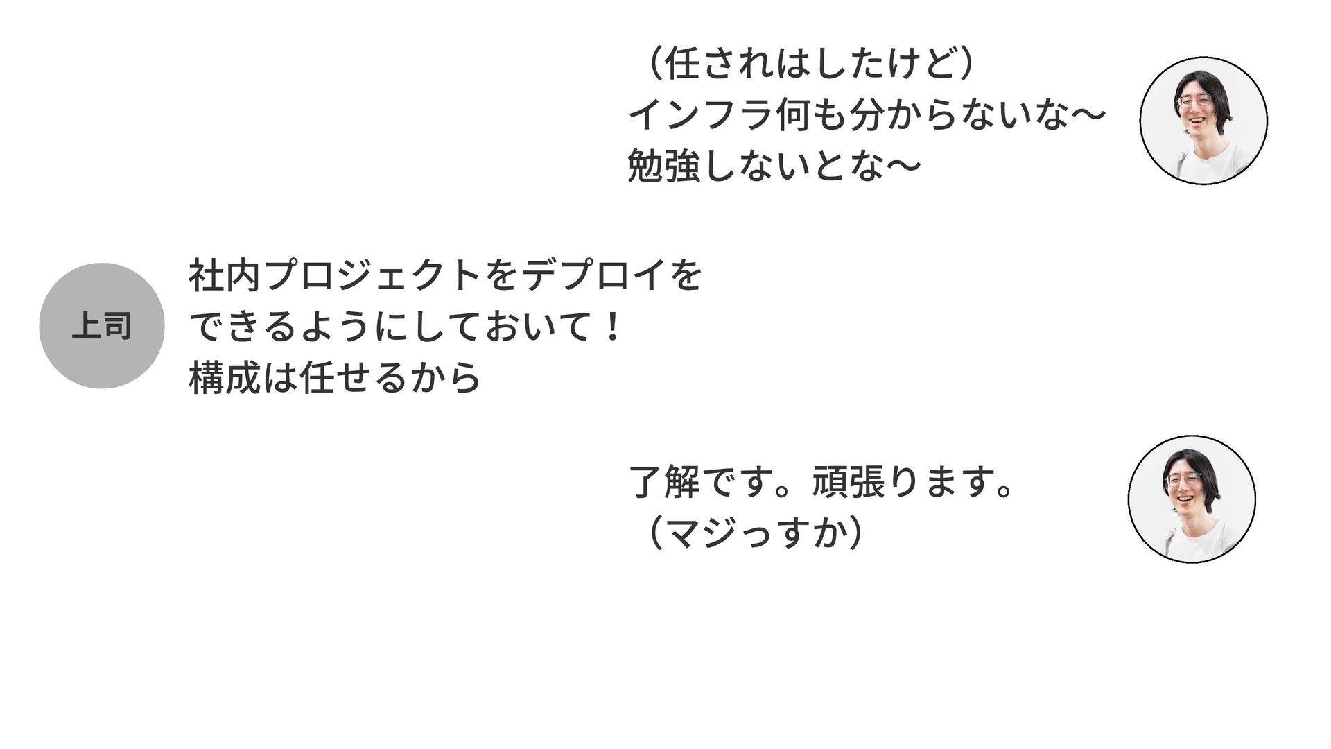 (任されはしたけど) インフラ何も分からないな〜 勉強しないとな〜 上司 社内プロジェクトをデプロイを できるようにしておいて! 構成は任せるから 了解です。頑張ります。 (マジっすか)
