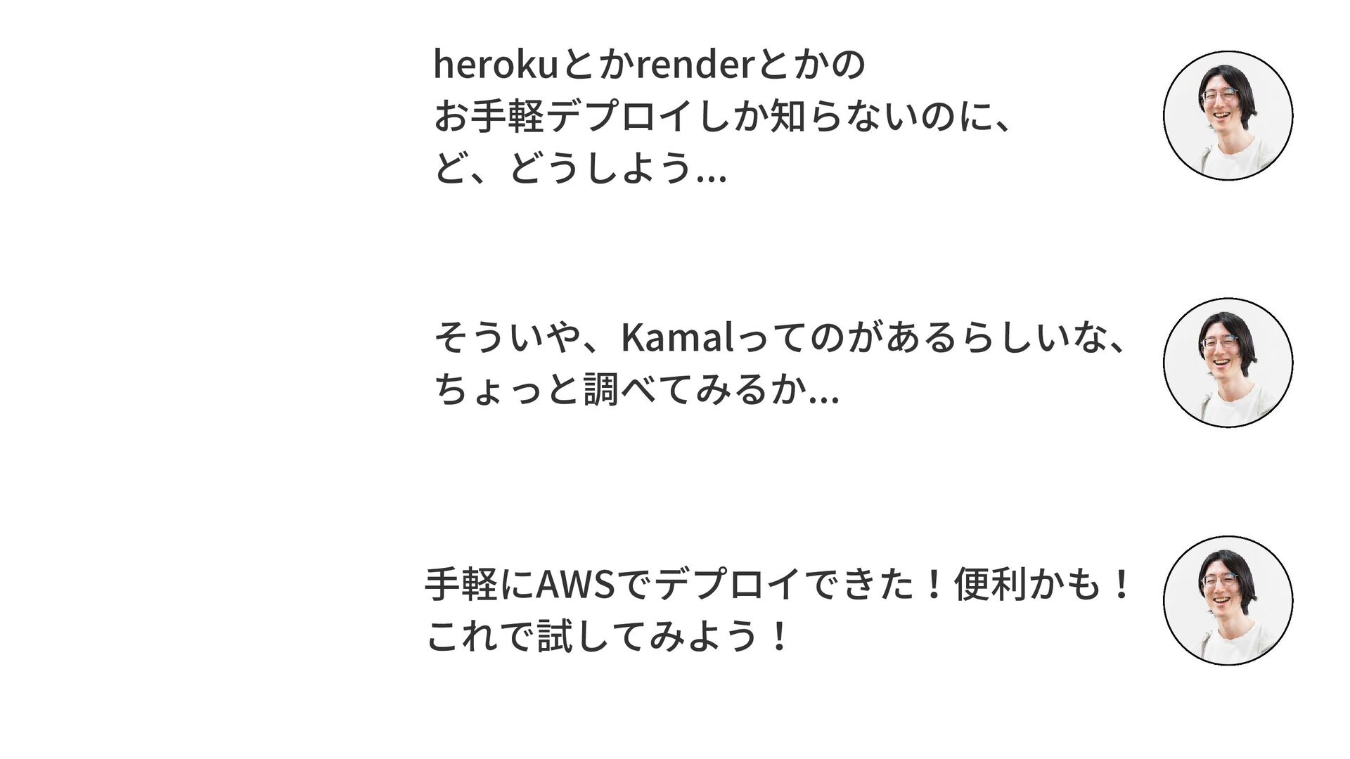 herokuとかrenderとかの お手軽デプロイしか知らないのに、 ど、どうしよう... そういや、Kamalってのがあるらしいな、 ちょっと調べてみるか... 手軽にAWSでデプロイできた!便利かも! これで試してみよう!