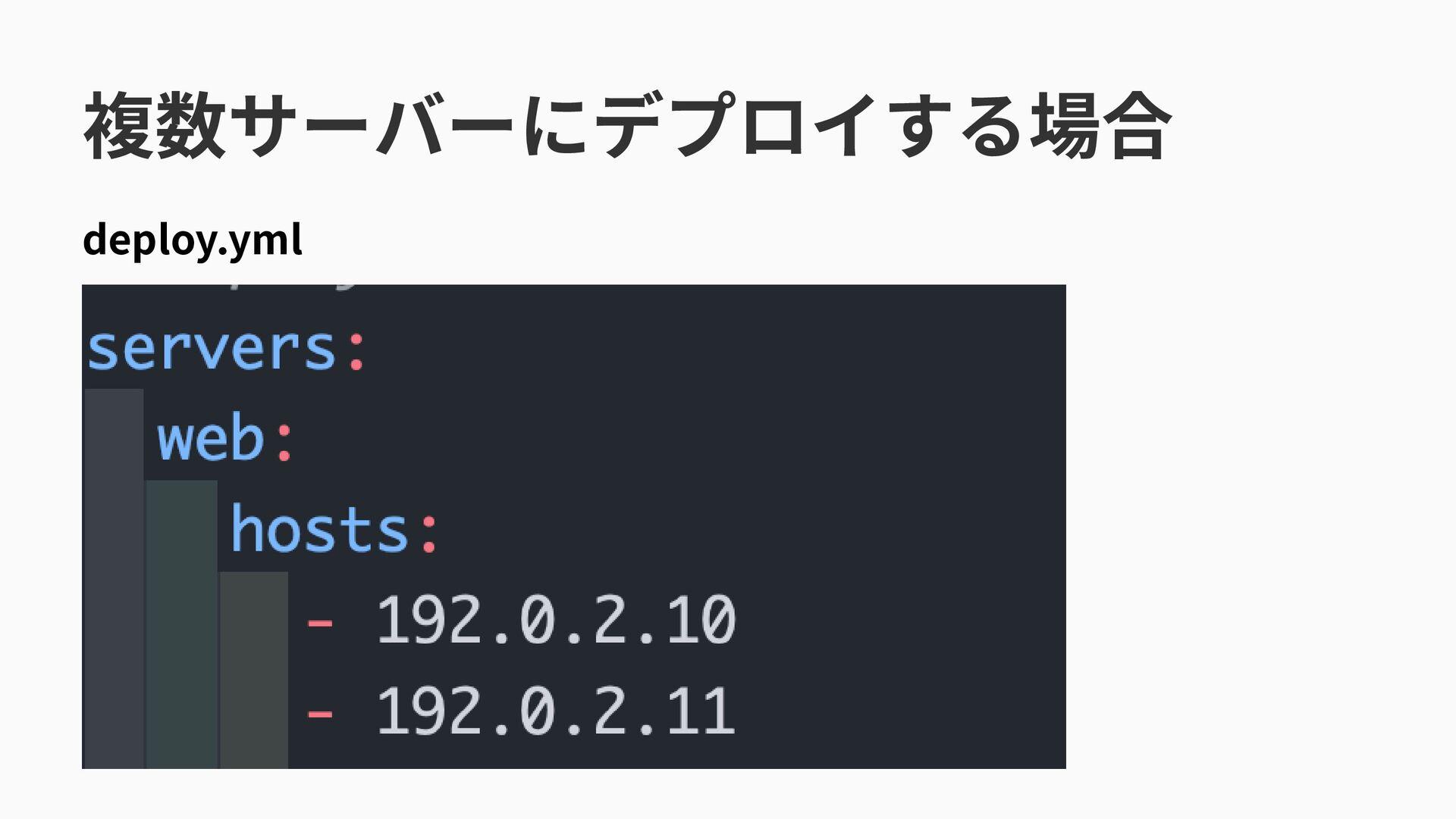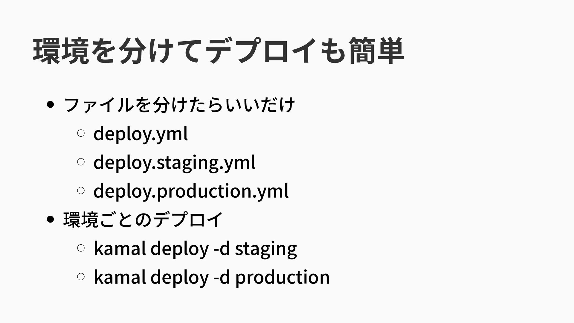 環境を分けてデプロイも簡単 ファイルを分けたらいいだけ deploy.yml deploy.staging.yml deploy.production.yml 環境ごとのデプロイ kamal deploy -d staging