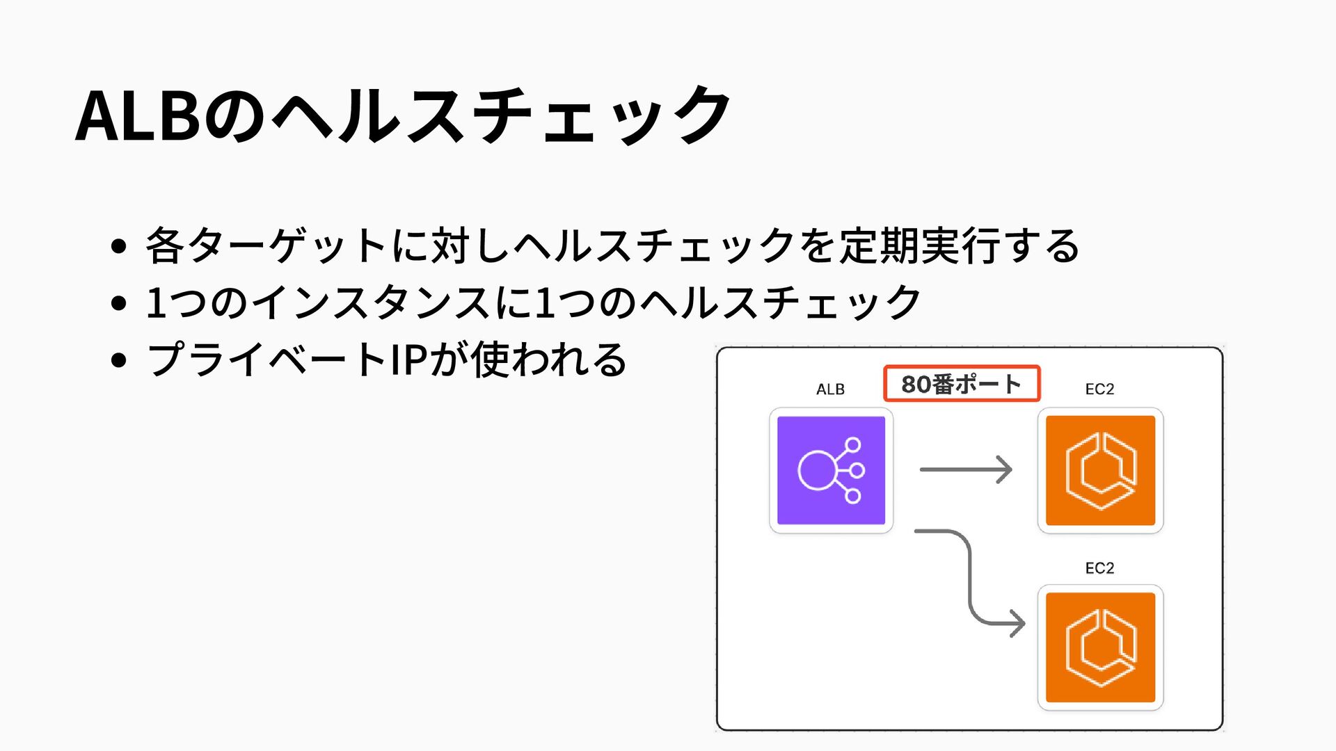 ALBのヘルスチェック 各ターゲットに対しヘルスチェックを定期実行する 1つのインスタンスに1つのヘルスチェック プライベートIPが使われる