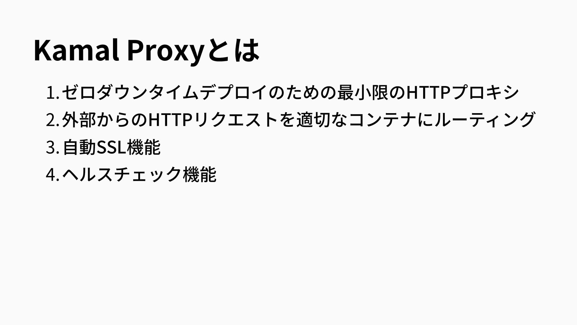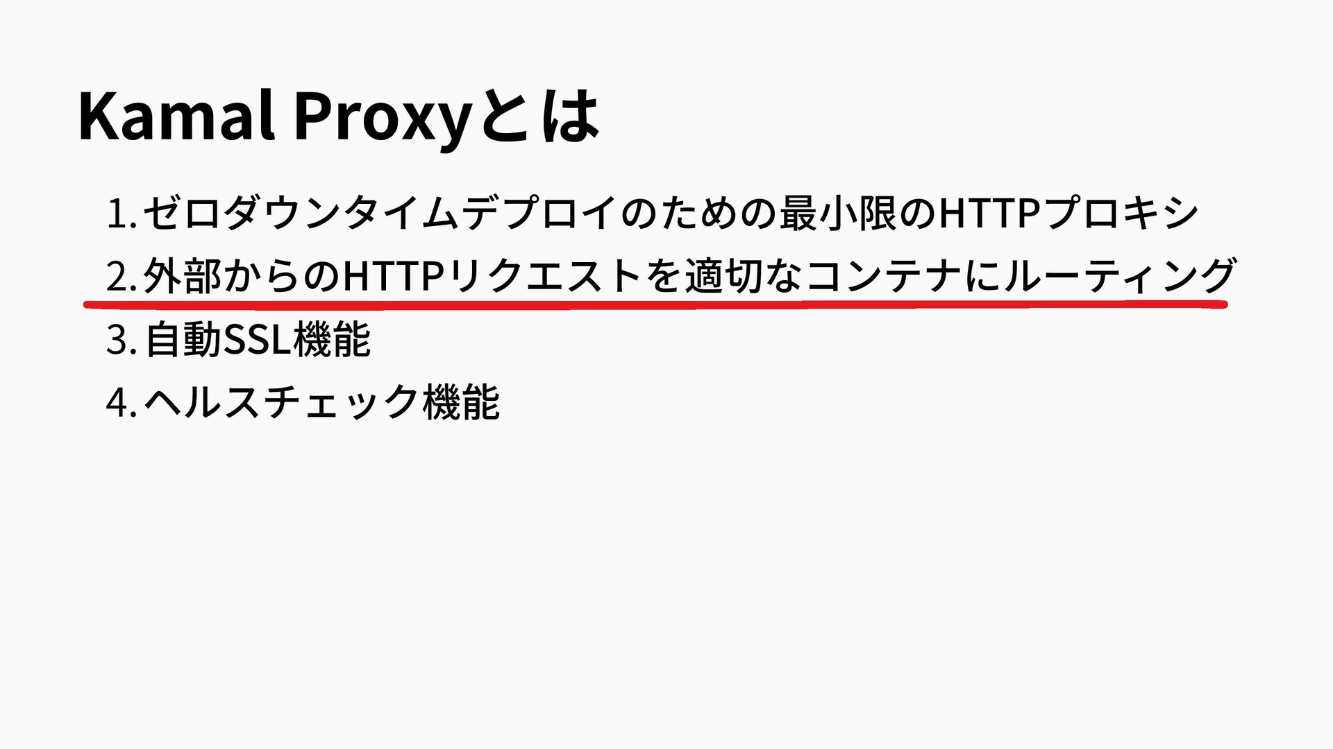 Kamal Proxyとは 1.ゼロダウンタイムデプロイのための最小限のHTTPプロキシ 2.外部からのHTTPリクエストを適切なコンテナにルーティング 3.自動SSL機能 4.ヘルスチェック機能