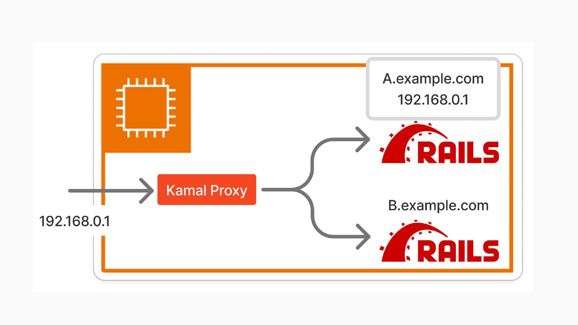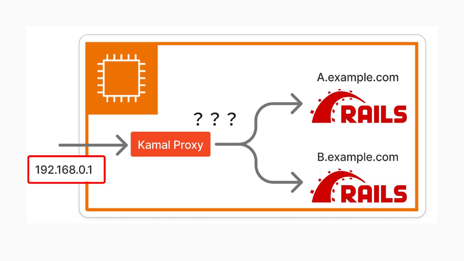 Kamal Proxyのリクエストの振り分け リクエストのホスト名を元にどのコンテナに リクエストを転送するか決めている