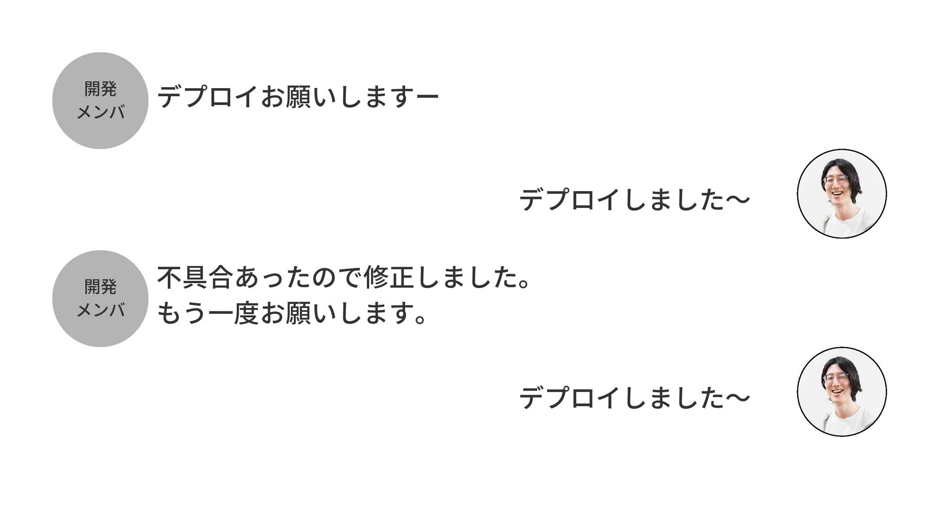 デプロイしました〜 開発 メンバ デプロイお願いしますー 開発 メンバ 不具合あったので修正しました。 もう一度お願いします。 デプロイしました〜
