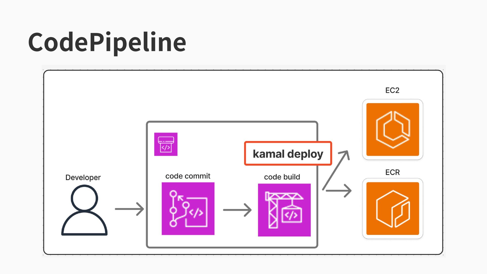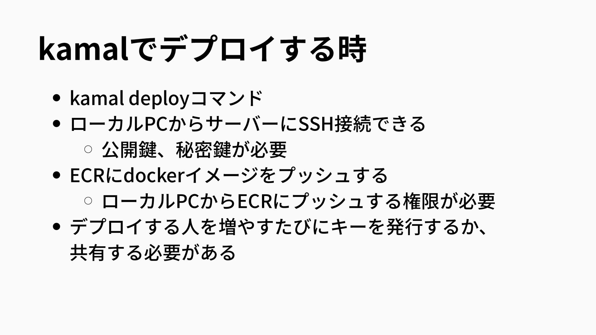 kamal deployコマンド ローカルPCからサーバーにSSH接続できる 公開鍵、秘密鍵が必要 ECRにdockerイメージをプッシュする ローカルPCからECRにプッシュする権限が必要 デプロイする人を増やすたびにキーを発行するか、 共有する必要がある kamalでデプロイする時
