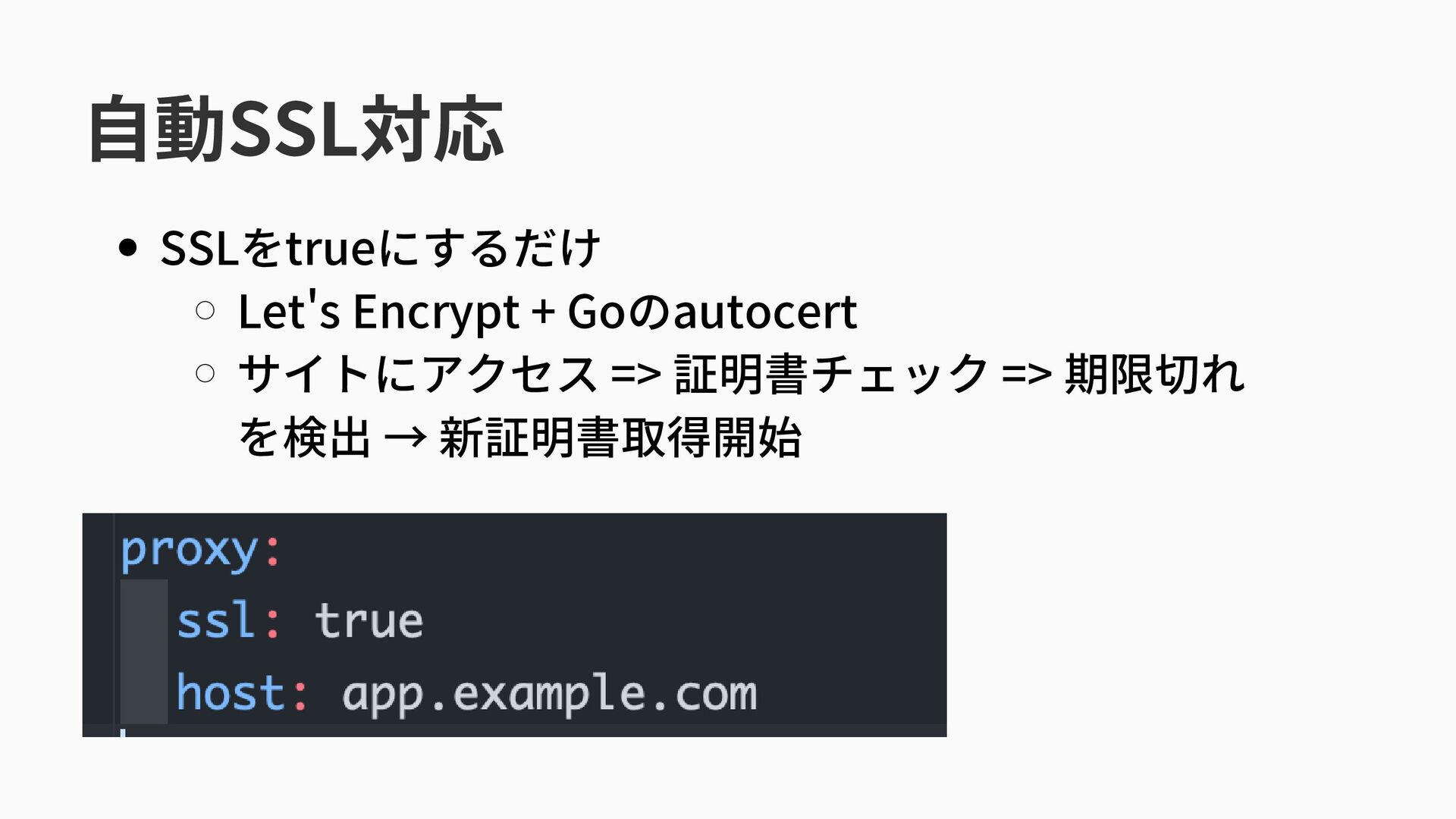 自動SSL対応 SSLをtrueにするだけ Let's Encrypt + Goのautocert サイトにアクセス => 証明書チェック =>