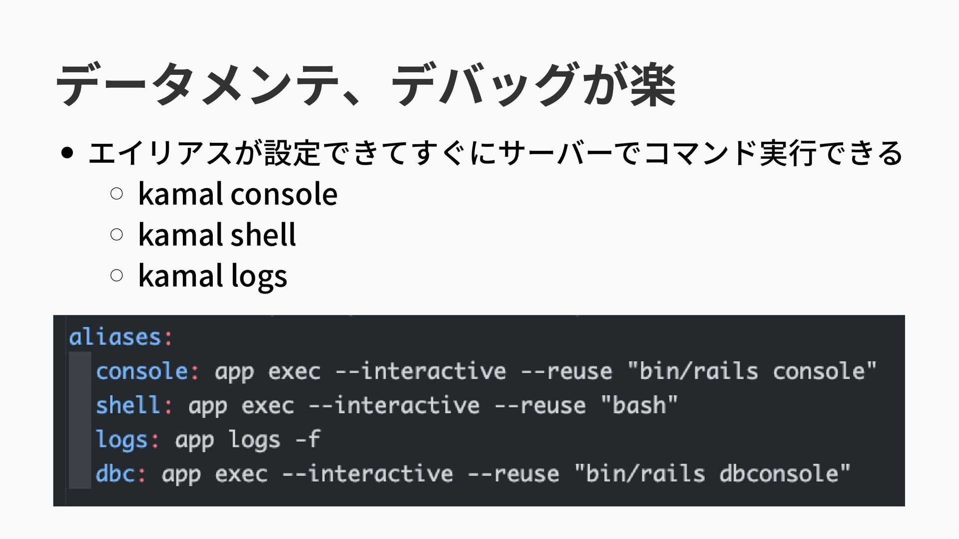 データメンテ、デバッグが楽 エイリアスが設定できてすぐにサーバーでコマンド実行できる kamal console kamal shell kamal logs