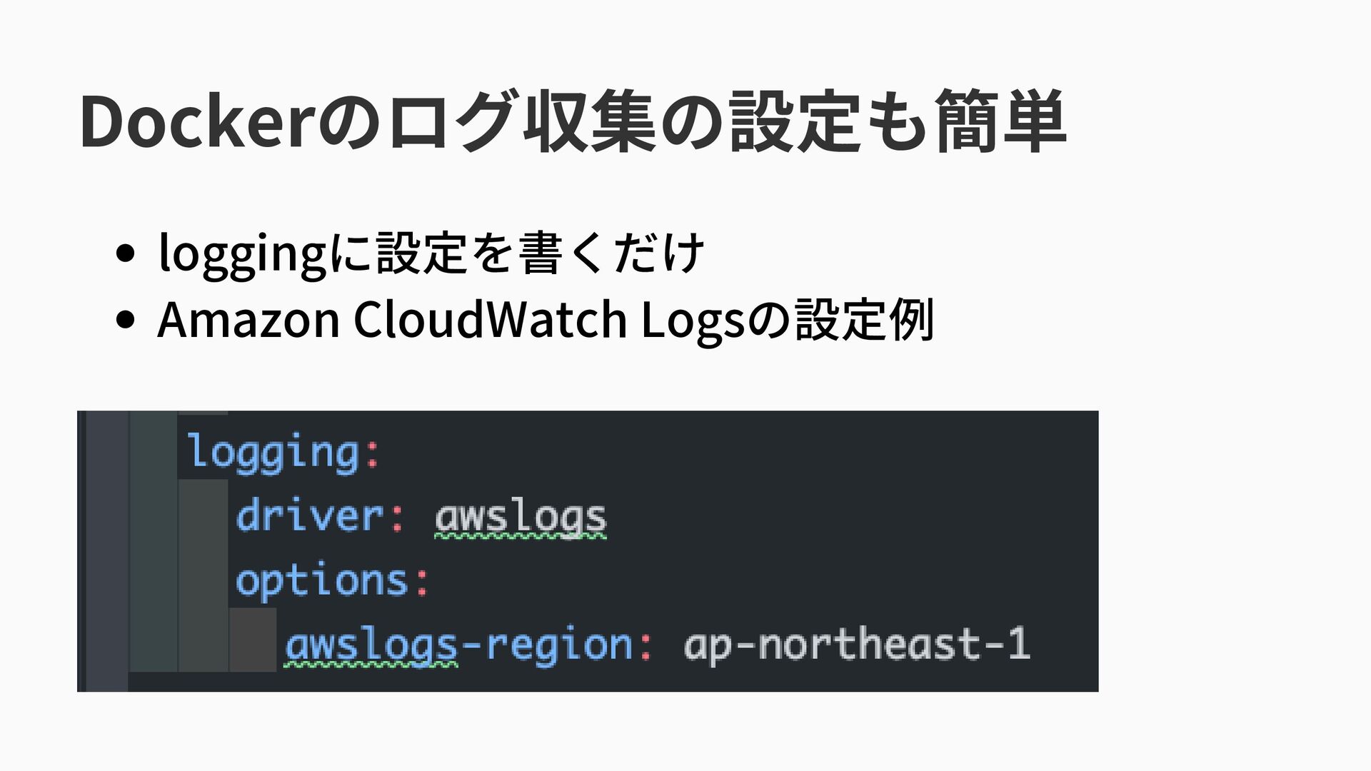 loggingに設定を書くだけ Amazon CloudWatch Logsの設定例 Dockerのログ収集の設定も簡単