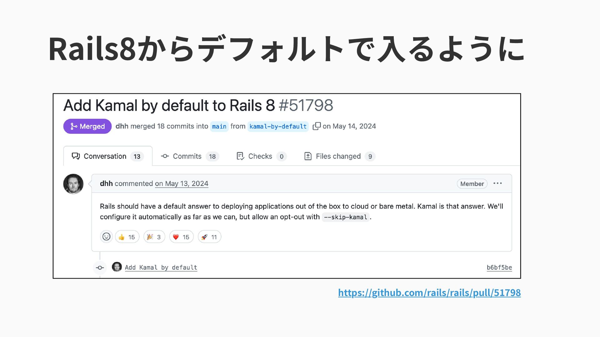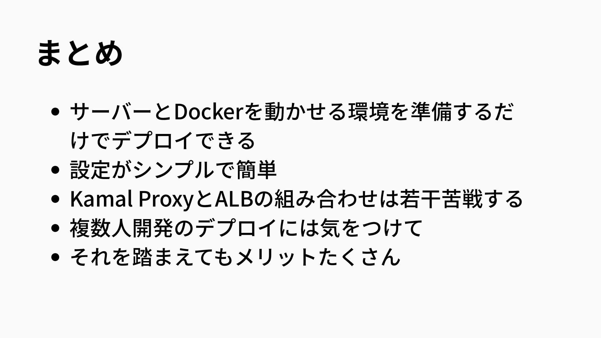 サーバーとDockerを動かせる環境を準備するだ けでデプロイできる 設定がシンプルで簡単 Kamal ProxyとALBの組み合わせは若干苦戦する 複数人開発のデプロイには気をつけて それを踏まえてもメリットたくさん まとめ