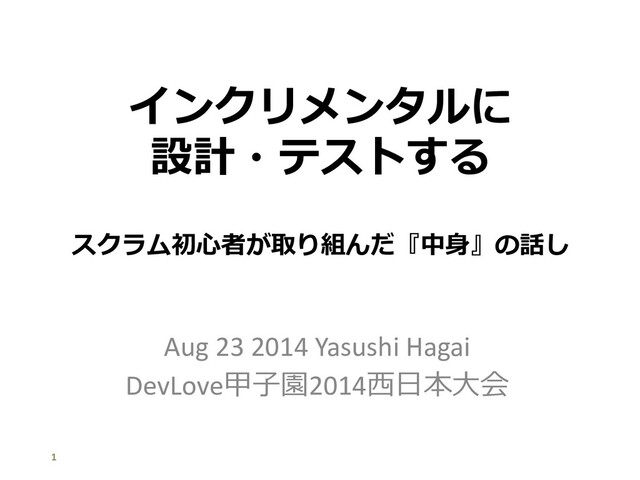 インクリメンタルに 設計・テストする Aug 23 2014 Yasushi Hagai DevLove甲⼦園2014⻄⽇本⼤会 1 スクラム初⼼者が取り組んだ『中⾝』の話し