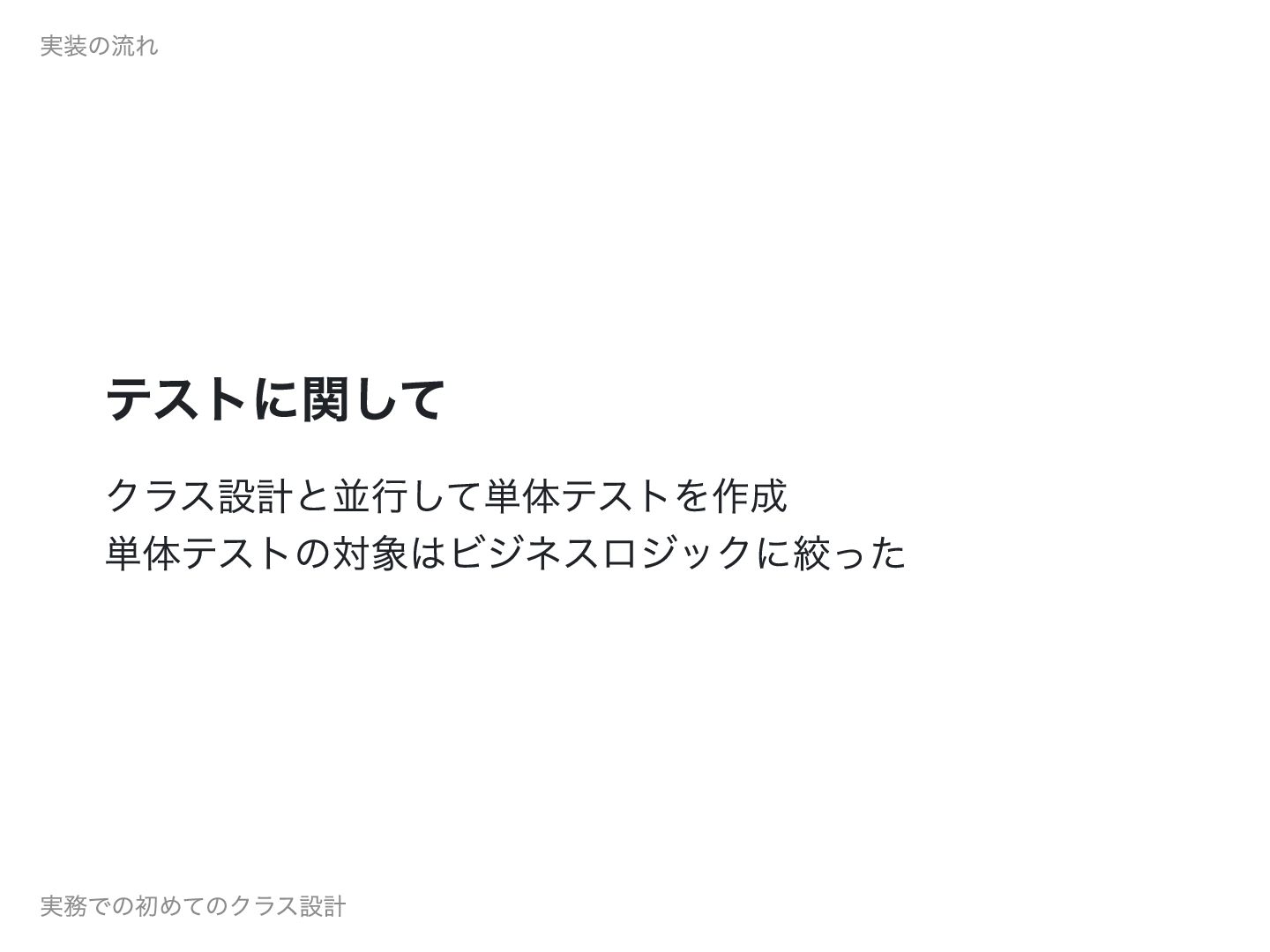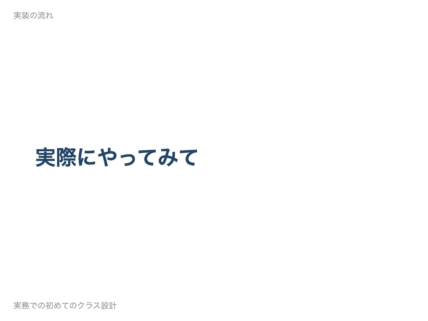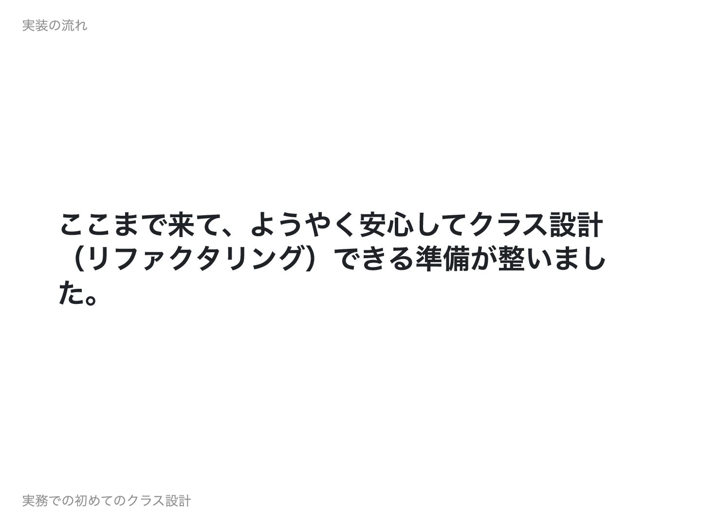 ここまで来て、ようやく安心してクラス設計 (リファクタリング)できる準備が整いまし た。 実装の流れ 実務での初めてのクラス設計