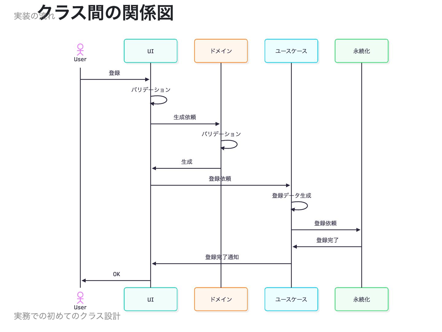 登録 バリデーション ⽣成依頼 バリデーション ⽣成 登録依頼 登録データ⽣成 登録依頼 登録完了 登録完了通知 OK User 実装の流れ 実務での初めてのクラス設計