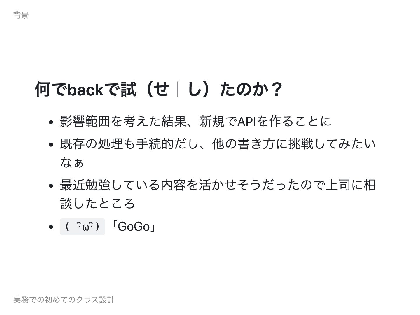 何でbackで試(せ|し)たのか? 影響範囲を考えた結果、新規でAPIを作ることに 既存の処理も手続的だし、他の書き方に挑戦してみたい なぁ 最近勉強している内容を活かせそうだったので上司に相 談したところ ( ・ิω・ิ) 「GoGo」 背景