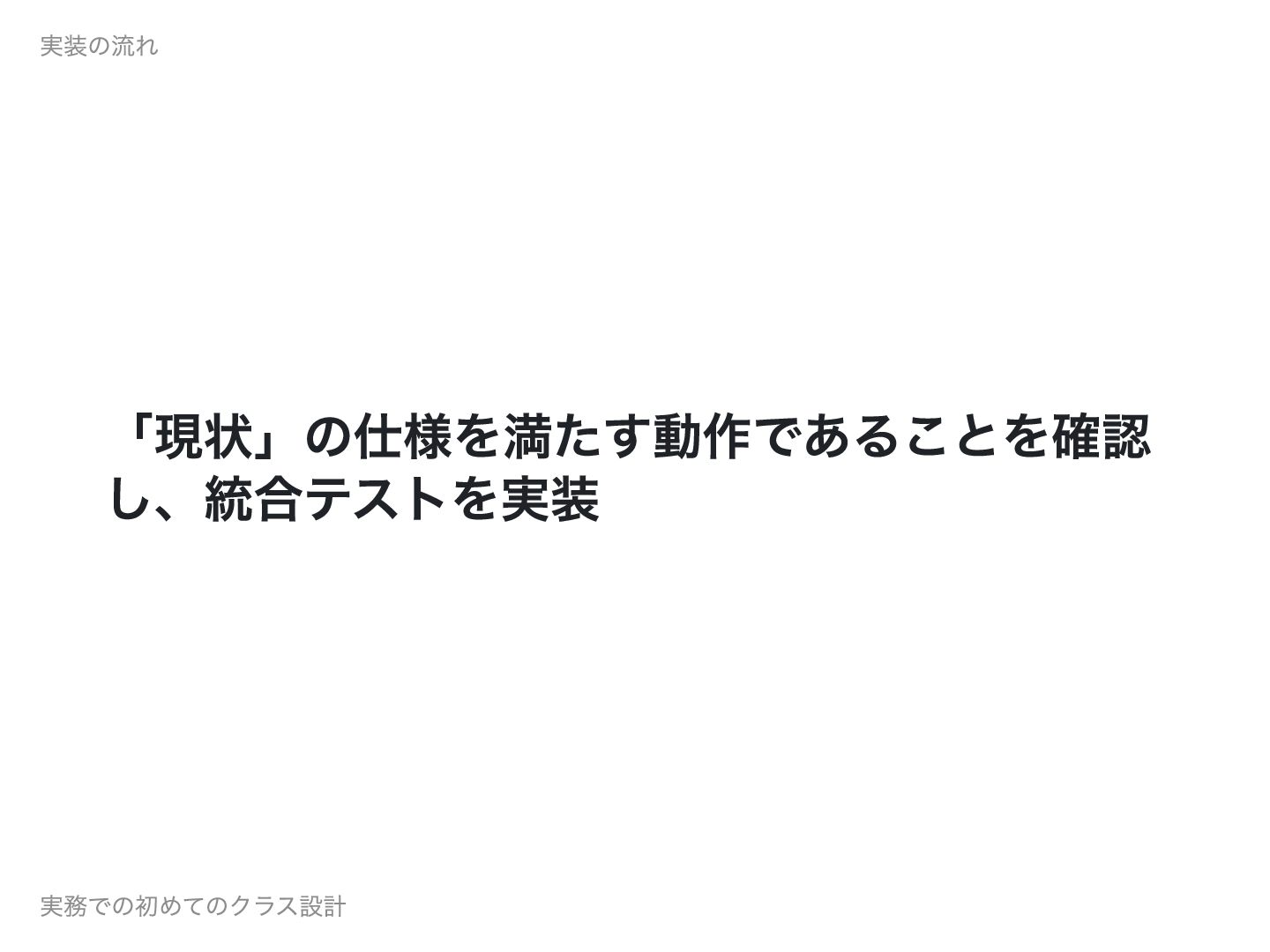 「現状」の仕様を満たす動作であることを確認 し、統合テストを実装 実装の流れ 実務での初めてのクラス設計