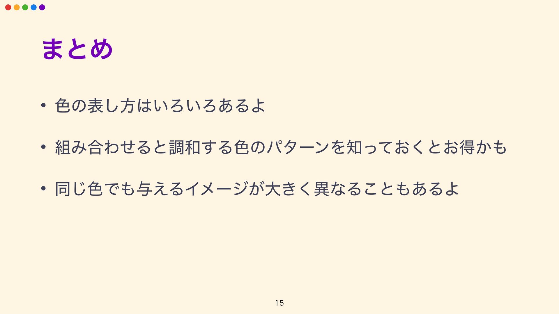 ·ͱΊ • ৭ͷද͠ํ͍Ζ͍Ζ͋ΔΑ • Έ߹ΘͤΔͱௐ͢Δ৭ͷύλʔϯΛ͓ͬͯ͘ͱ͓ಘ͔ • ಉ͡৭Ͱ༩͑ΔΠϝʔδ͕େ͖͘ҟͳΔ͜ͱ͋ΔΑ