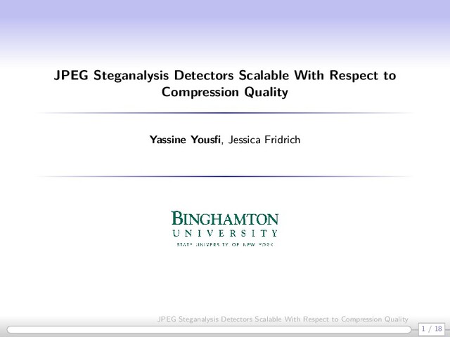 ordinary looking cover objects Focus on image objects because they contain many indeterministic components: acquisition conditions, development, post-processing, editing, and even sharing Images can have multiple formats: JPEG, GIF, PNG, etc. Secret messages are embedded by introducing noise looking signal to the image Can be content adaptive, e.g. taking advantage of textured regions, edges, etc. 2 / 18 JPEG Steganalysis Detectors Scalable With Respect to Compression Quality