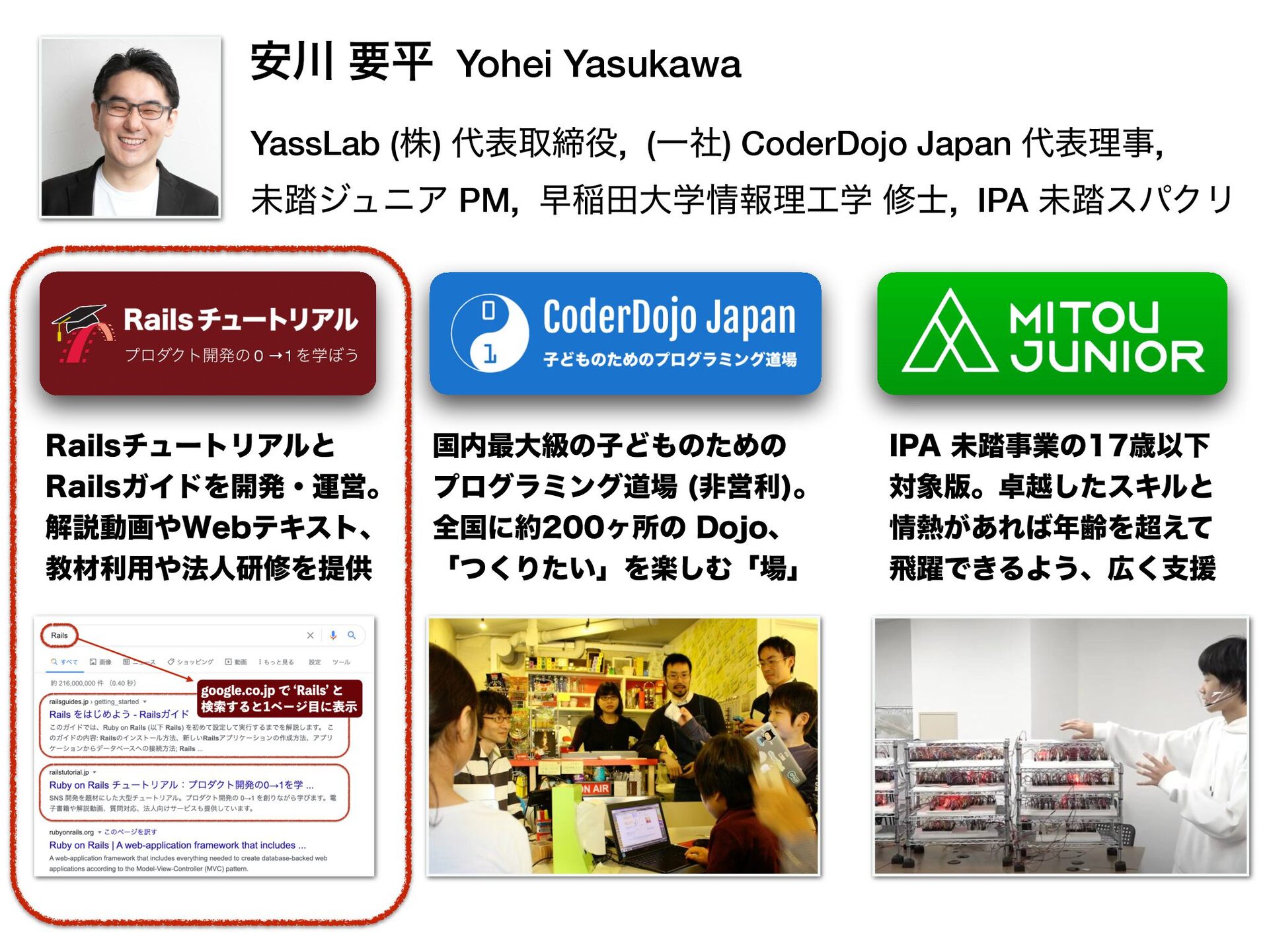 3BJMTνϡʔτϦΞϧͱ 3BJMTΨΠυΛ։ൃɾӡӦɻ ղઆಈը΍8FCςΩετɺ ڭࡐར༻΍๏ਓݚमΛఏڙ ҆઒ ཁฏ Yohei Yasukawa YassLab (ג) ୅දऔక໾, (Ұࣾ) CoderDojo Japan ୅දཧࣄ, ະ౿δϡχΞ PM, ૣҴాେֶ৘ใཧ޻ֶ म࢜, IPA ະ౿εύΫϦ ϓϩμΫτ։ൃͷ 0 →1 Λֶ΅͏
