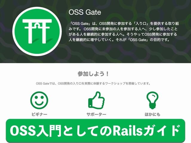 OSS Gate は、オープンソースソフトウェア (OSS) 開発に参加する「入り口」を提供する取り組みです。詳細は次の公式サイトからご確認いただけます。