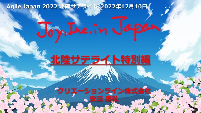 なぜ僕らが”喜び(Joy)”を大切にするようになったのか?それは一度会社自体がほぼ崩壊したことがきっかけでした。そのことをきっかけに僕自身が変わりたいと心から願い、「みんなが”Joy”を感じることができる職場」を創ることを目指して日々探索と実験を繰り返しています。それぞれの人間が思い描くより良い世界を創り出すために努力した結果として得られる充実感/昂揚感が“喜び(Joy)“だと僕は理解しています。 僕らはこの”Joy”という思考を大切にしながらXP、スクラムなどのアジャイルプラクティスを組織にインストールしていくことで、事業的に成長させ、その取り組みを、色々な顧客と共に発展させてきました。僕らの組織をより良くするために試行錯誤している実例をきっかけに、みなさんの世界(会社、組織、チーム、顧客)をより良くするための探索と実験の旅がスタートすることを願っています。 今回は、北陸サテライト特別編として僕らの北陸での活動や、昨年11月のAgile Japan 2021での基調講演以後の取り組みについてもみなさんと共有する予定です。