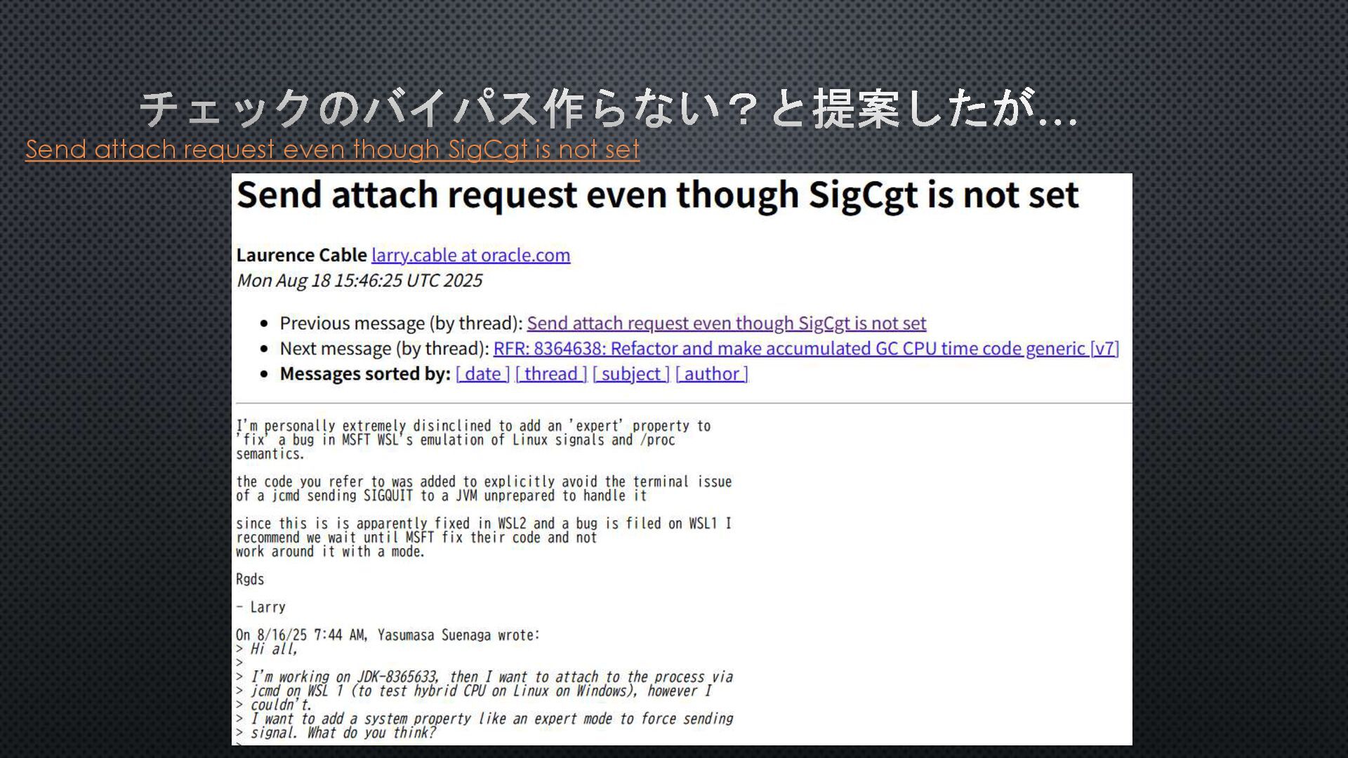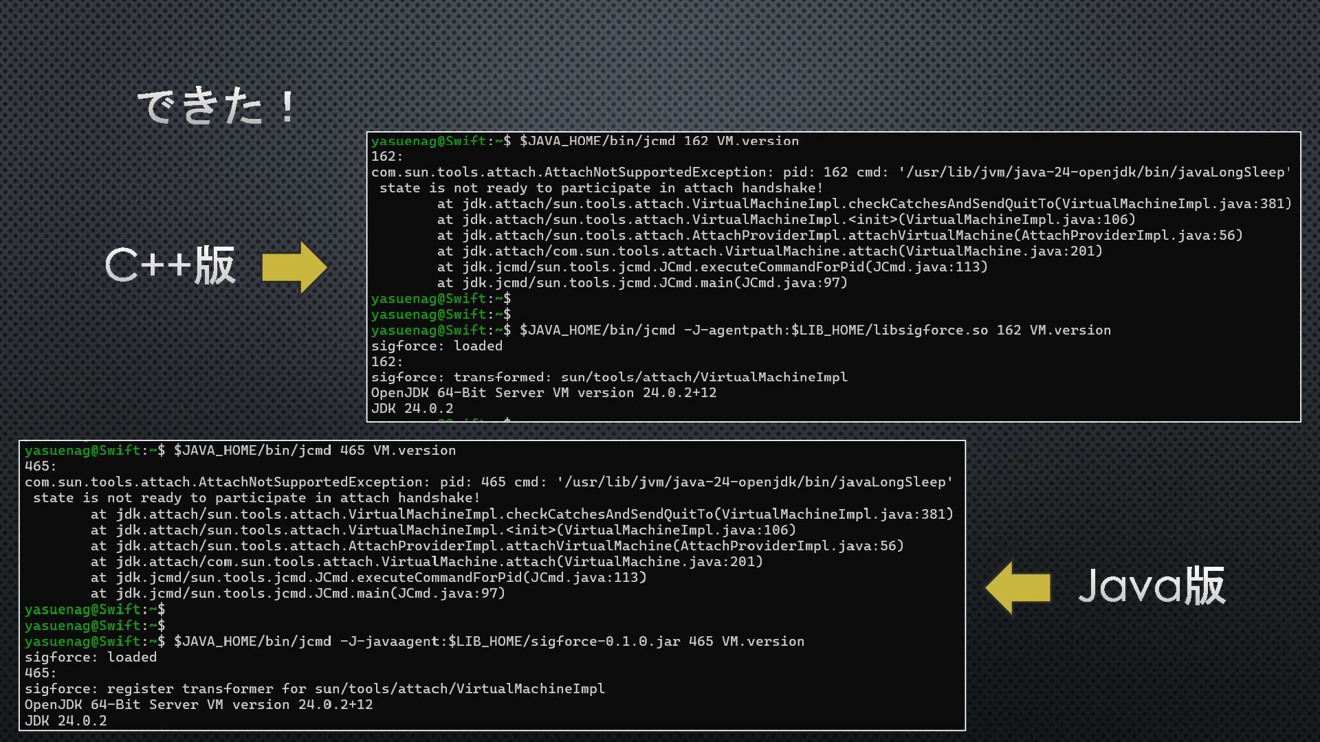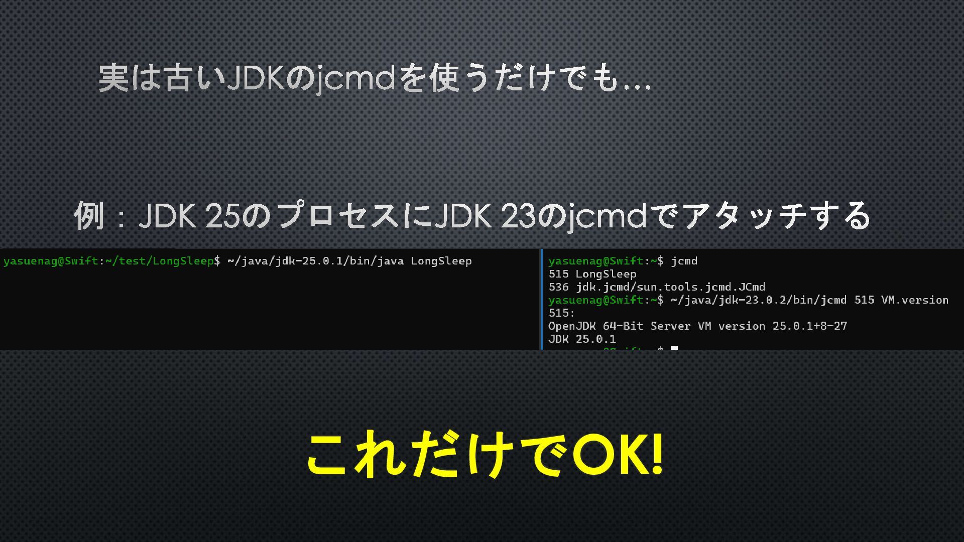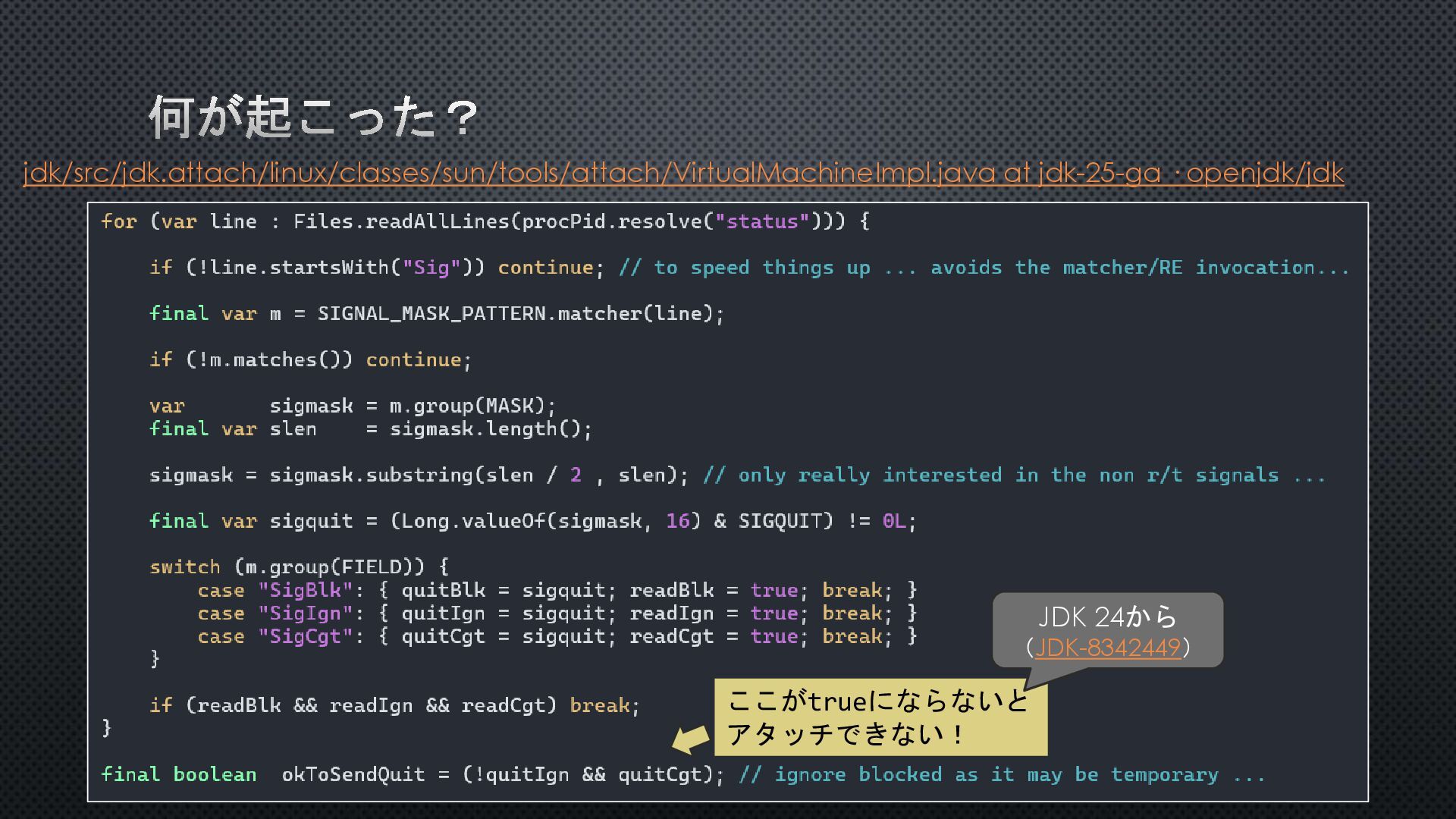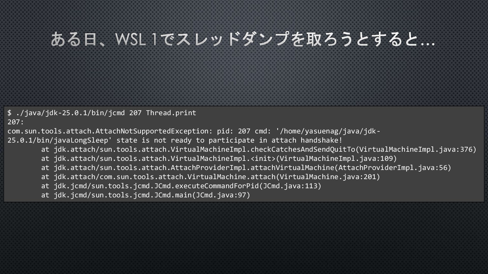 cmd: '/home/yasuenag/java/jdk- 25.0.1/bin/javaLongSleep' state is not ready to participate in attach handshake! at jdk.attach/sun.tools.attach.VirtualMachineImpl.checkCatchesAndSendQuitTo(VirtualMachineImpl.java:376) at jdk.attach/sun.tools.attach.VirtualMachineImpl.<init>(VirtualMachineImpl.java:109) at jdk.attach/sun.tools.attach.AttachProviderImpl.attachVirtualMachine(AttachProviderImpl.java:56) at jdk.attach/com.sun.tools.attach.VirtualMachine.attach(VirtualMachine.java:201) at jdk.jcmd/sun.tools.jcmd.JCmd.executeCommandForPid(JCmd.java:113) at jdk.jcmd/sun.tools.jcmd.JCmd.main(JCmd.java:97)