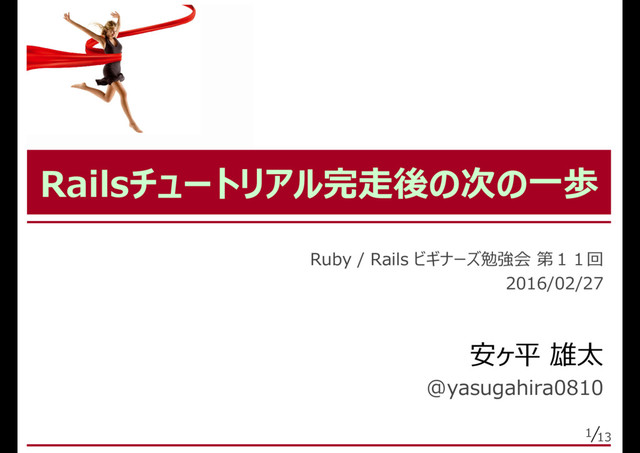 1 13 Railsチュートリアル完走後の次の一歩 Ruby / Rails ビギナーズ勉強会 第11回 2016/02/27 安ヶ平