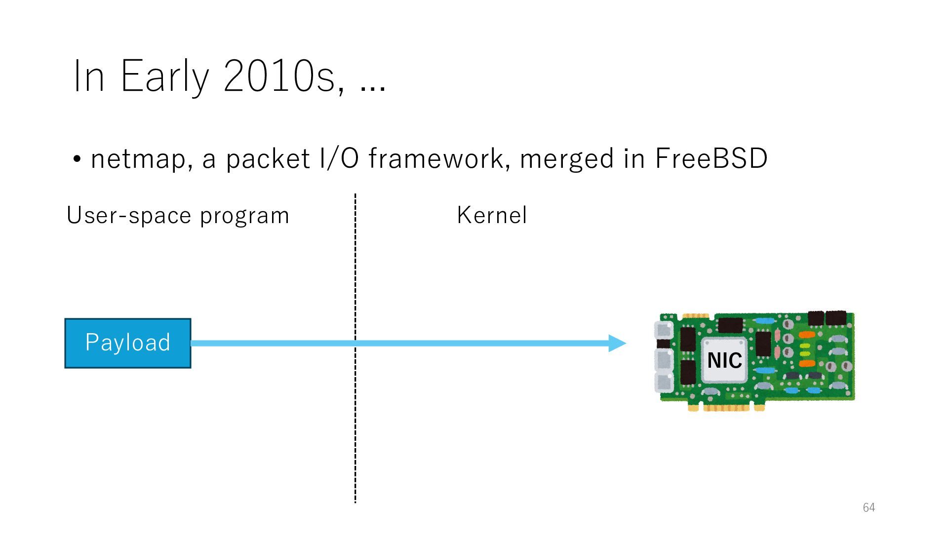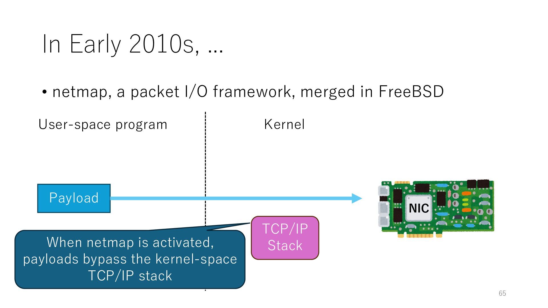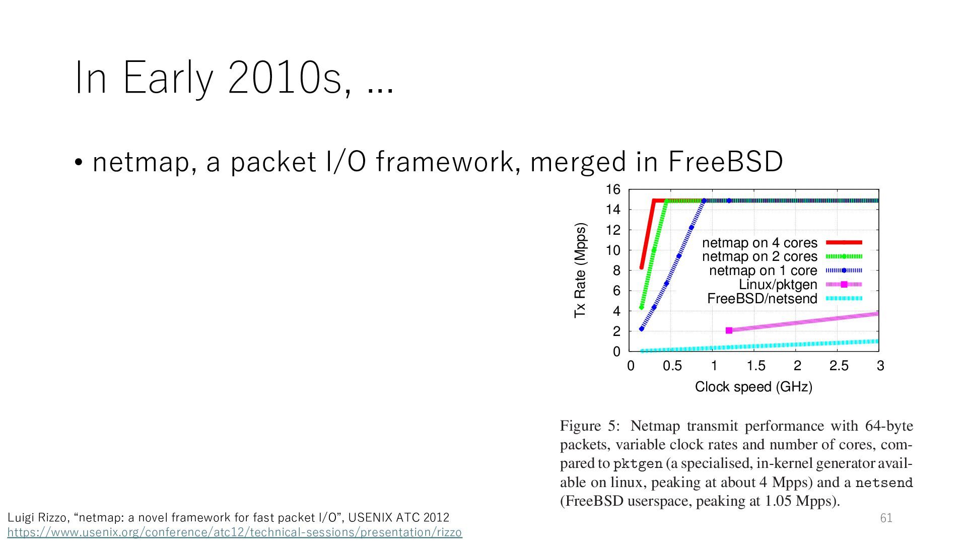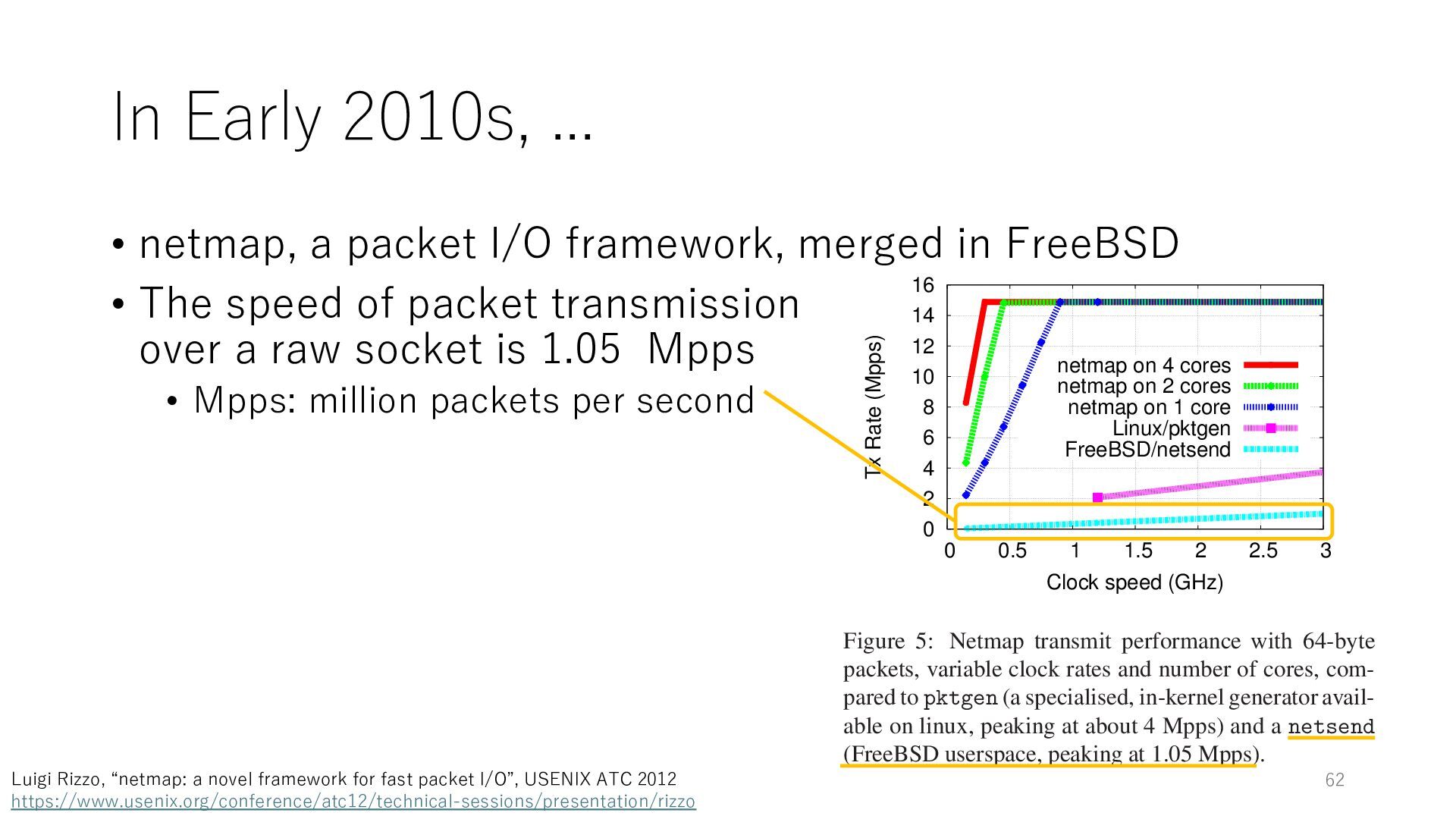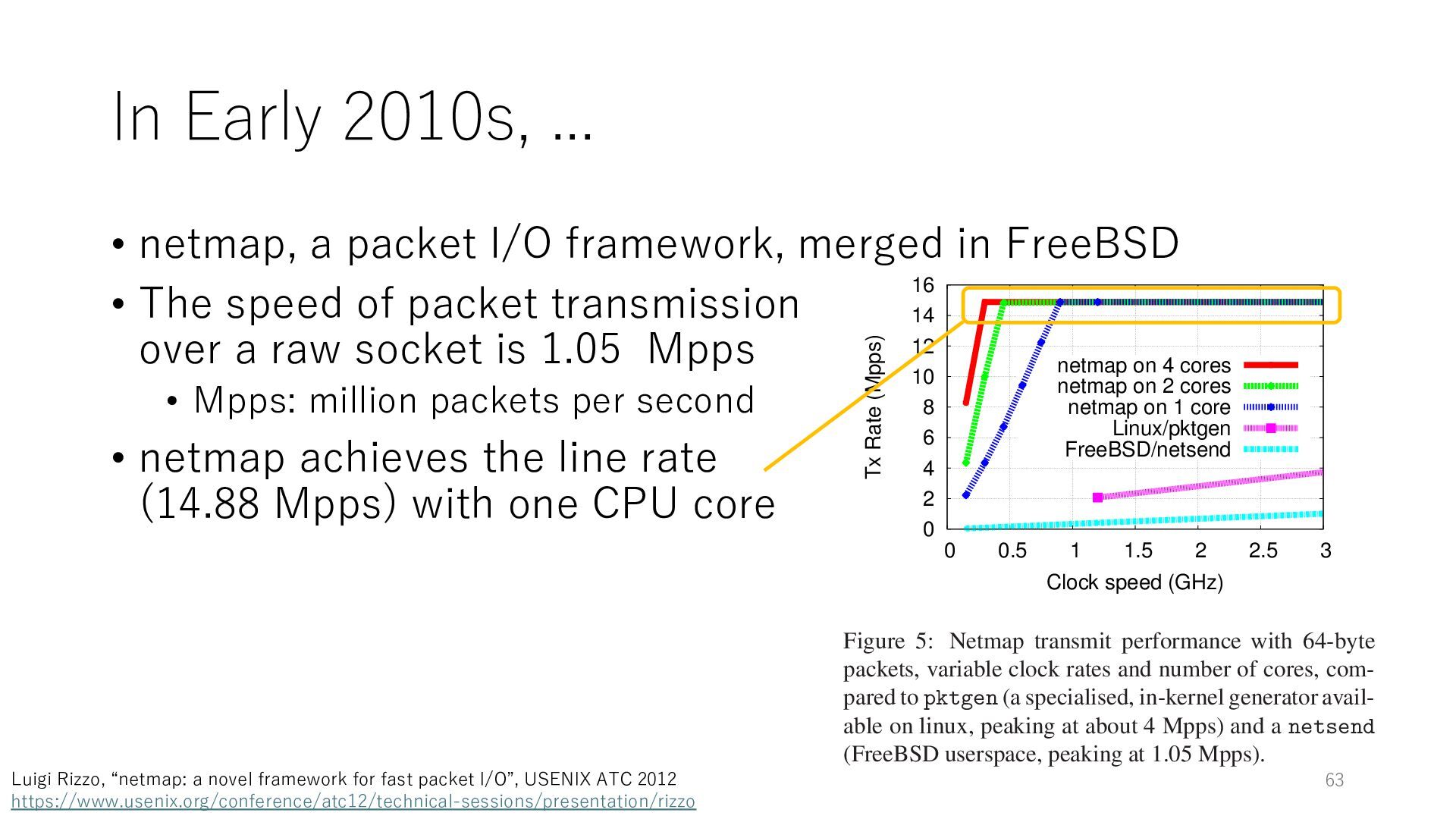 merged in FreeBSD • The speed of packet transmission over a raw socket is 1.05 Mpps • Mpps: million packets per second • netmap achieves the line rate (14.88 Mpps) with one CPU core application costs almost negligible: a packet generator which streams pre-generated packets, and a packet re- ceiver which just counts incoming packets. 5.2 Test equipment We have run most of our experiments on systems equipped with an i7-870 4-core CPU at 2.93 GHz (3.2 GHz with turbo-boost), memory running at 1.33 GHz, and a dual port 10 Gbit/s card based on the Intel 82599 NIC. The numbers reported in this paper refer to the netmap version in FreeBSD HEAD/amd64 as of April 2012. Experiments have been run using di- rectly connected cards on two similar systems. Results are highly repeatable (within 2% or less) so we do not report confidence intervals in the tables and graphs. netmap is extremely efficient so it saturates a 10 Gbit/s interface even at the maximum packet rate, and we need to run the system at reduced clock speeds to determine 0 2 4 6 8 10 12 14 16 0 0.5 1 1.5 2 2.5 3 Tx Rate (Mpps) Clock speed (GHz) netmap on 4 cores netmap on 2 cores netmap on 1 core Linux/pktgen FreeBSD/netsend Figure 5: Netmap transmit performance with 64-byte packets, variable clock rates and number of cores, com- pared to pktgen (a specialised, in-kernel generator avail- able on linux, peaking at about 4 Mpps) and a netsend (FreeBSD userspace, peaking at 1.05 Mpps). 63 Luigi Rizzo, “netmap: a novel framework for fast packet I/O”, USENIX ATC 2012 https://www.usenix.org/conference/atc12/technical-sessions/presentation/rizzo