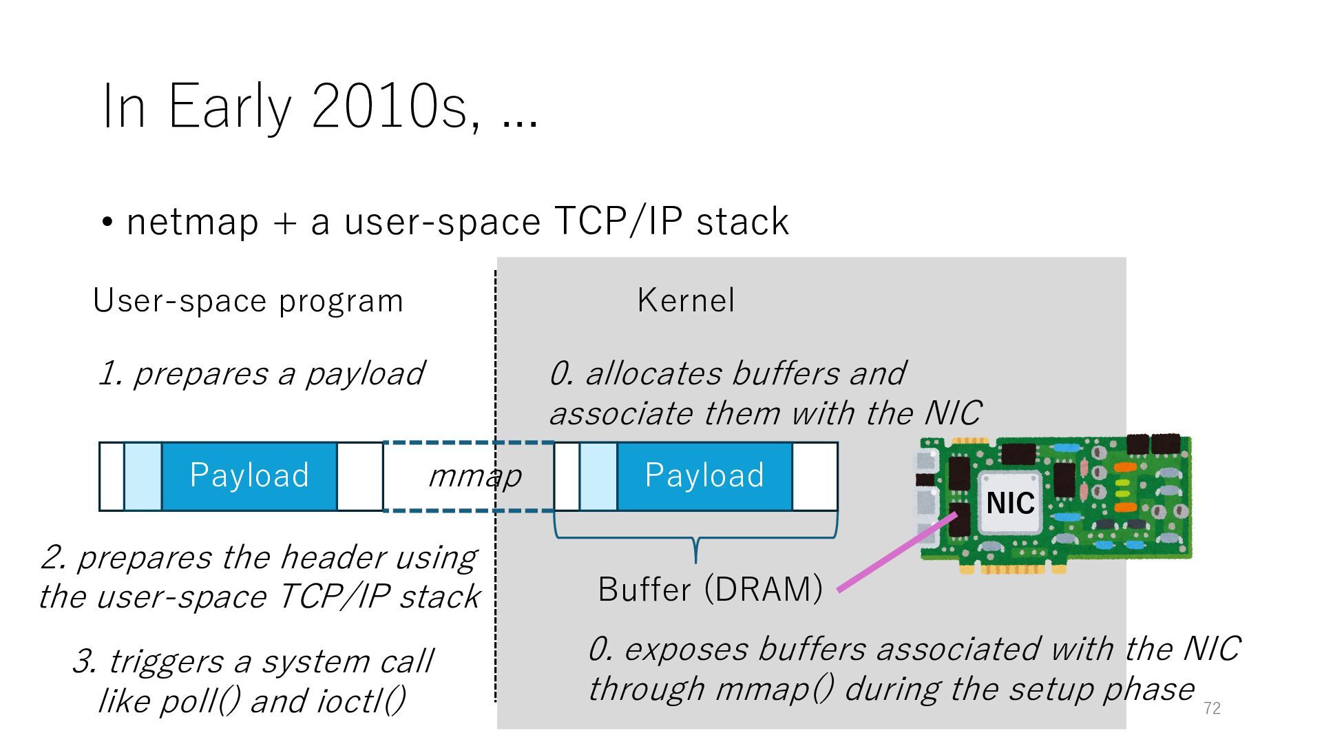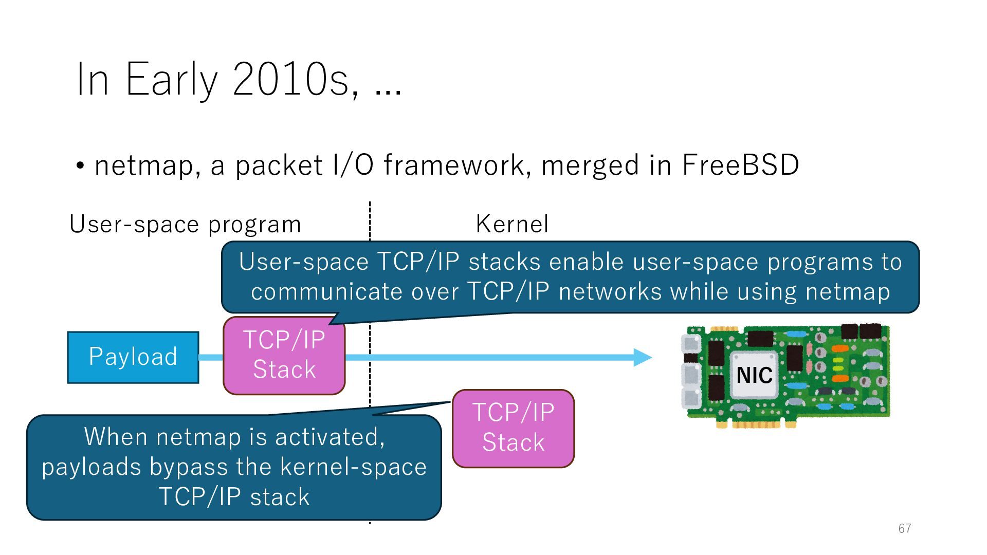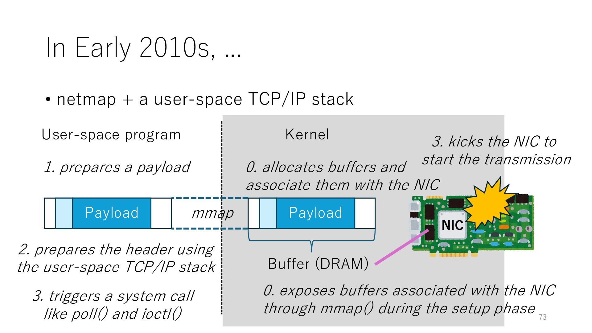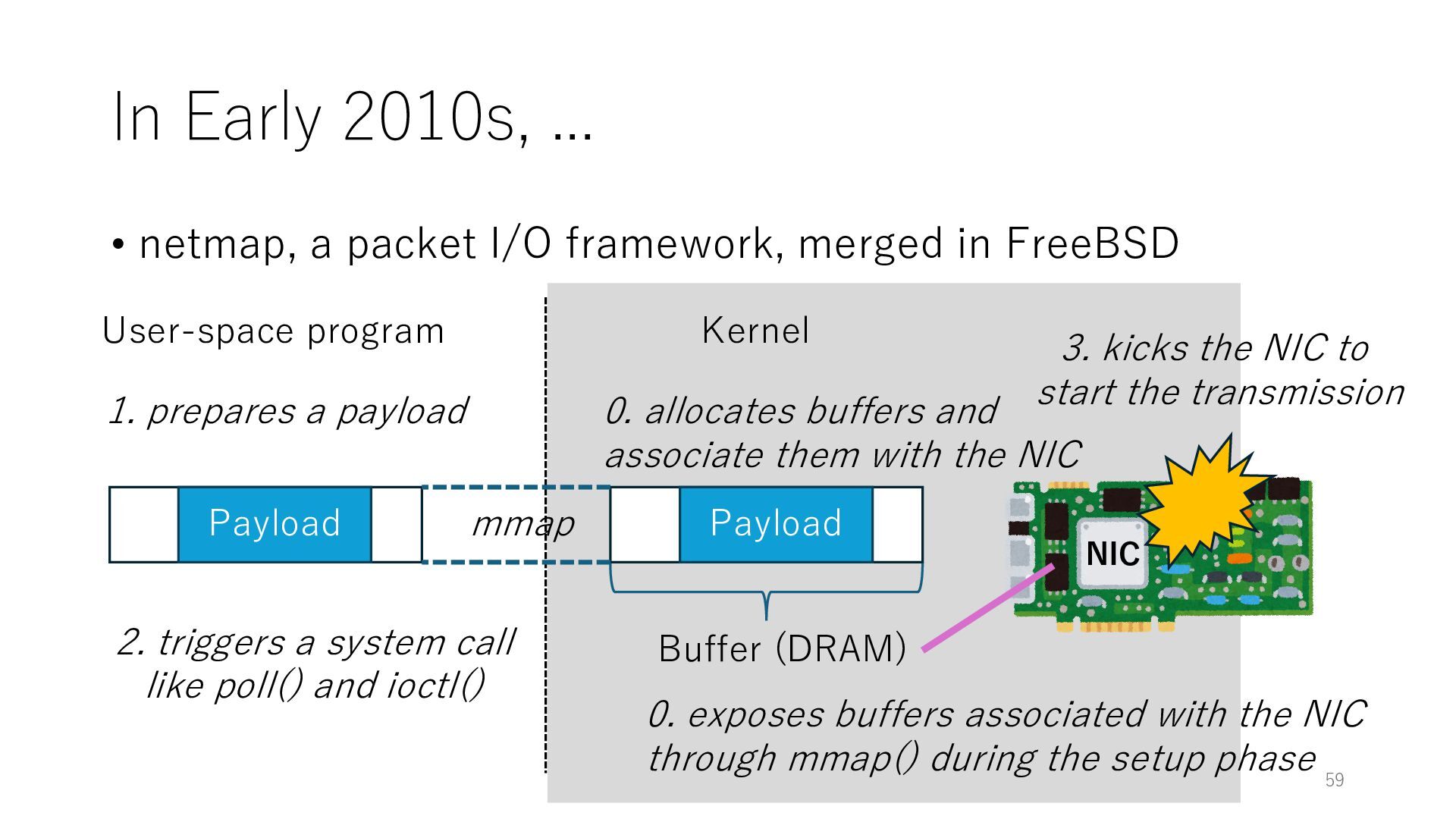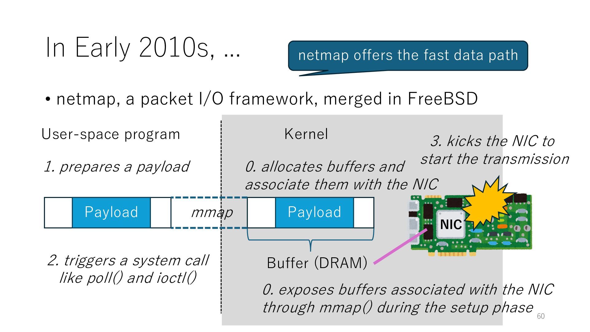 merged in FreeBSD • The speed of packet transmission over a raw socket is 1.05 Mpps • Mpps: million packets per second • netmap achieves the line rate (14.88 Mpps) with one CPU core application costs almost negligible: a packet generator which streams pre-generated packets, and a packet re- ceiver which just counts incoming packets. 5.2 Test equipment We have run most of our experiments on systems equipped with an i7-870 4-core CPU at 2.93 GHz (3.2 GHz with turbo-boost), memory running at 1.33 GHz, and a dual port 10 Gbit/s card based on the Intel 82599 NIC. The numbers reported in this paper refer to the netmap version in FreeBSD HEAD/amd64 as of April 2012. Experiments have been run using di- rectly connected cards on two similar systems. Results are highly repeatable (within 2% or less) so we do not report confidence intervals in the tables and graphs. netmap is extremely efficient so it saturates a 10 Gbit/s interface even at the maximum packet rate, and we need to run the system at reduced clock speeds to determine 0 2 4 6 8 10 12 14 16 0 0.5 1 1.5 2 2.5 3 Tx Rate (Mpps) Clock speed (GHz) netmap on 4 cores netmap on 2 cores netmap on 1 core Linux/pktgen FreeBSD/netsend Figure 5: Netmap transmit performance with 64-byte packets, variable clock rates and number of cores, com- pared to pktgen (a specialised, in-kernel generator avail- able on linux, peaking at about 4 Mpps) and a netsend (FreeBSD userspace, peaking at 1.05 Mpps). 63 Luigi Rizzo, “netmap: a novel framework for fast packet I/O”, USENIX ATC 2012 https://www.usenix.org/conference/atc12/technical-sessions/presentation/rizzo