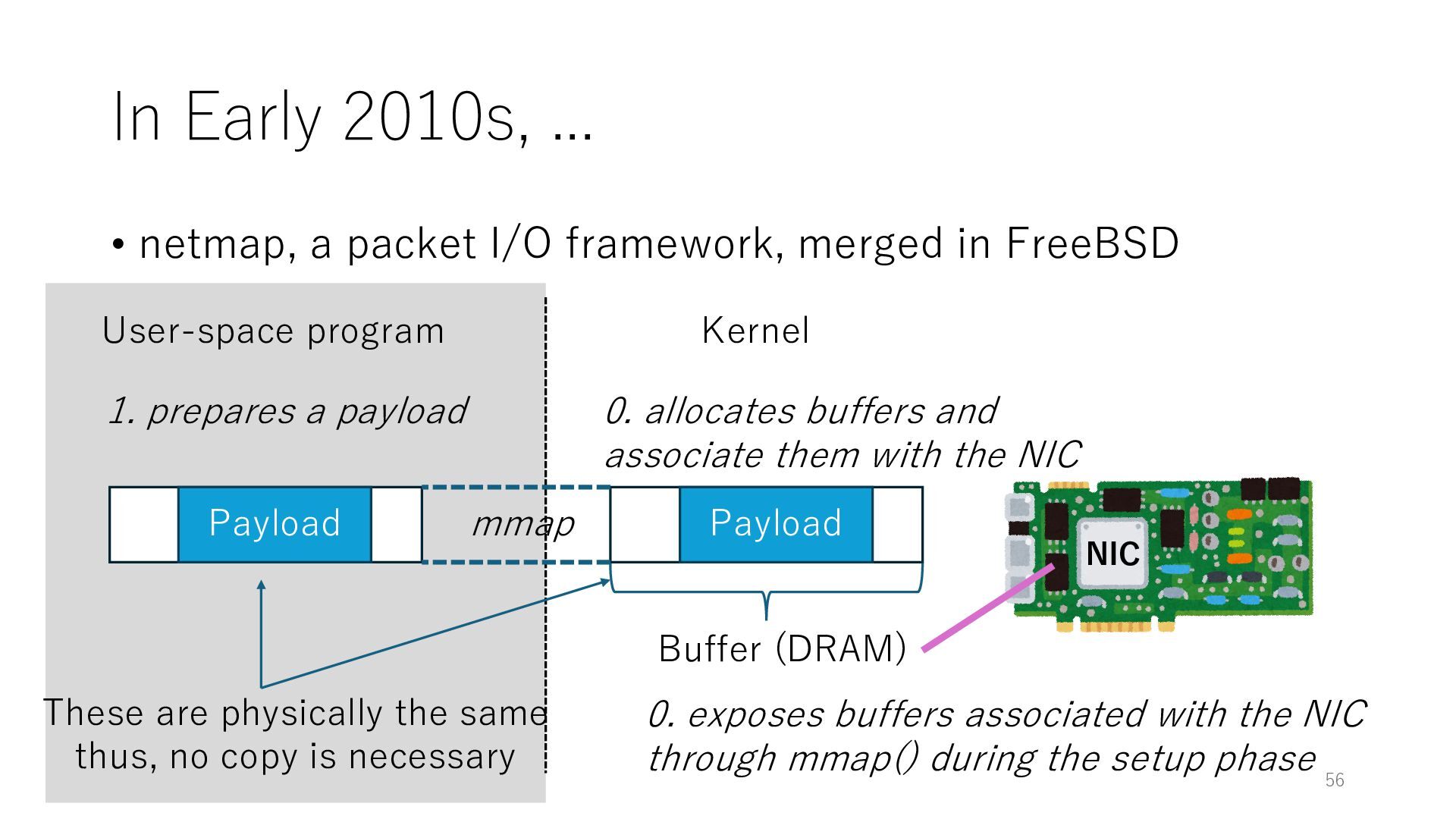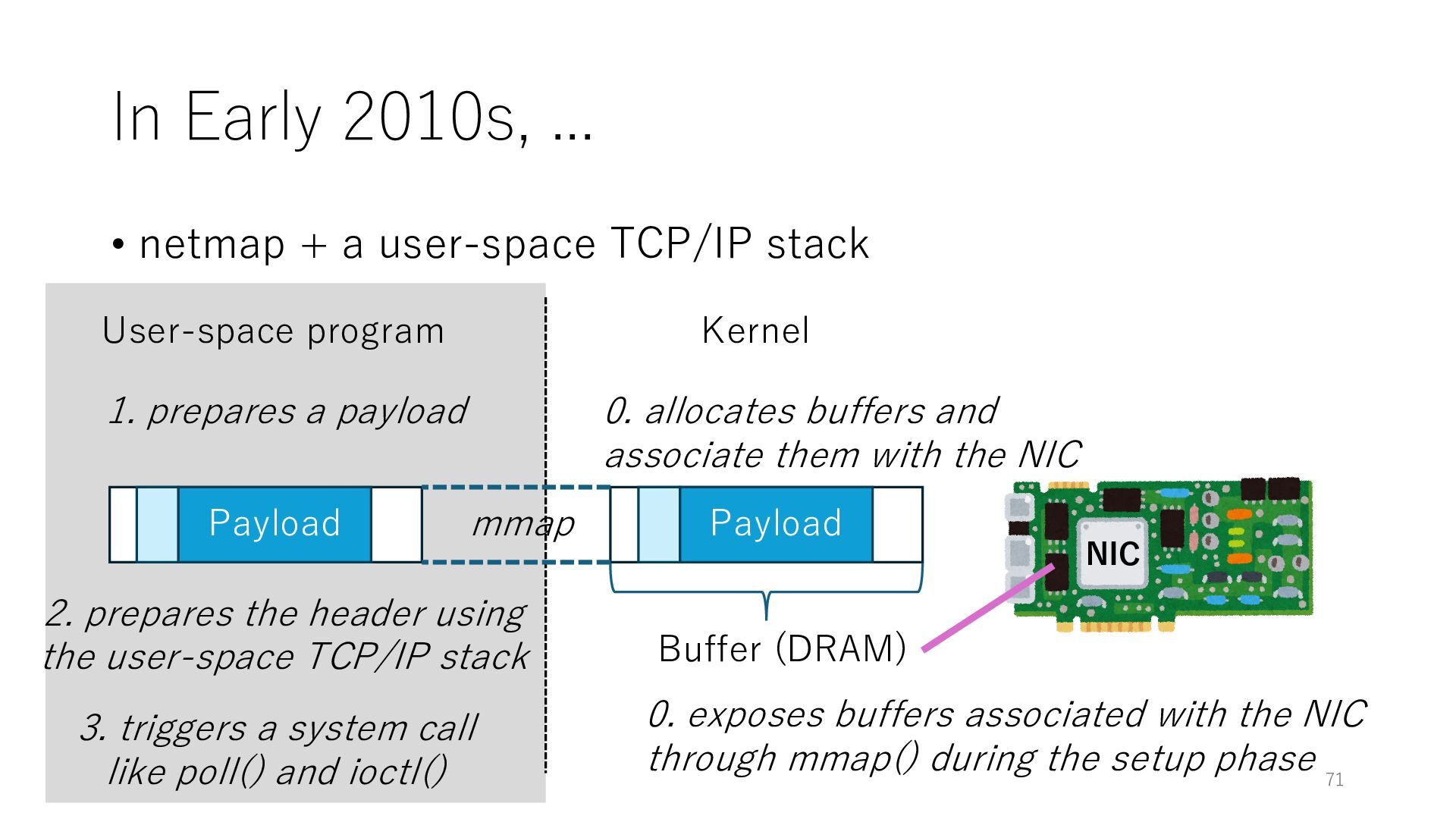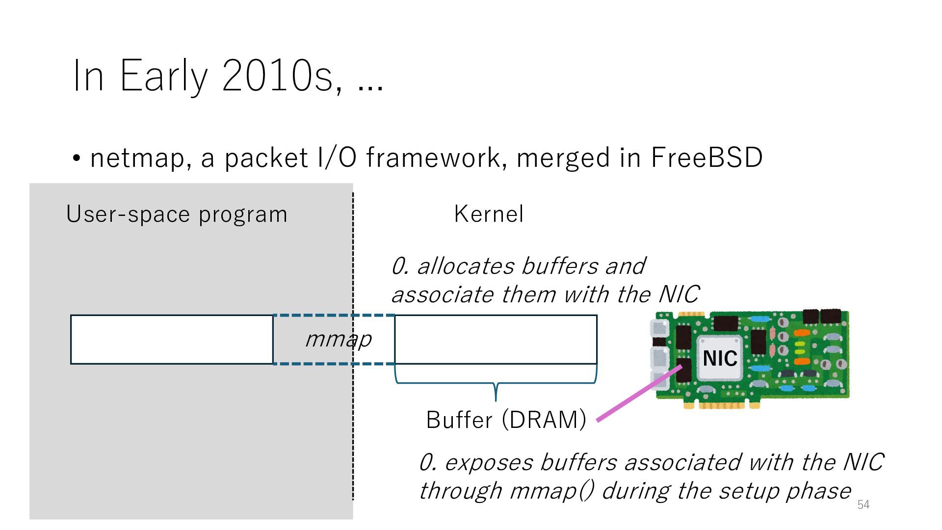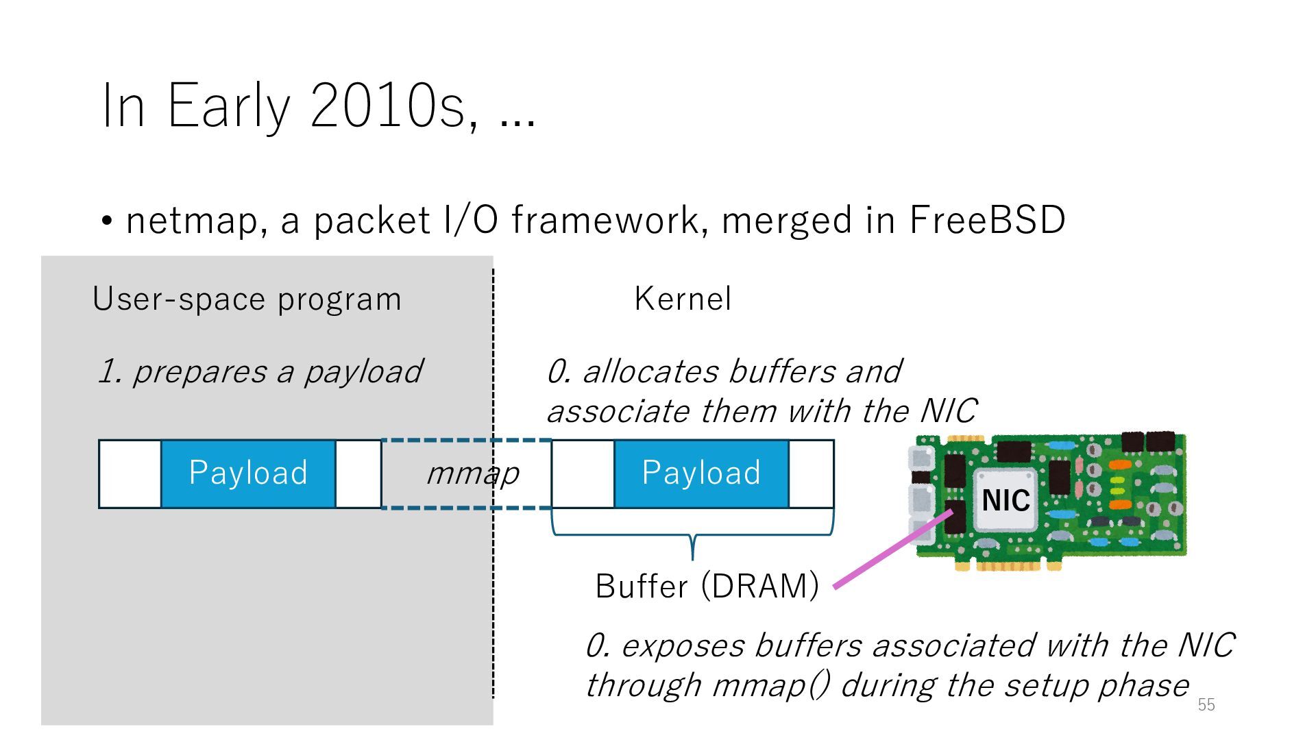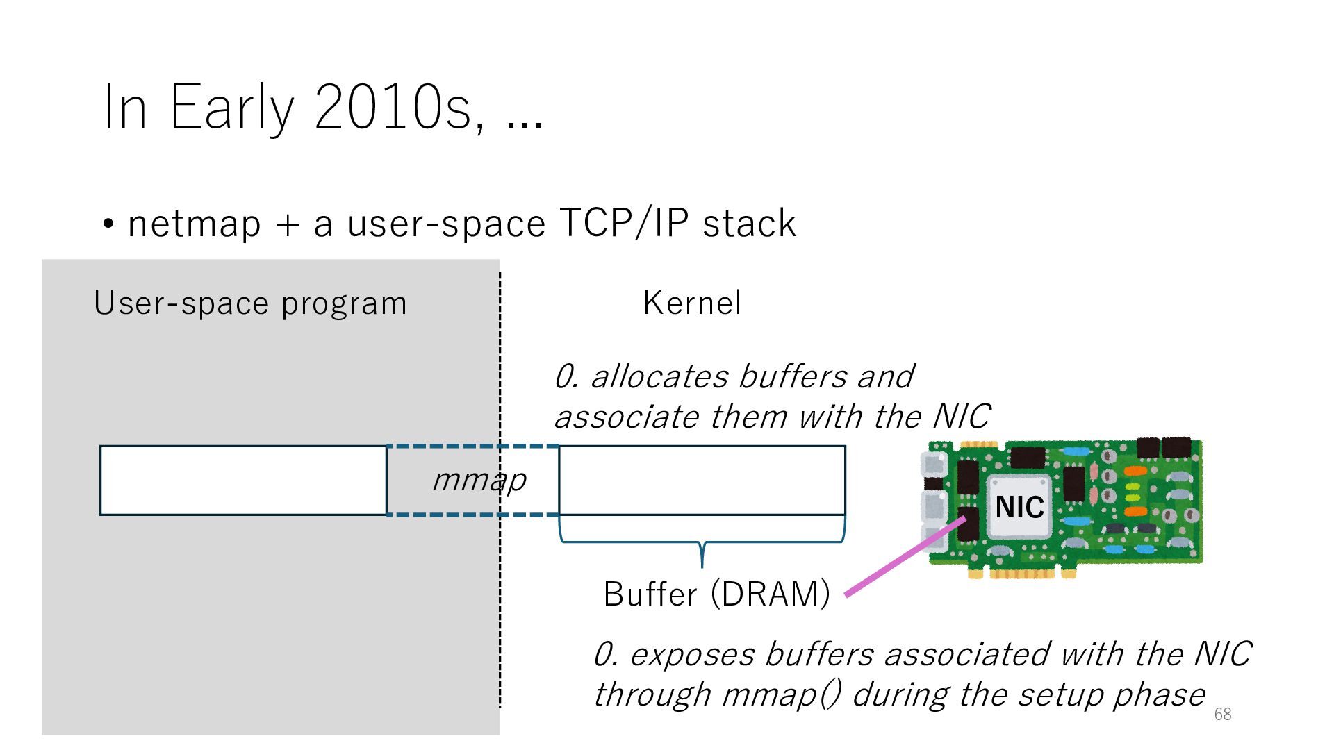 merged in FreeBSD • The speed of packet transmission over a raw socket is 1.05 Mpps • Mpps: million packets per second • netmap achieves the line rate (14.88 Mpps) with one CPU core application costs almost negligible: a packet generator which streams pre-generated packets, and a packet re- ceiver which just counts incoming packets. 5.2 Test equipment We have run most of our experiments on systems equipped with an i7-870 4-core CPU at 2.93 GHz (3.2 GHz with turbo-boost), memory running at 1.33 GHz, and a dual port 10 Gbit/s card based on the Intel 82599 NIC. The numbers reported in this paper refer to the netmap version in FreeBSD HEAD/amd64 as of April 2012. Experiments have been run using di- rectly connected cards on two similar systems. Results are highly repeatable (within 2% or less) so we do not report confidence intervals in the tables and graphs. netmap is extremely efficient so it saturates a 10 Gbit/s interface even at the maximum packet rate, and we need to run the system at reduced clock speeds to determine 0 2 4 6 8 10 12 14 16 0 0.5 1 1.5 2 2.5 3 Tx Rate (Mpps) Clock speed (GHz) netmap on 4 cores netmap on 2 cores netmap on 1 core Linux/pktgen FreeBSD/netsend Figure 5: Netmap transmit performance with 64-byte packets, variable clock rates and number of cores, com- pared to pktgen (a specialised, in-kernel generator avail- able on linux, peaking at about 4 Mpps) and a netsend (FreeBSD userspace, peaking at 1.05 Mpps). 63 Luigi Rizzo, “netmap: a novel framework for fast packet I/O”, USENIX ATC 2012 https://www.usenix.org/conference/atc12/technical-sessions/presentation/rizzo