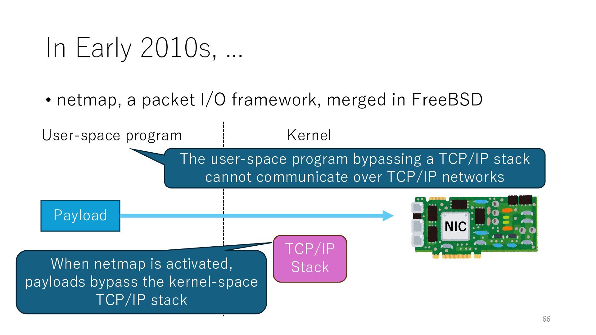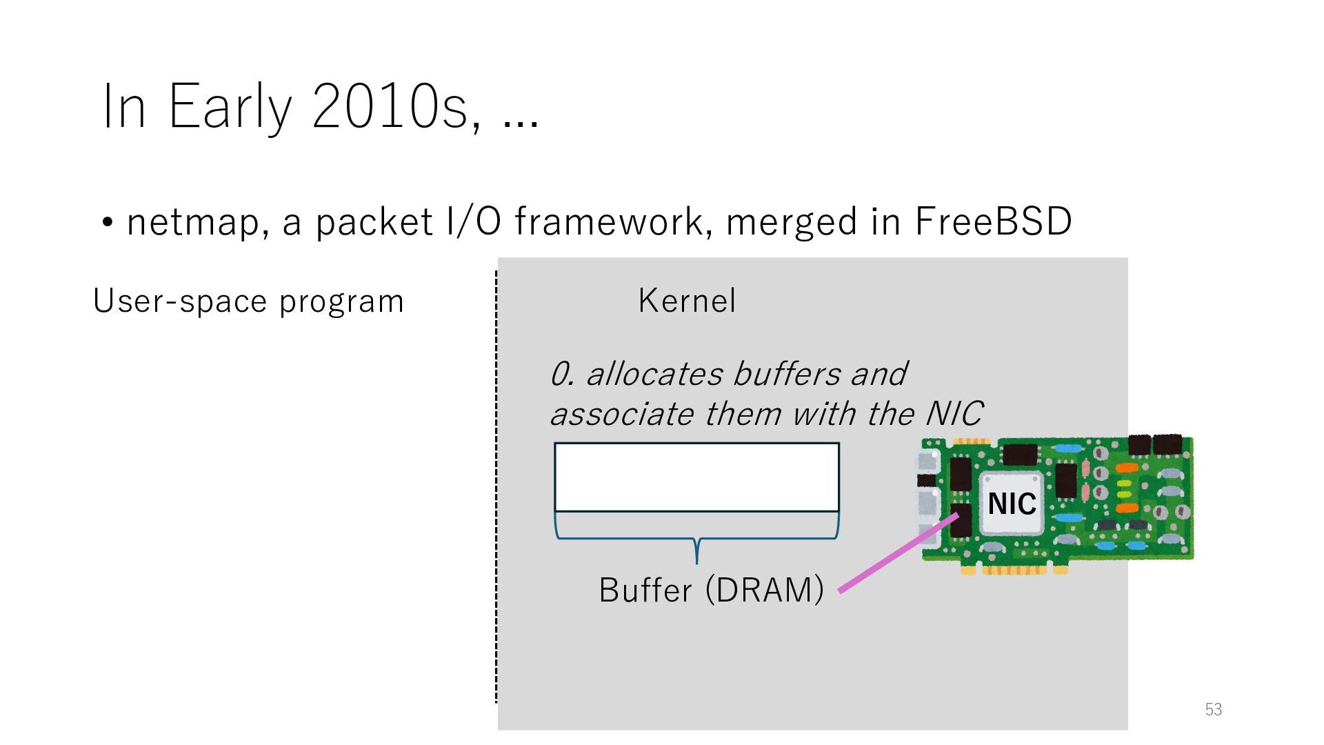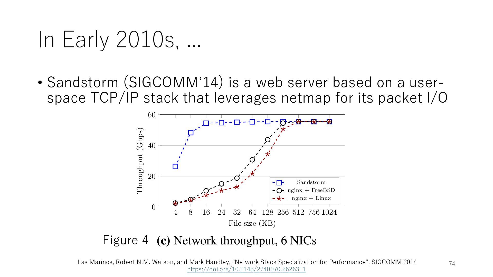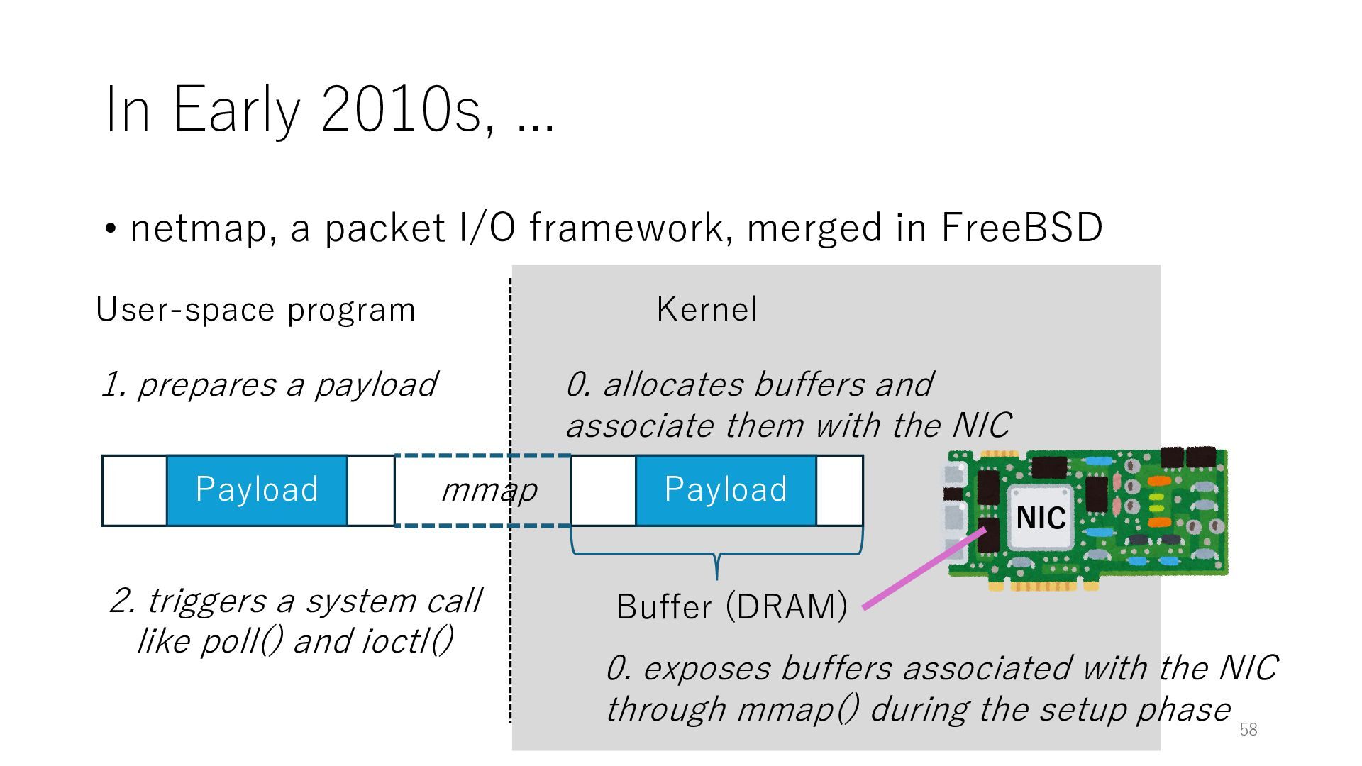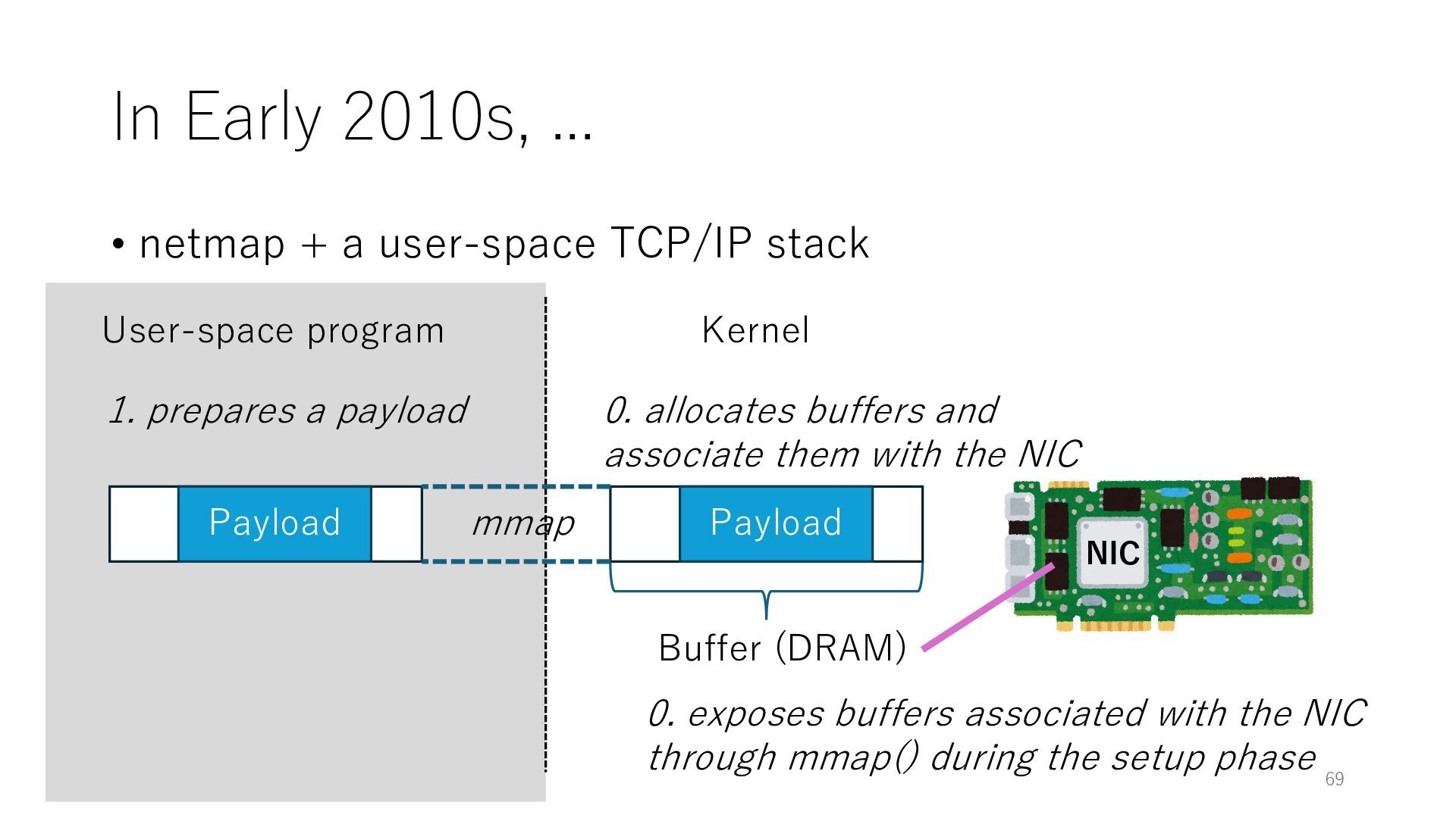 merged in FreeBSD • The speed of packet transmission over a raw socket is 1.05 Mpps • Mpps: million packets per second • netmap achieves the line rate (14.88 Mpps) with one CPU core application costs almost negligible: a packet generator which streams pre-generated packets, and a packet re- ceiver which just counts incoming packets. 5.2 Test equipment We have run most of our experiments on systems equipped with an i7-870 4-core CPU at 2.93 GHz (3.2 GHz with turbo-boost), memory running at 1.33 GHz, and a dual port 10 Gbit/s card based on the Intel 82599 NIC. The numbers reported in this paper refer to the netmap version in FreeBSD HEAD/amd64 as of April 2012. Experiments have been run using di- rectly connected cards on two similar systems. Results are highly repeatable (within 2% or less) so we do not report confidence intervals in the tables and graphs. netmap is extremely efficient so it saturates a 10 Gbit/s interface even at the maximum packet rate, and we need to run the system at reduced clock speeds to determine 0 2 4 6 8 10 12 14 16 0 0.5 1 1.5 2 2.5 3 Tx Rate (Mpps) Clock speed (GHz) netmap on 4 cores netmap on 2 cores netmap on 1 core Linux/pktgen FreeBSD/netsend Figure 5: Netmap transmit performance with 64-byte packets, variable clock rates and number of cores, com- pared to pktgen (a specialised, in-kernel generator avail- able on linux, peaking at about 4 Mpps) and a netsend (FreeBSD userspace, peaking at 1.05 Mpps). 63 Luigi Rizzo, “netmap: a novel framework for fast packet I/O”, USENIX ATC 2012 https://www.usenix.org/conference/atc12/technical-sessions/presentation/rizzo
