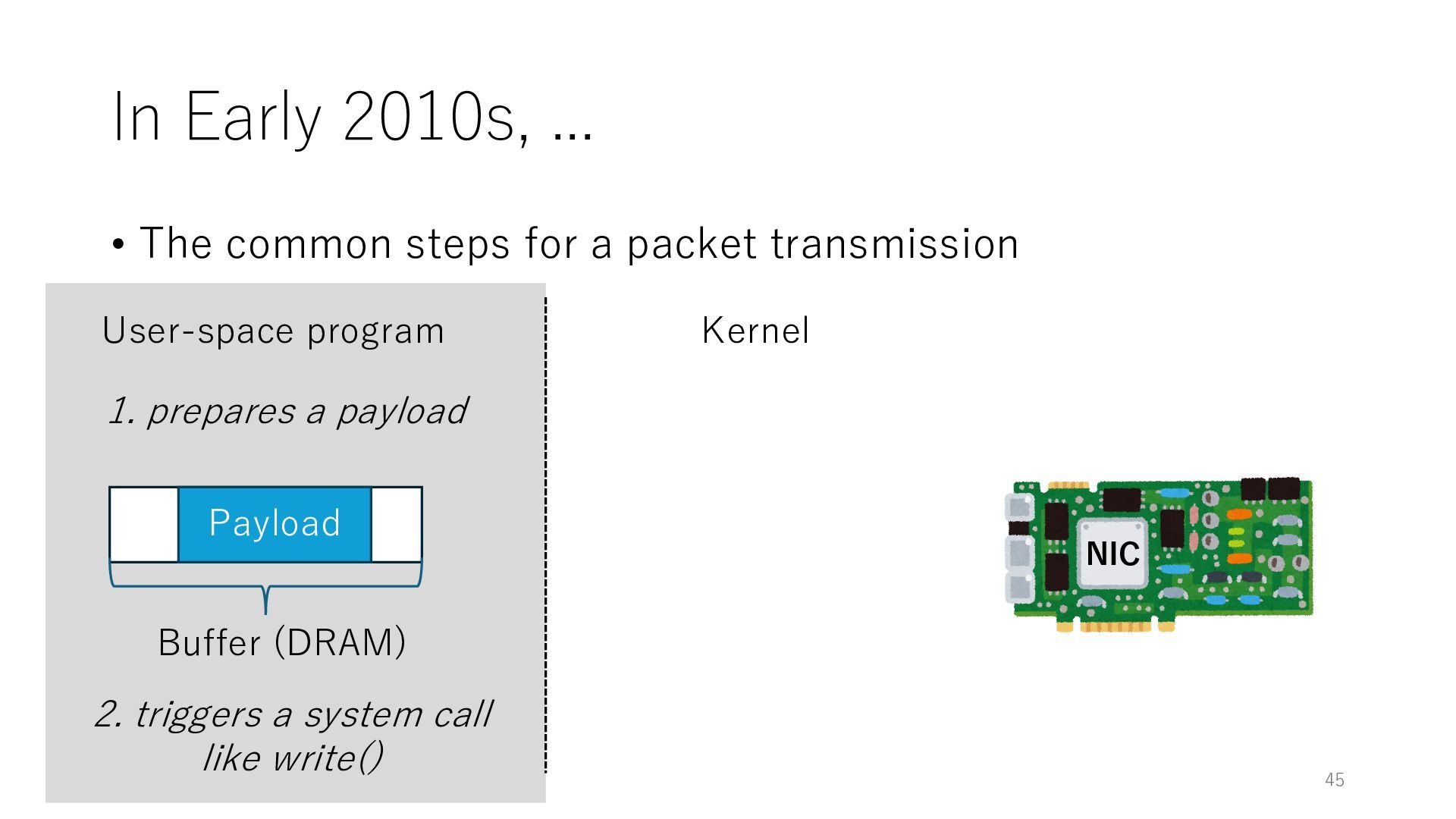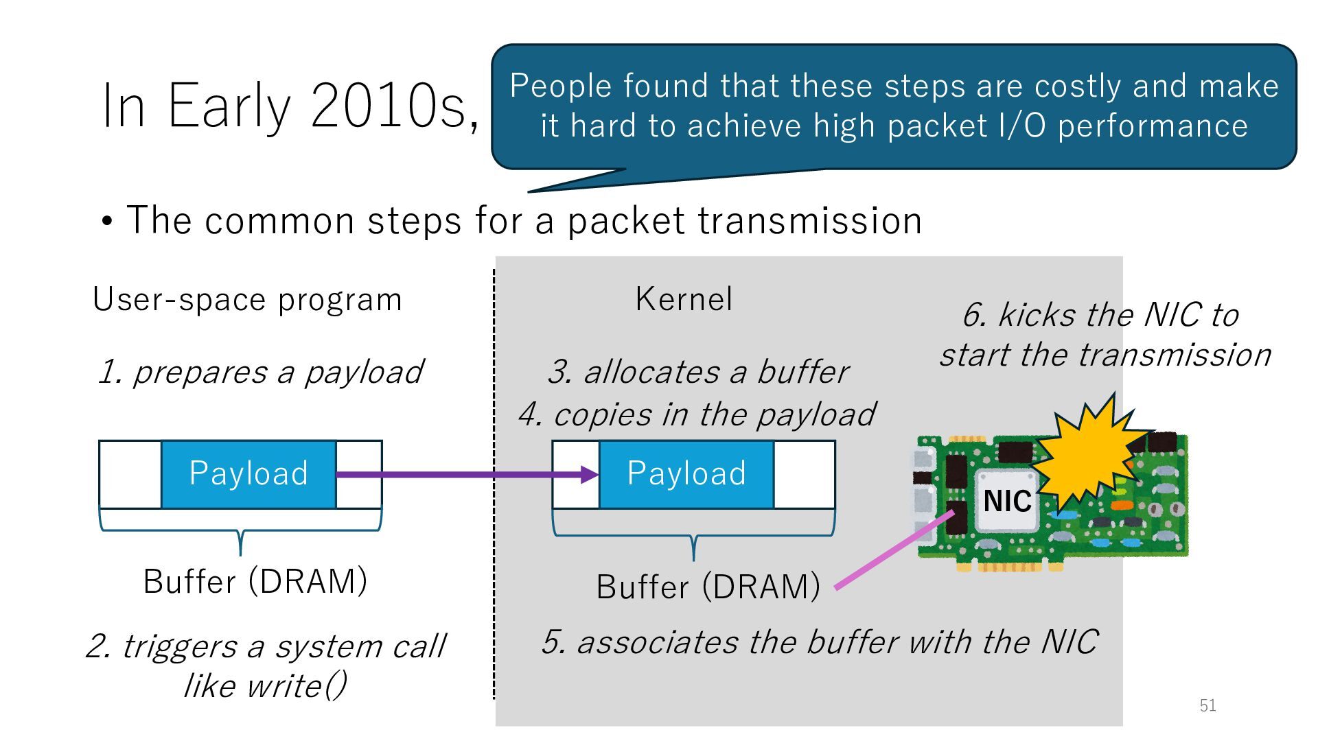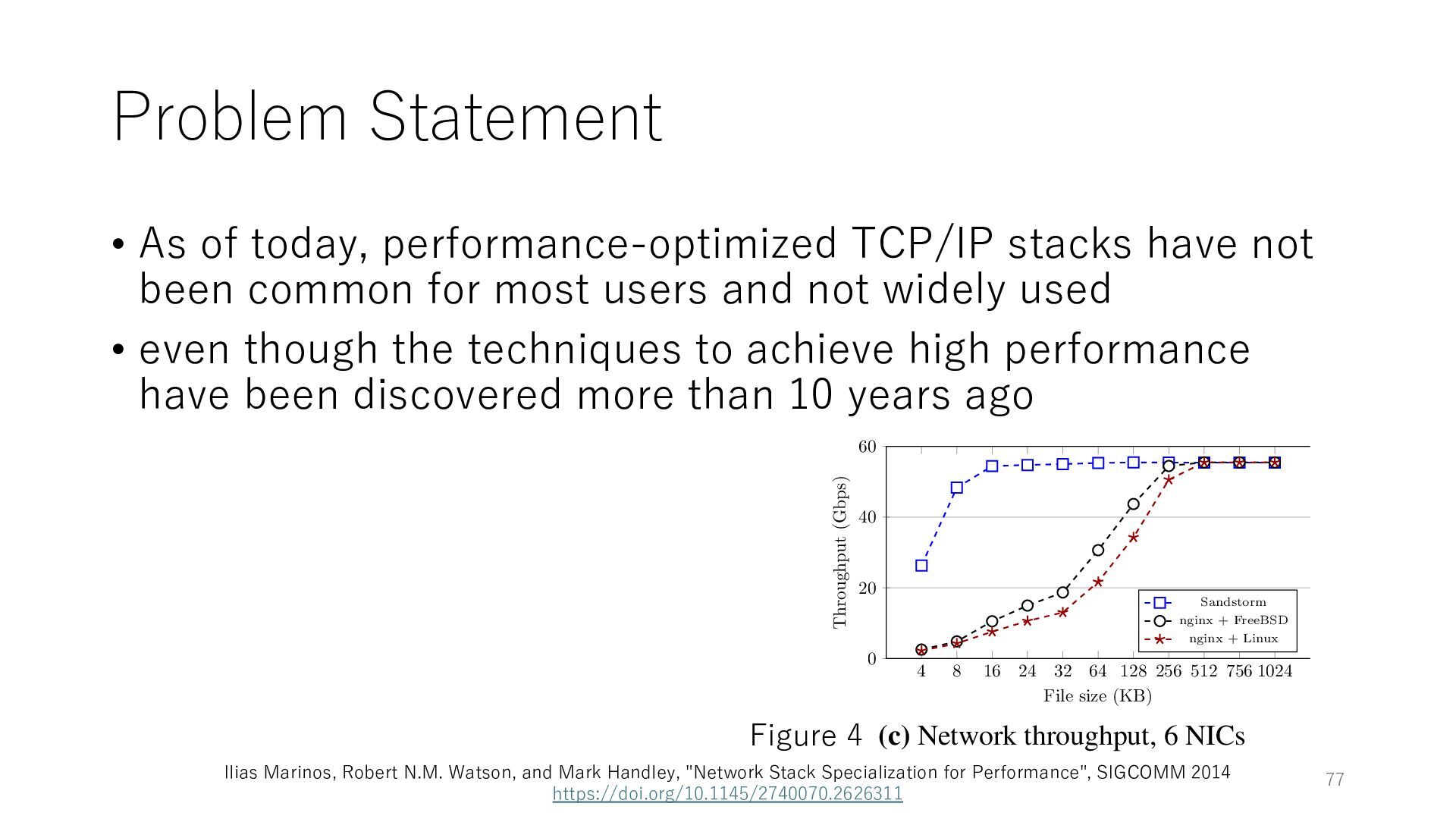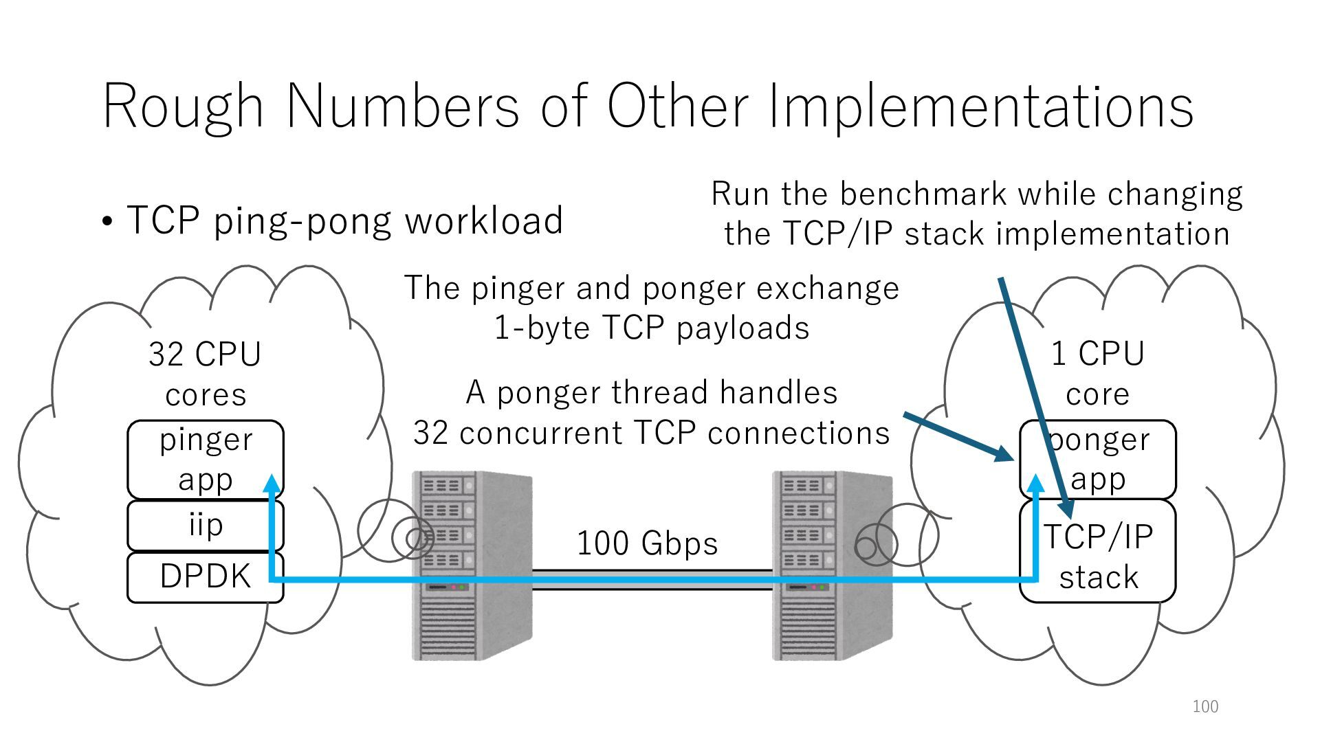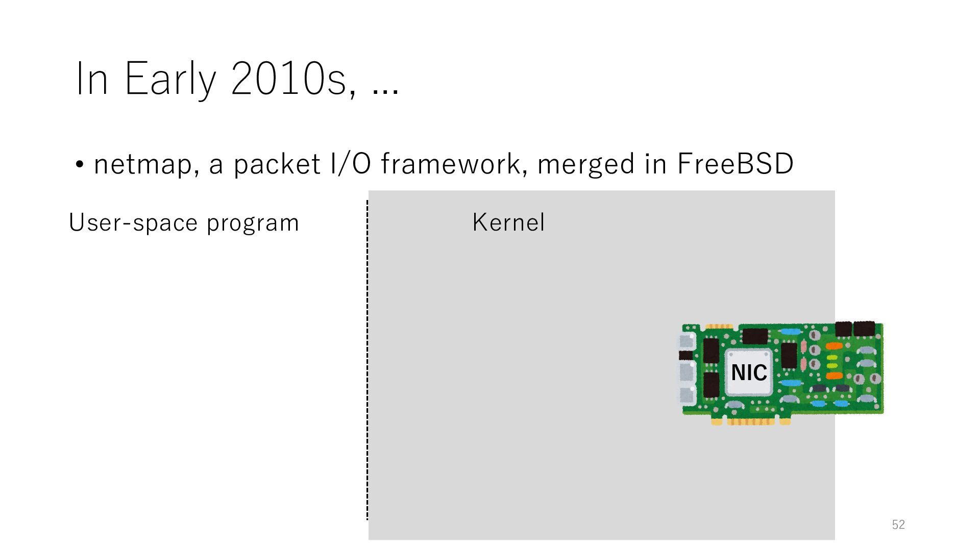 merged in FreeBSD • The speed of packet transmission over a raw socket is 1.05 Mpps • Mpps: million packets per second • netmap achieves the line rate (14.88 Mpps) with one CPU core application costs almost negligible: a packet generator which streams pre-generated packets, and a packet re- ceiver which just counts incoming packets. 5.2 Test equipment We have run most of our experiments on systems equipped with an i7-870 4-core CPU at 2.93 GHz (3.2 GHz with turbo-boost), memory running at 1.33 GHz, and a dual port 10 Gbit/s card based on the Intel 82599 NIC. The numbers reported in this paper refer to the netmap version in FreeBSD HEAD/amd64 as of April 2012. Experiments have been run using di- rectly connected cards on two similar systems. Results are highly repeatable (within 2% or less) so we do not report confidence intervals in the tables and graphs. netmap is extremely efficient so it saturates a 10 Gbit/s interface even at the maximum packet rate, and we need to run the system at reduced clock speeds to determine 0 2 4 6 8 10 12 14 16 0 0.5 1 1.5 2 2.5 3 Tx Rate (Mpps) Clock speed (GHz) netmap on 4 cores netmap on 2 cores netmap on 1 core Linux/pktgen FreeBSD/netsend Figure 5: Netmap transmit performance with 64-byte packets, variable clock rates and number of cores, com- pared to pktgen (a specialised, in-kernel generator avail- able on linux, peaking at about 4 Mpps) and a netsend (FreeBSD userspace, peaking at 1.05 Mpps). 63 Luigi Rizzo, “netmap: a novel framework for fast packet I/O”, USENIX ATC 2012 https://www.usenix.org/conference/atc12/technical-sessions/presentation/rizzo