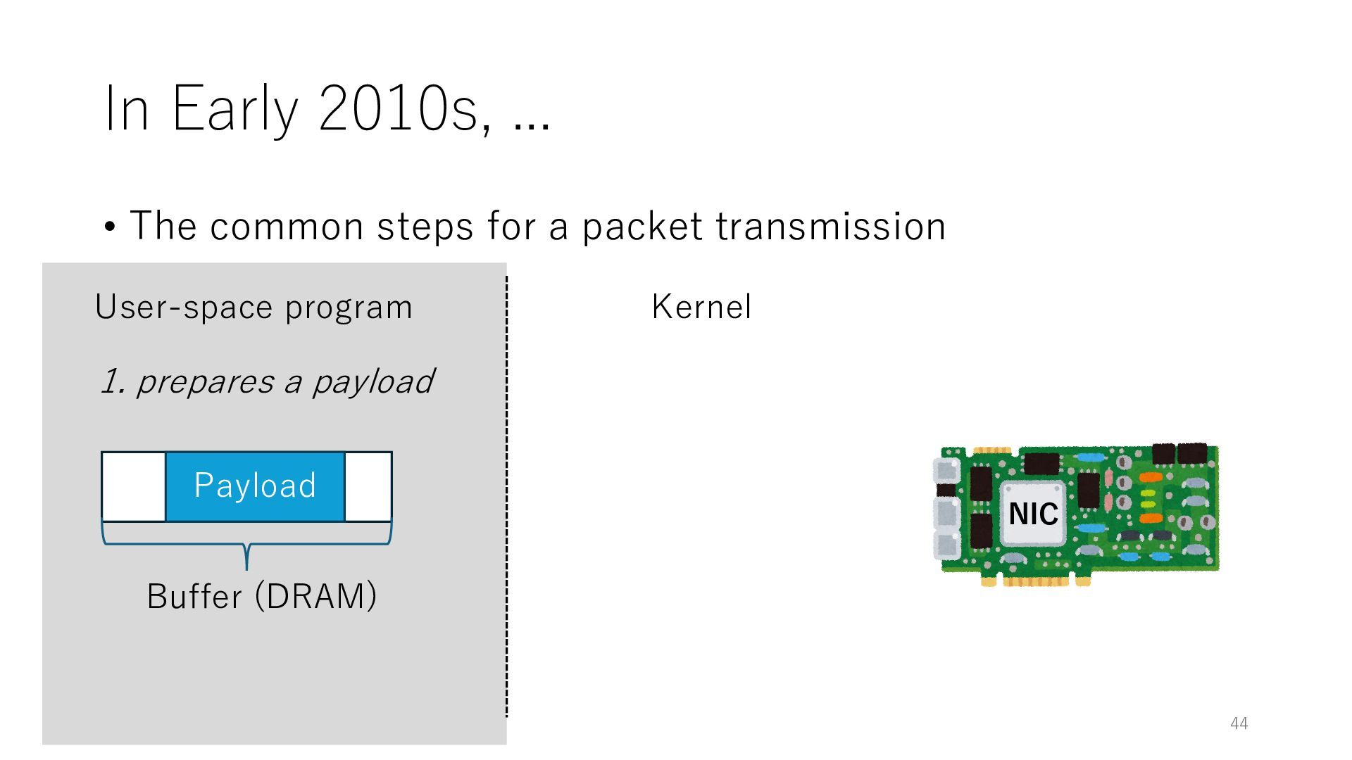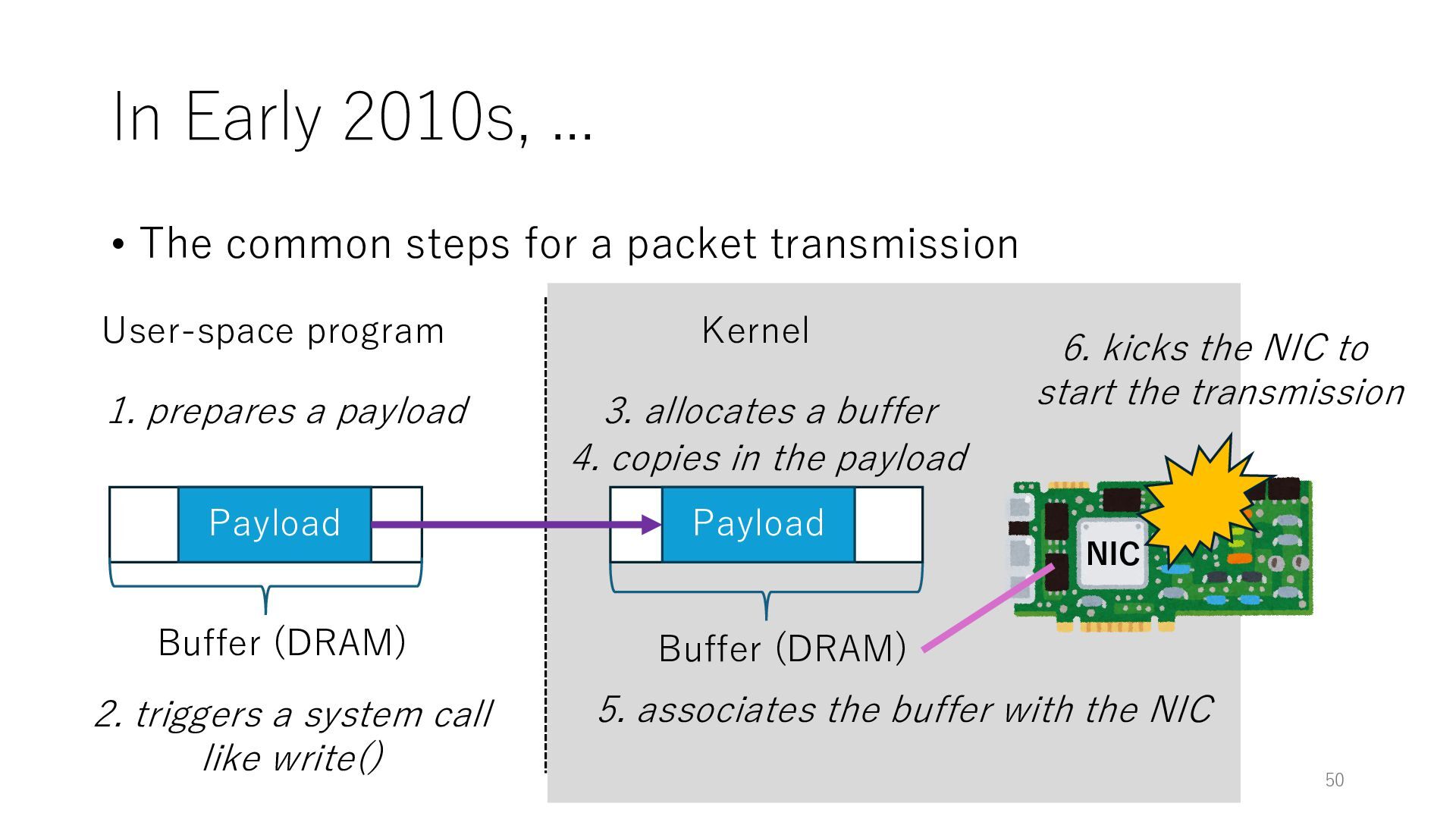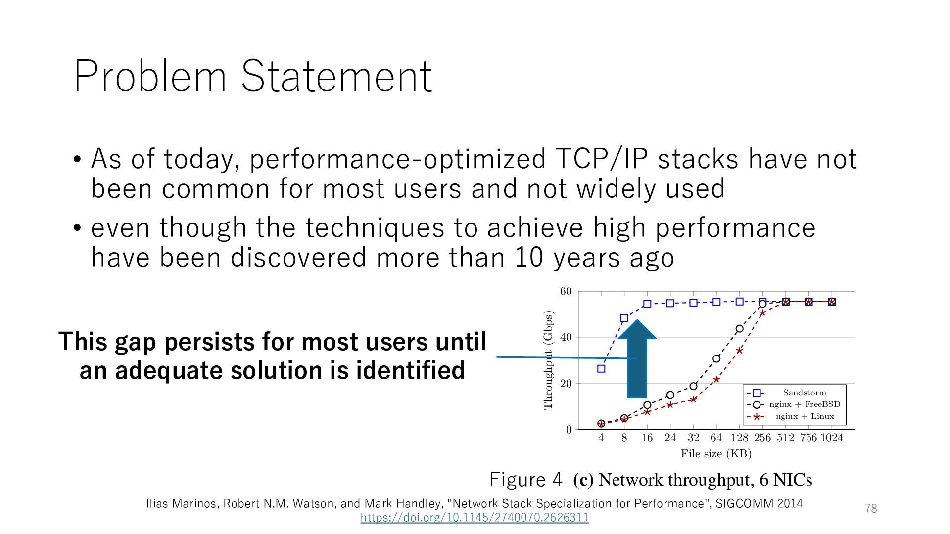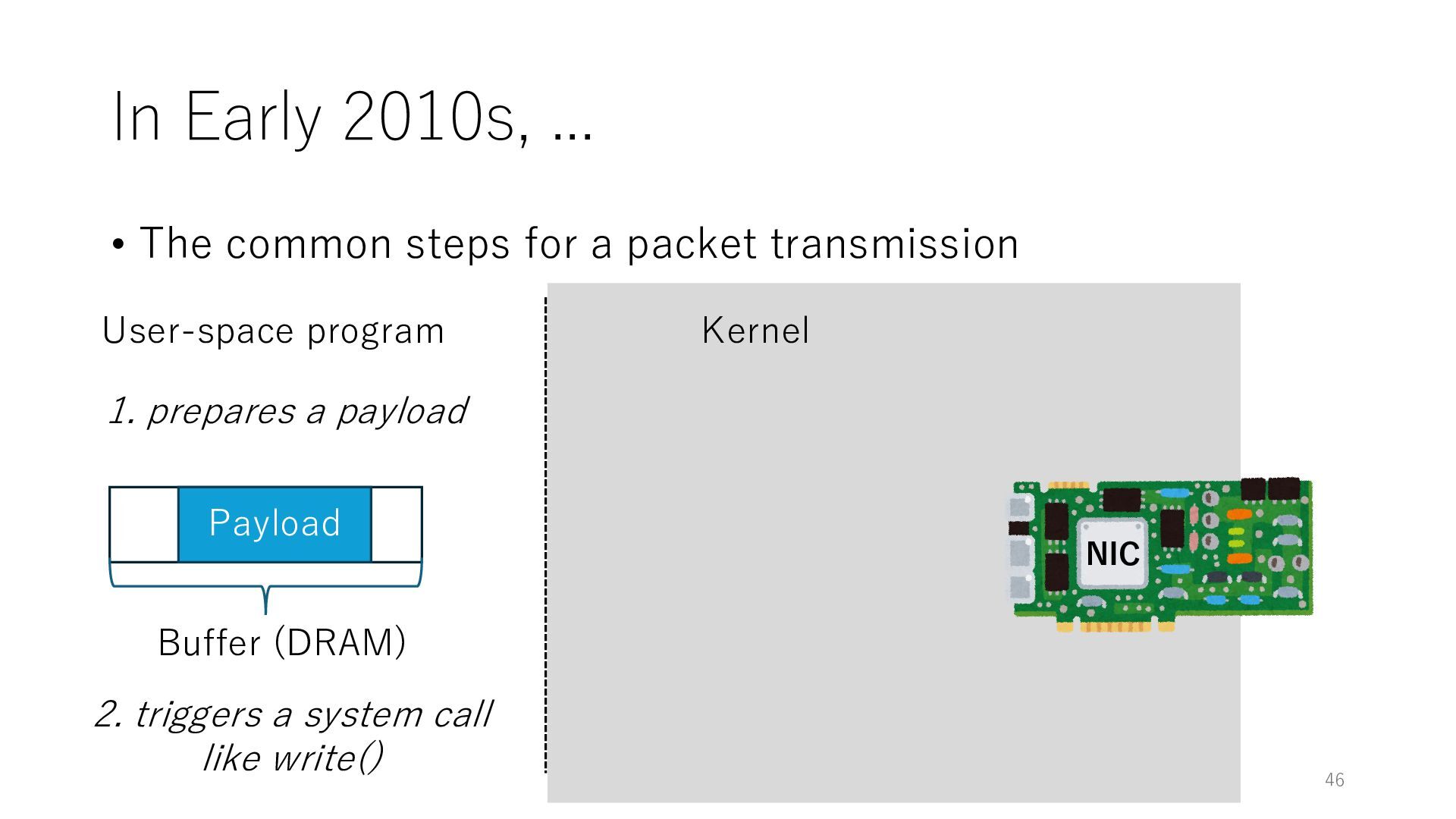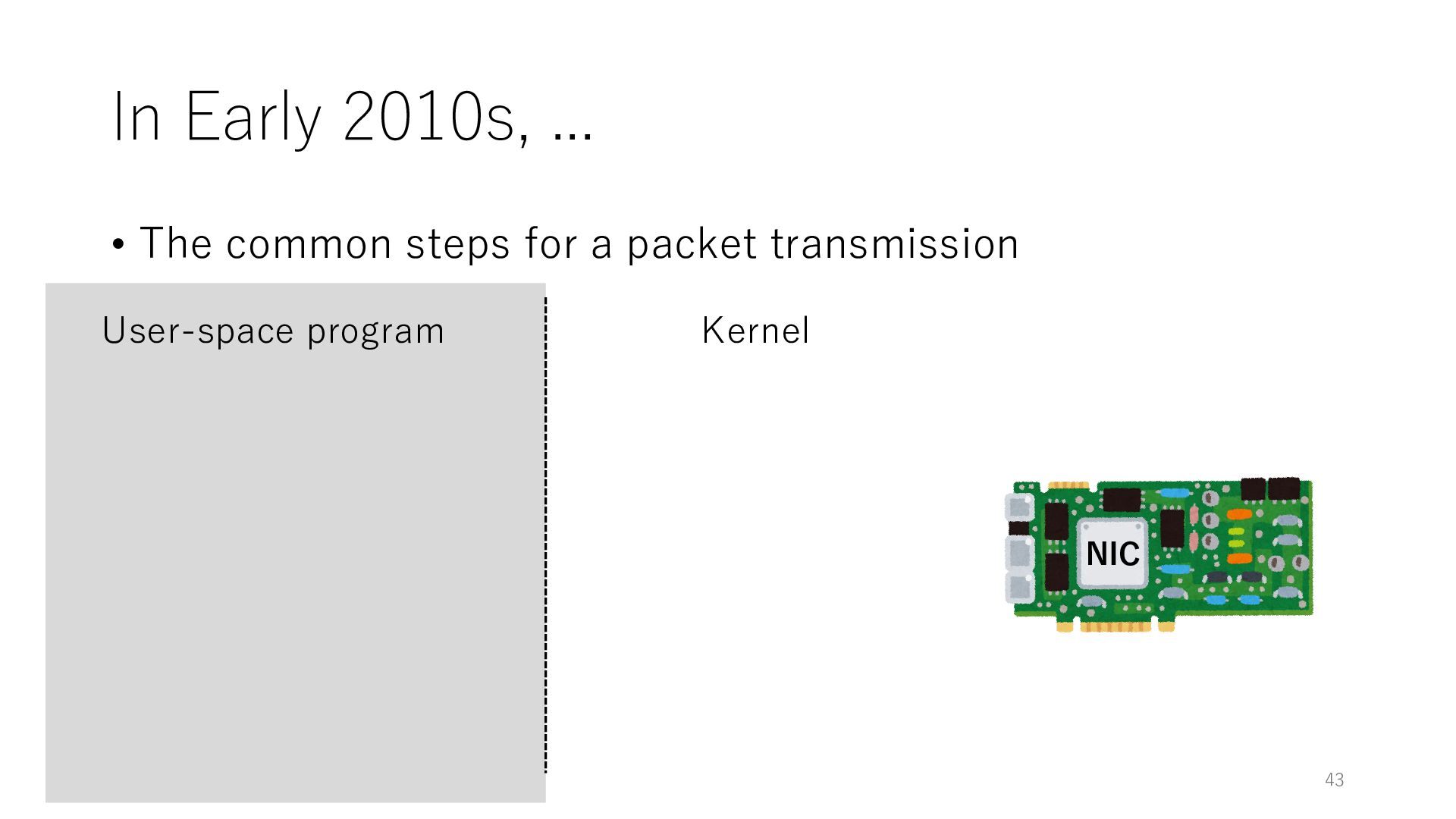 merged in FreeBSD • The speed of packet transmission over a raw socket is 1.05 Mpps • Mpps: million packets per second • netmap achieves the line rate (14.88 Mpps) with one CPU core application costs almost negligible: a packet generator which streams pre-generated packets, and a packet re- ceiver which just counts incoming packets. 5.2 Test equipment We have run most of our experiments on systems equipped with an i7-870 4-core CPU at 2.93 GHz (3.2 GHz with turbo-boost), memory running at 1.33 GHz, and a dual port 10 Gbit/s card based on the Intel 82599 NIC. The numbers reported in this paper refer to the netmap version in FreeBSD HEAD/amd64 as of April 2012. Experiments have been run using di- rectly connected cards on two similar systems. Results are highly repeatable (within 2% or less) so we do not report confidence intervals in the tables and graphs. netmap is extremely efficient so it saturates a 10 Gbit/s interface even at the maximum packet rate, and we need to run the system at reduced clock speeds to determine 0 2 4 6 8 10 12 14 16 0 0.5 1 1.5 2 2.5 3 Tx Rate (Mpps) Clock speed (GHz) netmap on 4 cores netmap on 2 cores netmap on 1 core Linux/pktgen FreeBSD/netsend Figure 5: Netmap transmit performance with 64-byte packets, variable clock rates and number of cores, com- pared to pktgen (a specialised, in-kernel generator avail- able on linux, peaking at about 4 Mpps) and a netsend (FreeBSD userspace, peaking at 1.05 Mpps). 63 Luigi Rizzo, “netmap: a novel framework for fast packet I/O”, USENIX ATC 2012 https://www.usenix.org/conference/atc12/technical-sessions/presentation/rizzo