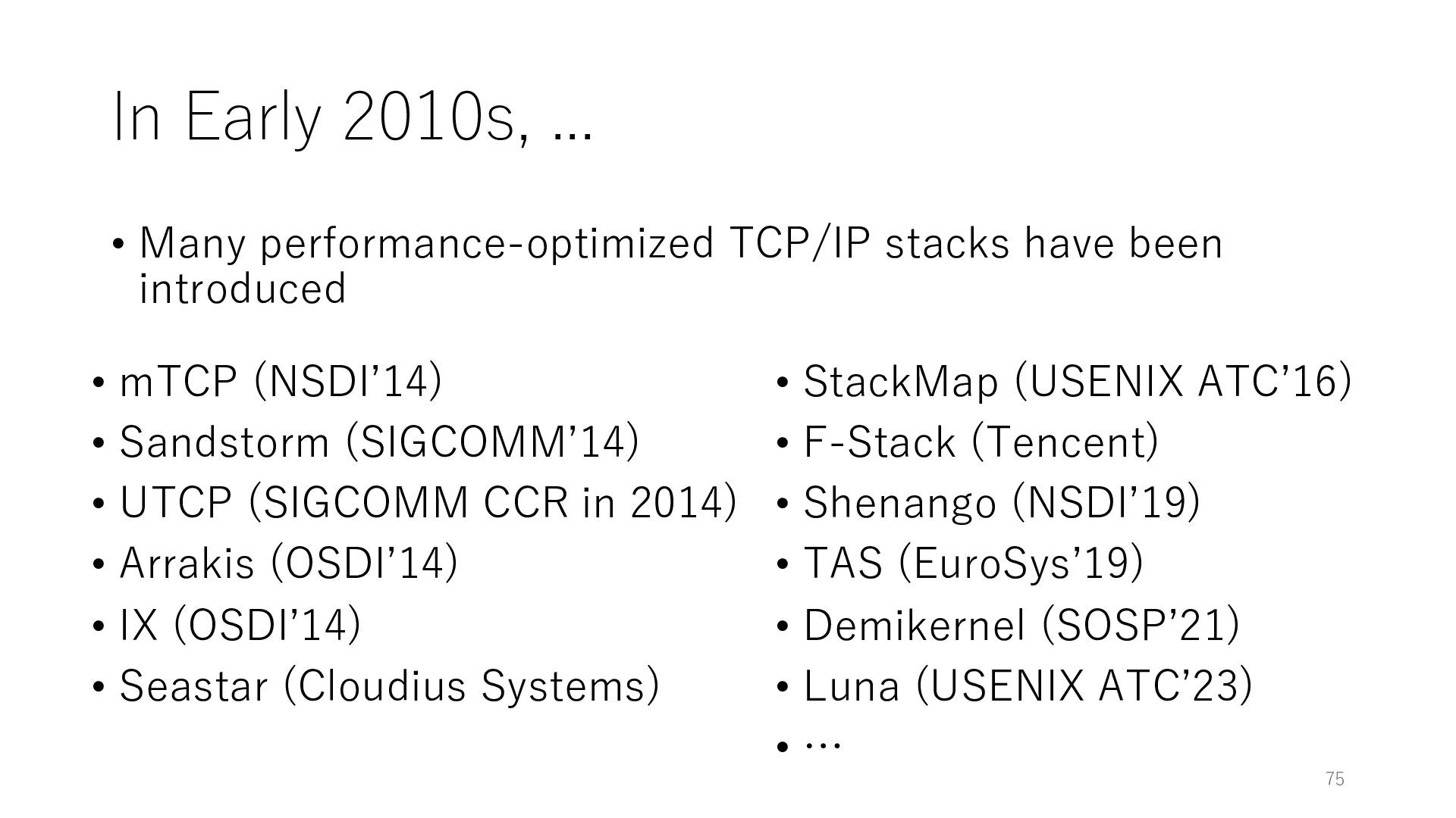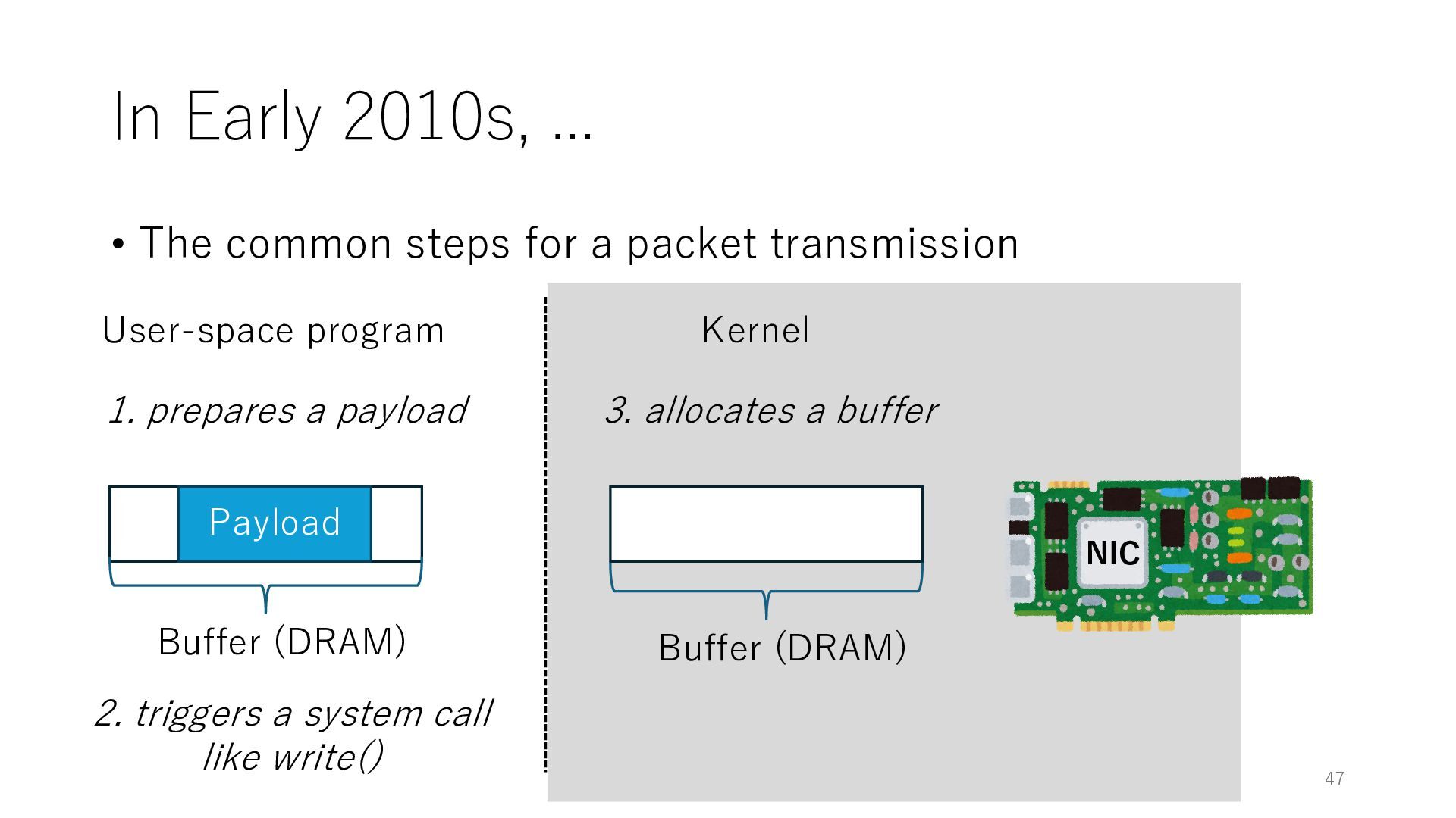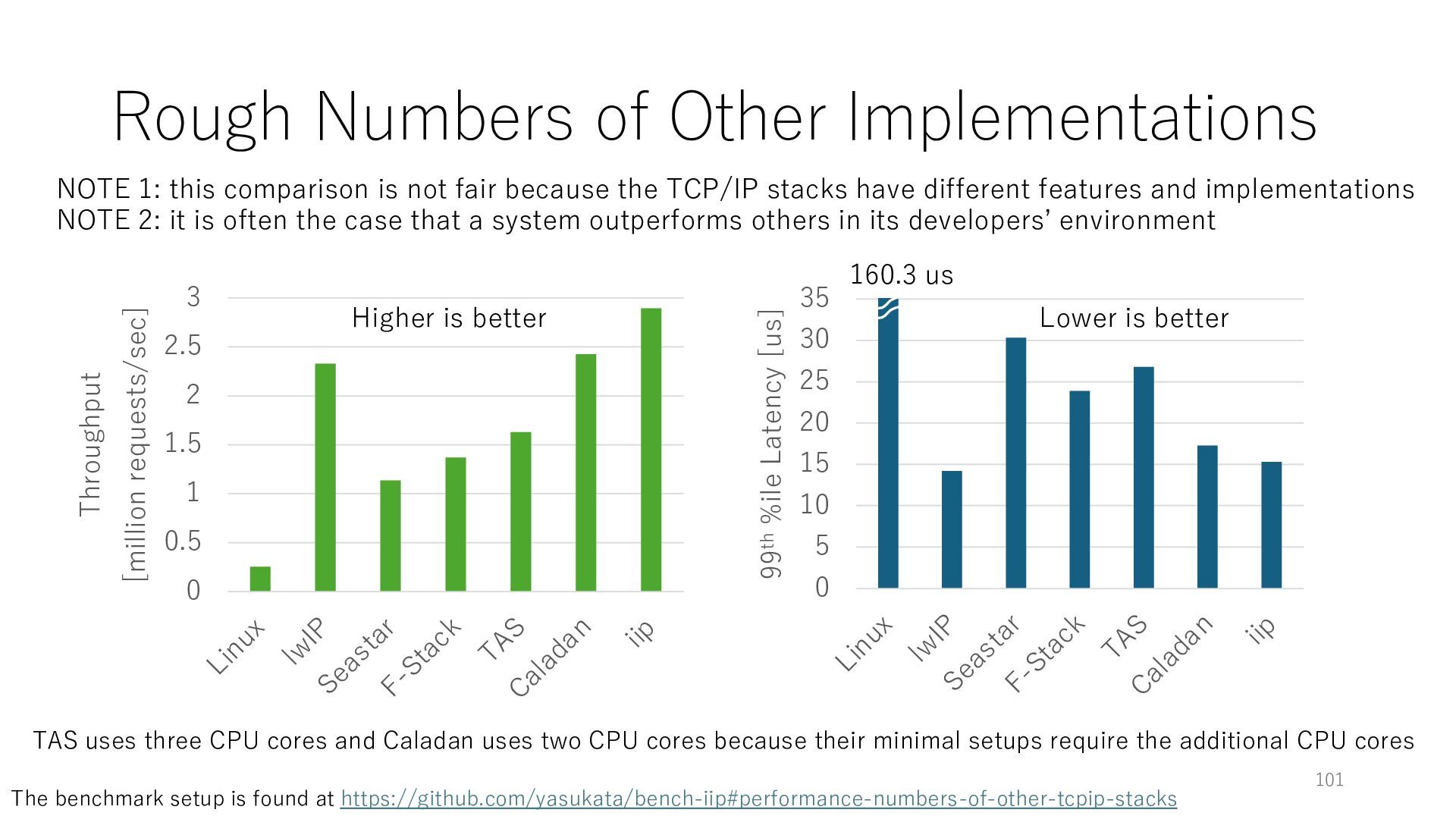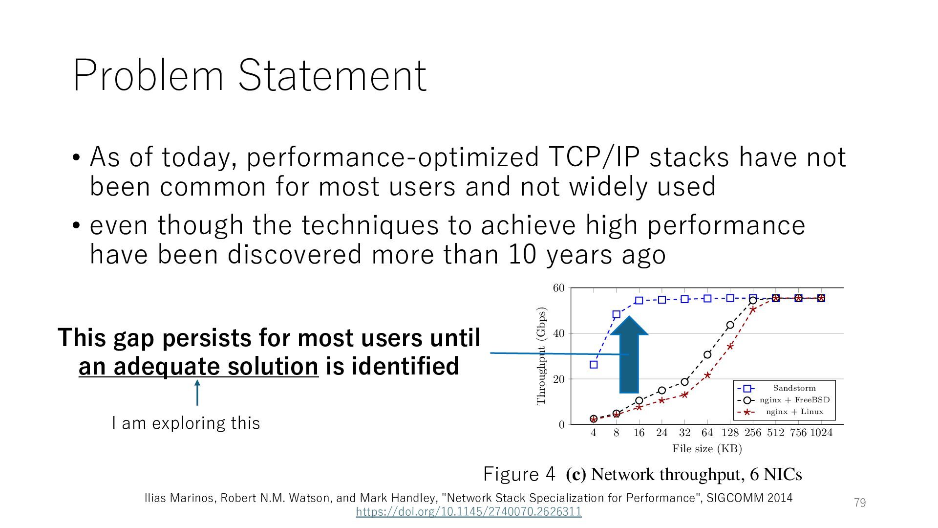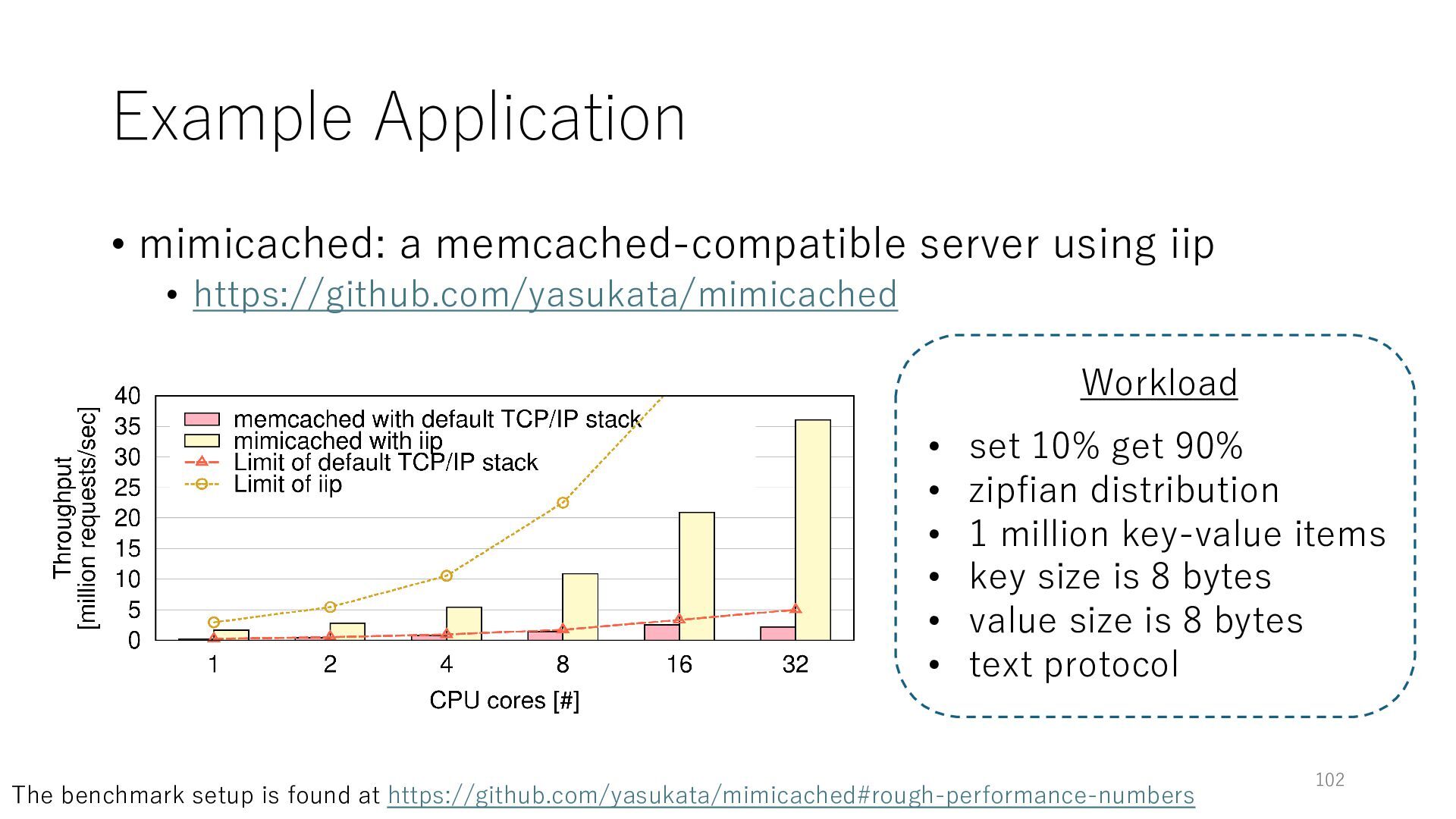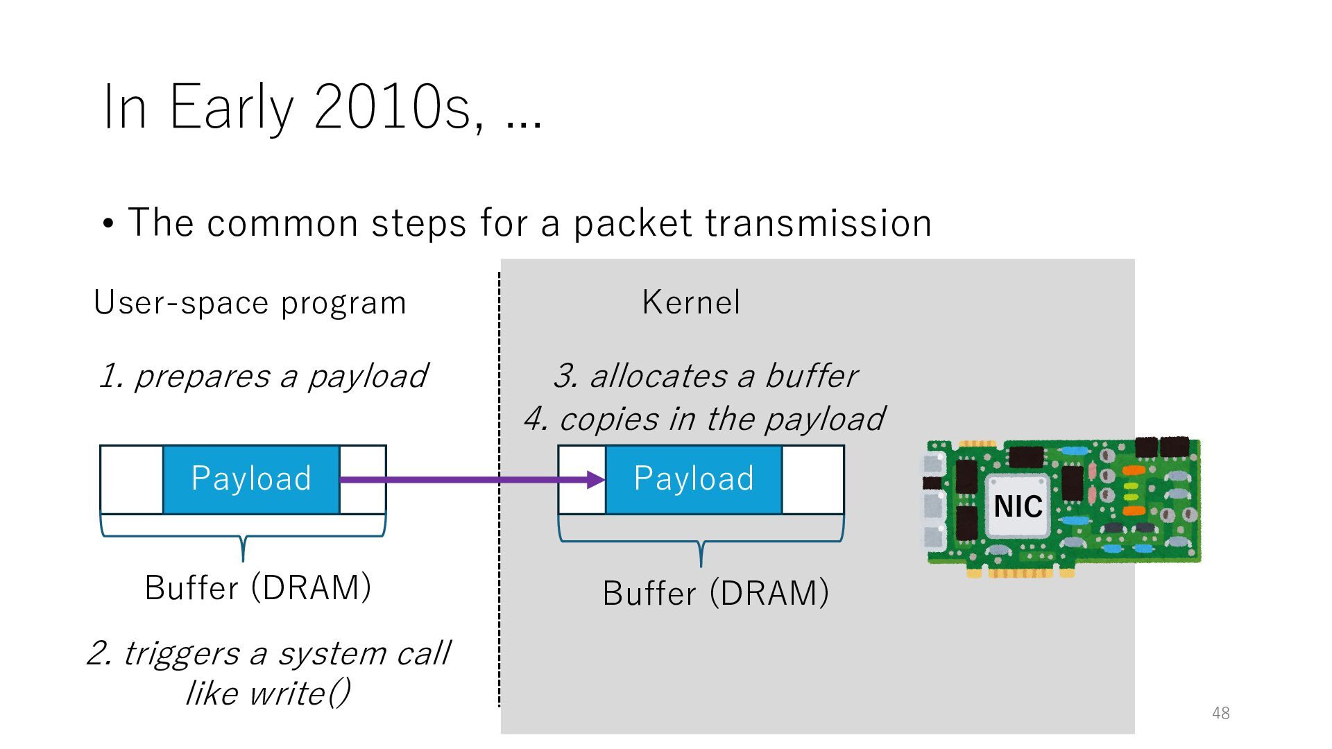 merged in FreeBSD • The speed of packet transmission over a raw socket is 1.05 Mpps • Mpps: million packets per second • netmap achieves the line rate (14.88 Mpps) with one CPU core application costs almost negligible: a packet generator which streams pre-generated packets, and a packet re- ceiver which just counts incoming packets. 5.2 Test equipment We have run most of our experiments on systems equipped with an i7-870 4-core CPU at 2.93 GHz (3.2 GHz with turbo-boost), memory running at 1.33 GHz, and a dual port 10 Gbit/s card based on the Intel 82599 NIC. The numbers reported in this paper refer to the netmap version in FreeBSD HEAD/amd64 as of April 2012. Experiments have been run using di- rectly connected cards on two similar systems. Results are highly repeatable (within 2% or less) so we do not report confidence intervals in the tables and graphs. netmap is extremely efficient so it saturates a 10 Gbit/s interface even at the maximum packet rate, and we need to run the system at reduced clock speeds to determine 0 2 4 6 8 10 12 14 16 0 0.5 1 1.5 2 2.5 3 Tx Rate (Mpps) Clock speed (GHz) netmap on 4 cores netmap on 2 cores netmap on 1 core Linux/pktgen FreeBSD/netsend Figure 5: Netmap transmit performance with 64-byte packets, variable clock rates and number of cores, com- pared to pktgen (a specialised, in-kernel generator avail- able on linux, peaking at about 4 Mpps) and a netsend (FreeBSD userspace, peaking at 1.05 Mpps). 63 Luigi Rizzo, “netmap: a novel framework for fast packet I/O”, USENIX ATC 2012 https://www.usenix.org/conference/atc12/technical-sessions/presentation/rizzo