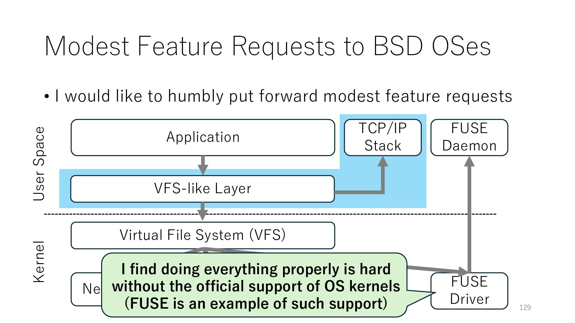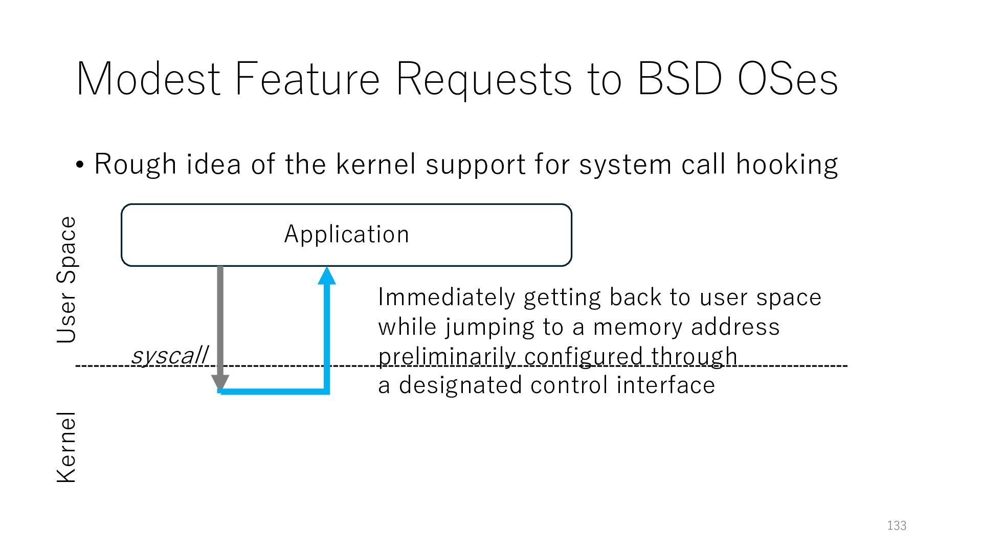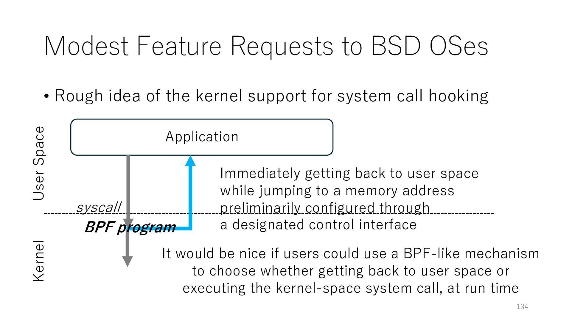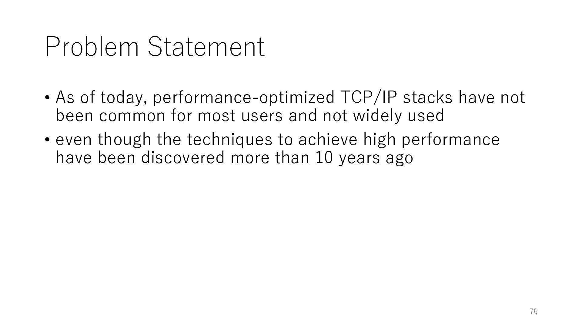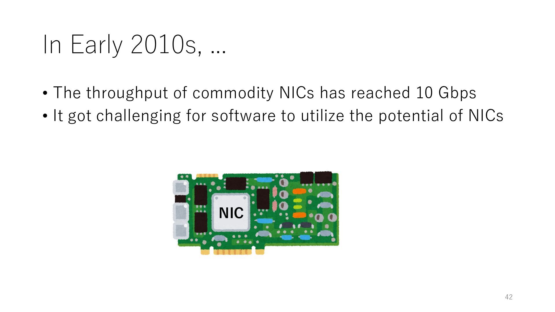 merged in FreeBSD • The speed of packet transmission over a raw socket is 1.05 Mpps • Mpps: million packets per second • netmap achieves the line rate (14.88 Mpps) with one CPU core application costs almost negligible: a packet generator which streams pre-generated packets, and a packet re- ceiver which just counts incoming packets. 5.2 Test equipment We have run most of our experiments on systems equipped with an i7-870 4-core CPU at 2.93 GHz (3.2 GHz with turbo-boost), memory running at 1.33 GHz, and a dual port 10 Gbit/s card based on the Intel 82599 NIC. The numbers reported in this paper refer to the netmap version in FreeBSD HEAD/amd64 as of April 2012. Experiments have been run using di- rectly connected cards on two similar systems. Results are highly repeatable (within 2% or less) so we do not report confidence intervals in the tables and graphs. netmap is extremely efficient so it saturates a 10 Gbit/s interface even at the maximum packet rate, and we need to run the system at reduced clock speeds to determine 0 2 4 6 8 10 12 14 16 0 0.5 1 1.5 2 2.5 3 Tx Rate (Mpps) Clock speed (GHz) netmap on 4 cores netmap on 2 cores netmap on 1 core Linux/pktgen FreeBSD/netsend Figure 5: Netmap transmit performance with 64-byte packets, variable clock rates and number of cores, com- pared to pktgen (a specialised, in-kernel generator avail- able on linux, peaking at about 4 Mpps) and a netsend (FreeBSD userspace, peaking at 1.05 Mpps). 63 Luigi Rizzo, “netmap: a novel framework for fast packet I/O”, USENIX ATC 2012 https://www.usenix.org/conference/atc12/technical-sessions/presentation/rizzo