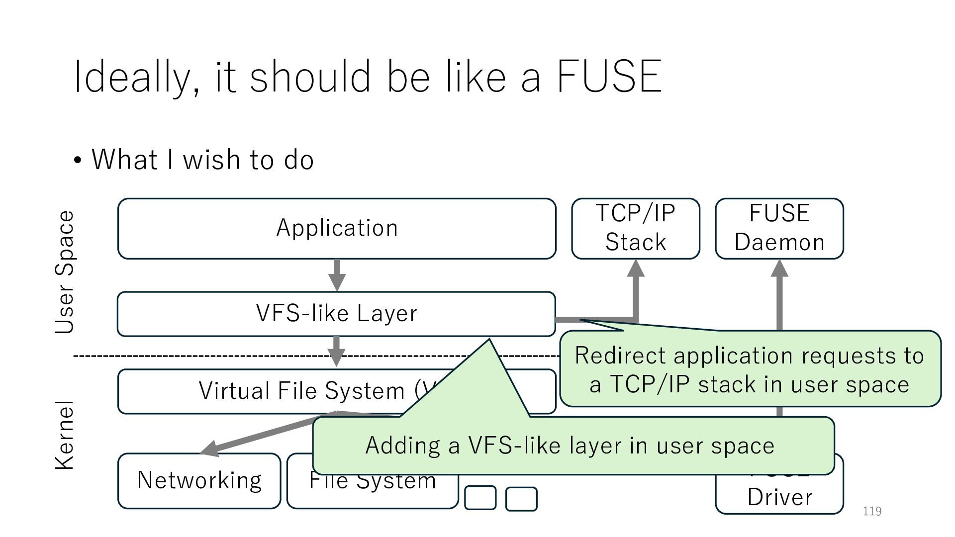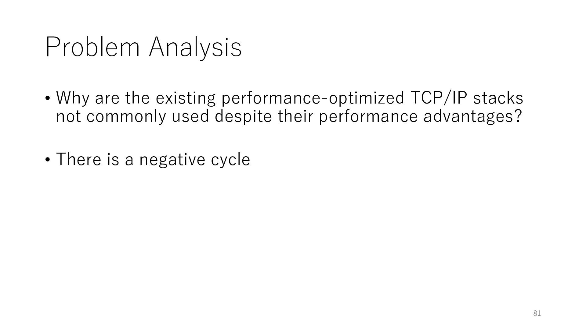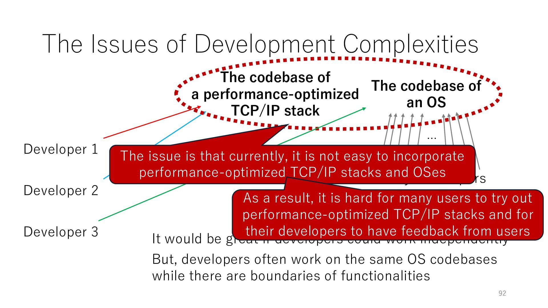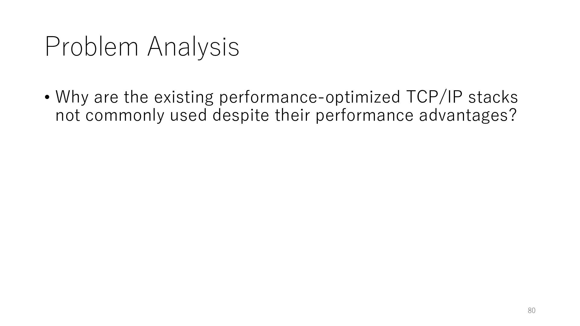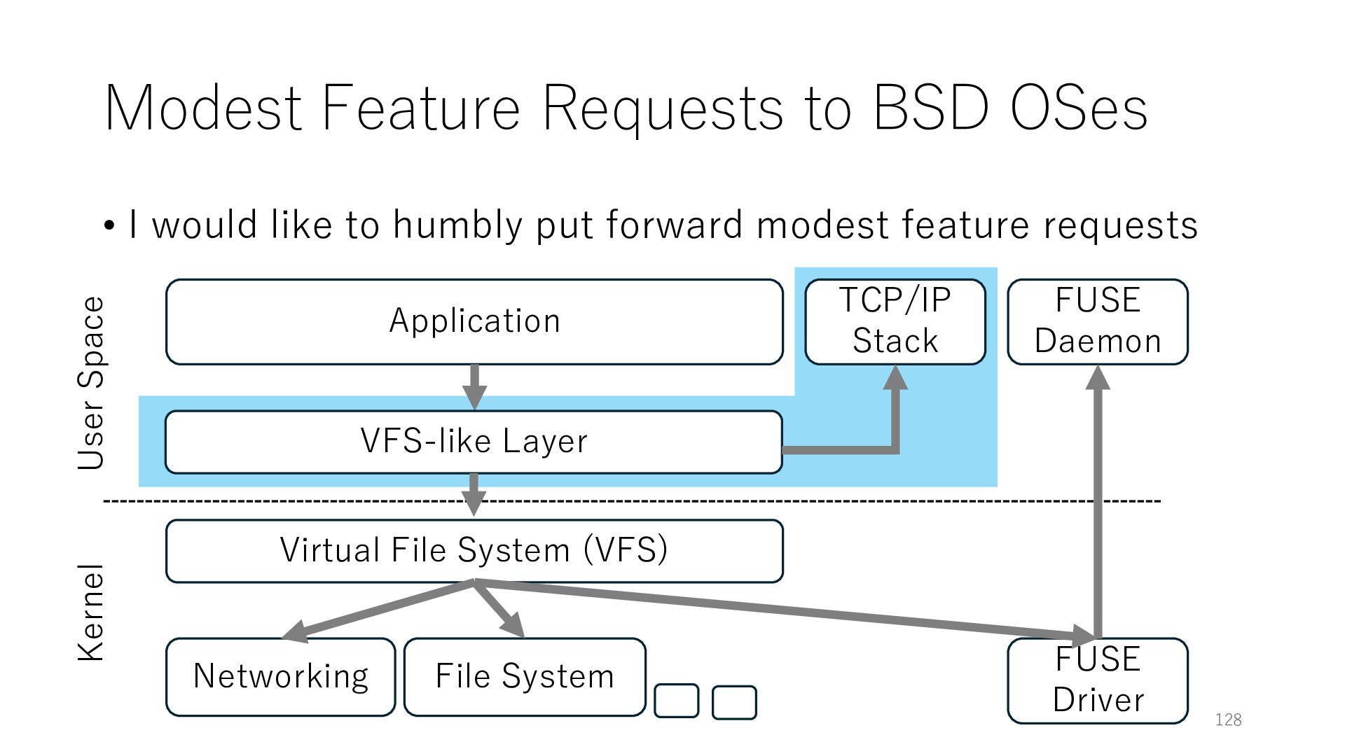 merged in FreeBSD • The speed of packet transmission over a raw socket is 1.05 Mpps • Mpps: million packets per second • netmap achieves the line rate (14.88 Mpps) with one CPU core application costs almost negligible: a packet generator which streams pre-generated packets, and a packet re- ceiver which just counts incoming packets. 5.2 Test equipment We have run most of our experiments on systems equipped with an i7-870 4-core CPU at 2.93 GHz (3.2 GHz with turbo-boost), memory running at 1.33 GHz, and a dual port 10 Gbit/s card based on the Intel 82599 NIC. The numbers reported in this paper refer to the netmap version in FreeBSD HEAD/amd64 as of April 2012. Experiments have been run using di- rectly connected cards on two similar systems. Results are highly repeatable (within 2% or less) so we do not report confidence intervals in the tables and graphs. netmap is extremely efficient so it saturates a 10 Gbit/s interface even at the maximum packet rate, and we need to run the system at reduced clock speeds to determine 0 2 4 6 8 10 12 14 16 0 0.5 1 1.5 2 2.5 3 Tx Rate (Mpps) Clock speed (GHz) netmap on 4 cores netmap on 2 cores netmap on 1 core Linux/pktgen FreeBSD/netsend Figure 5: Netmap transmit performance with 64-byte packets, variable clock rates and number of cores, com- pared to pktgen (a specialised, in-kernel generator avail- able on linux, peaking at about 4 Mpps) and a netsend (FreeBSD userspace, peaking at 1.05 Mpps). 63 Luigi Rizzo, “netmap: a novel framework for fast packet I/O”, USENIX ATC 2012 https://www.usenix.org/conference/atc12/technical-sessions/presentation/rizzo