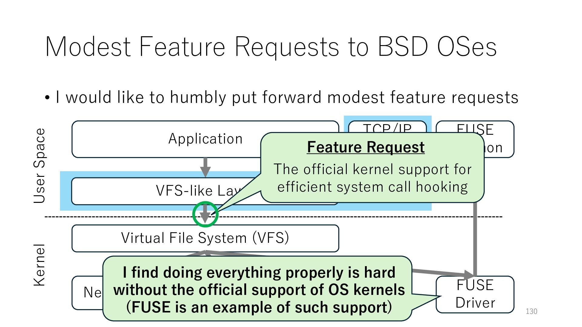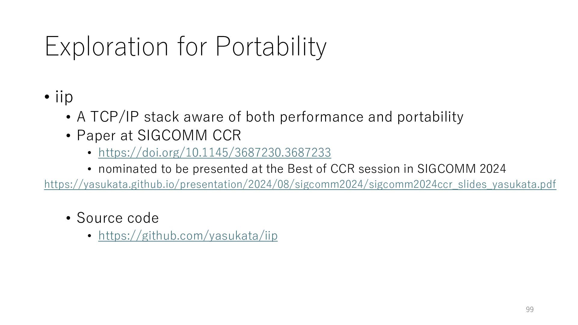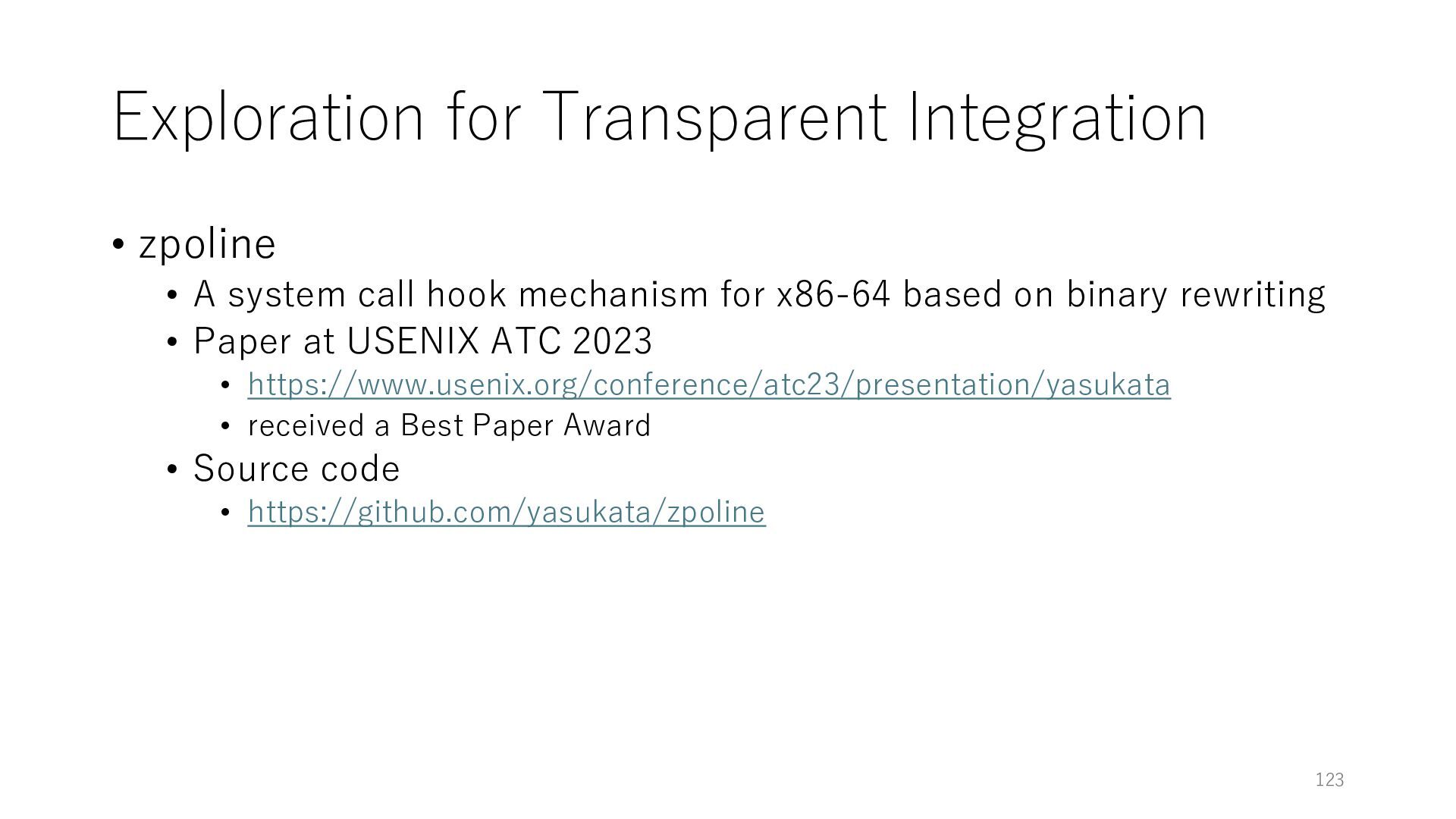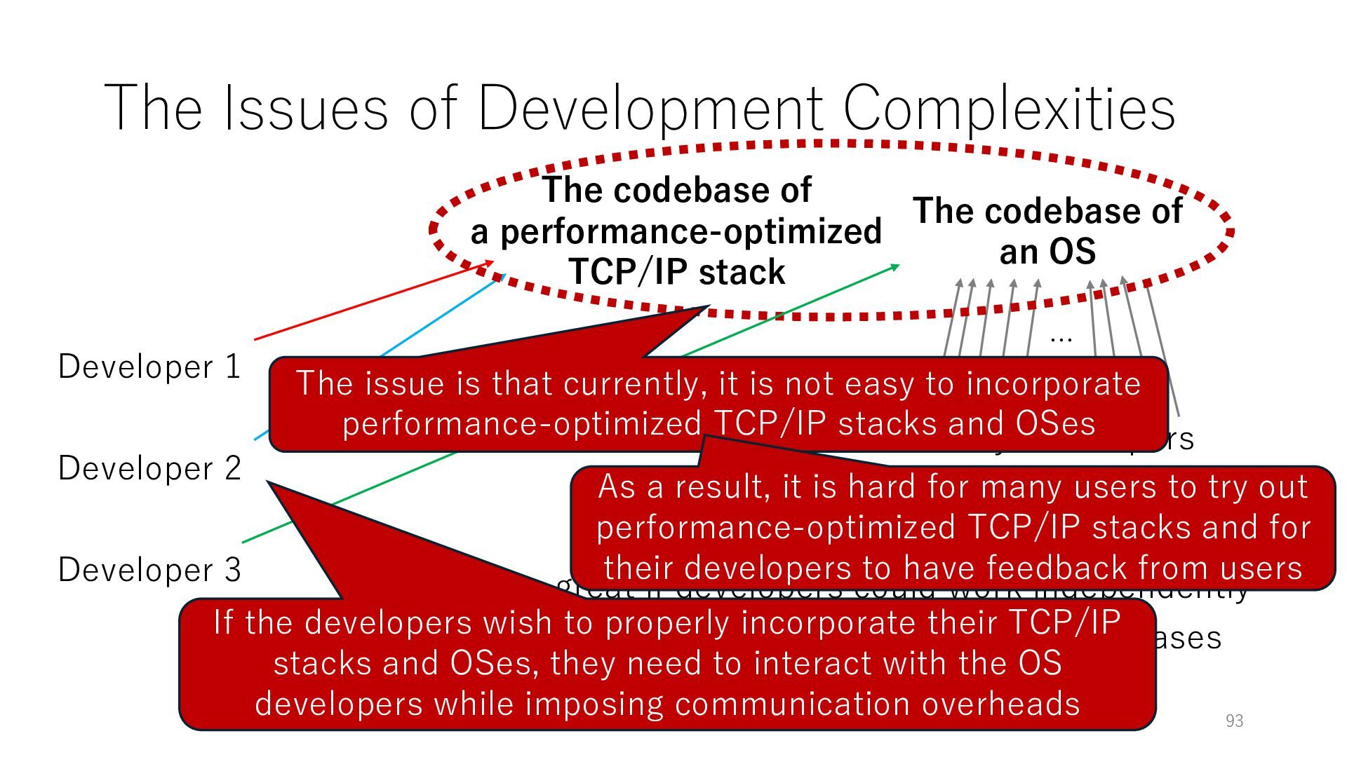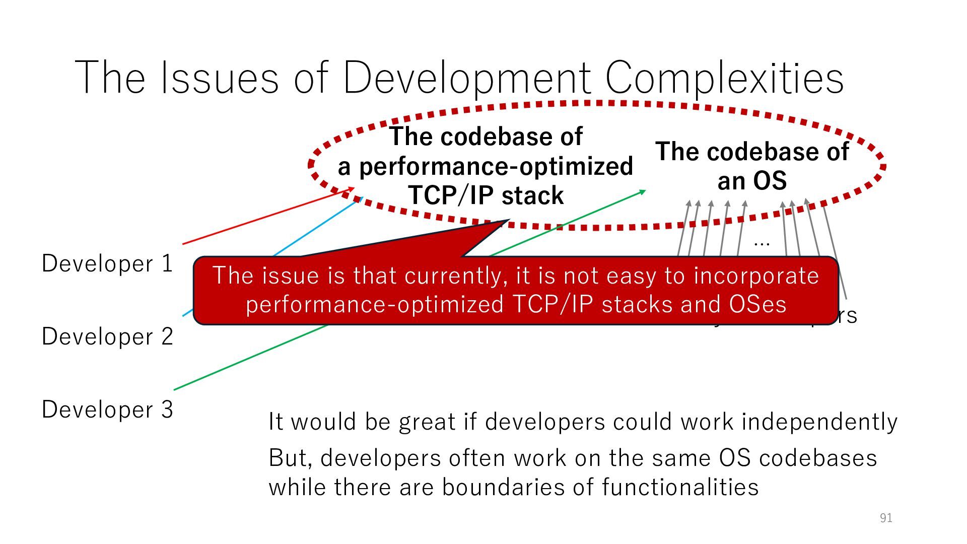 merged in FreeBSD • The speed of packet transmission over a raw socket is 1.05 Mpps • Mpps: million packets per second • netmap achieves the line rate (14.88 Mpps) with one CPU core application costs almost negligible: a packet generator which streams pre-generated packets, and a packet re- ceiver which just counts incoming packets. 5.2 Test equipment We have run most of our experiments on systems equipped with an i7-870 4-core CPU at 2.93 GHz (3.2 GHz with turbo-boost), memory running at 1.33 GHz, and a dual port 10 Gbit/s card based on the Intel 82599 NIC. The numbers reported in this paper refer to the netmap version in FreeBSD HEAD/amd64 as of April 2012. Experiments have been run using di- rectly connected cards on two similar systems. Results are highly repeatable (within 2% or less) so we do not report confidence intervals in the tables and graphs. netmap is extremely efficient so it saturates a 10 Gbit/s interface even at the maximum packet rate, and we need to run the system at reduced clock speeds to determine 0 2 4 6 8 10 12 14 16 0 0.5 1 1.5 2 2.5 3 Tx Rate (Mpps) Clock speed (GHz) netmap on 4 cores netmap on 2 cores netmap on 1 core Linux/pktgen FreeBSD/netsend Figure 5: Netmap transmit performance with 64-byte packets, variable clock rates and number of cores, com- pared to pktgen (a specialised, in-kernel generator avail- able on linux, peaking at about 4 Mpps) and a netsend (FreeBSD userspace, peaking at 1.05 Mpps). 63 Luigi Rizzo, “netmap: a novel framework for fast packet I/O”, USENIX ATC 2012 https://www.usenix.org/conference/atc12/technical-sessions/presentation/rizzo