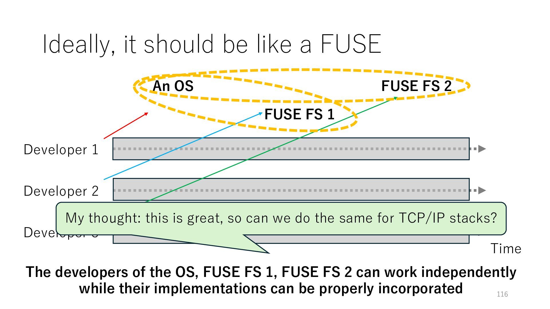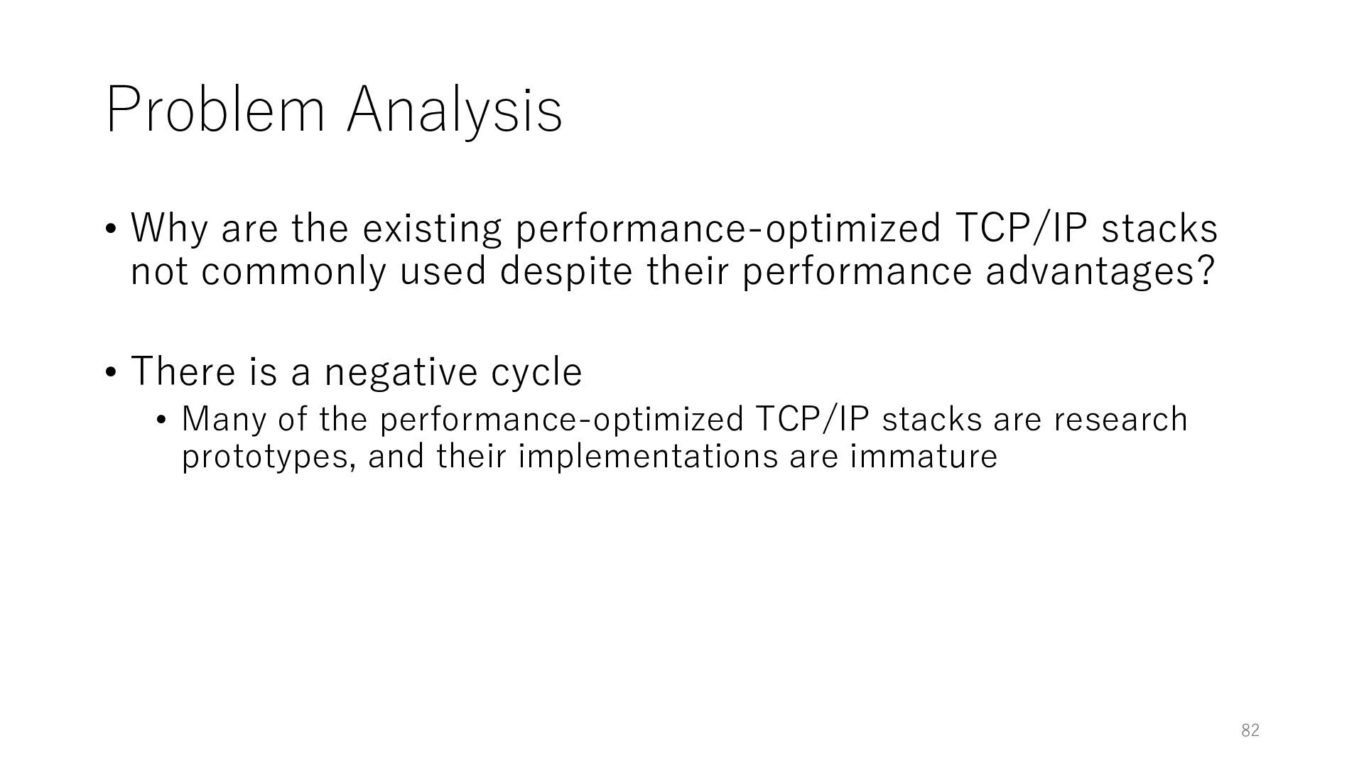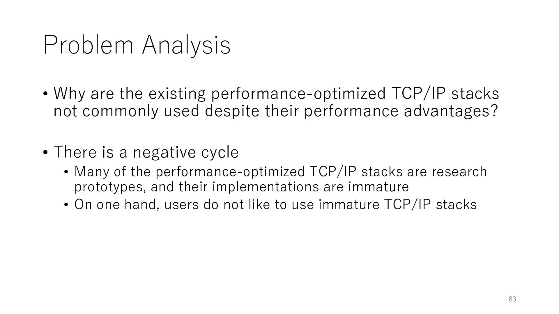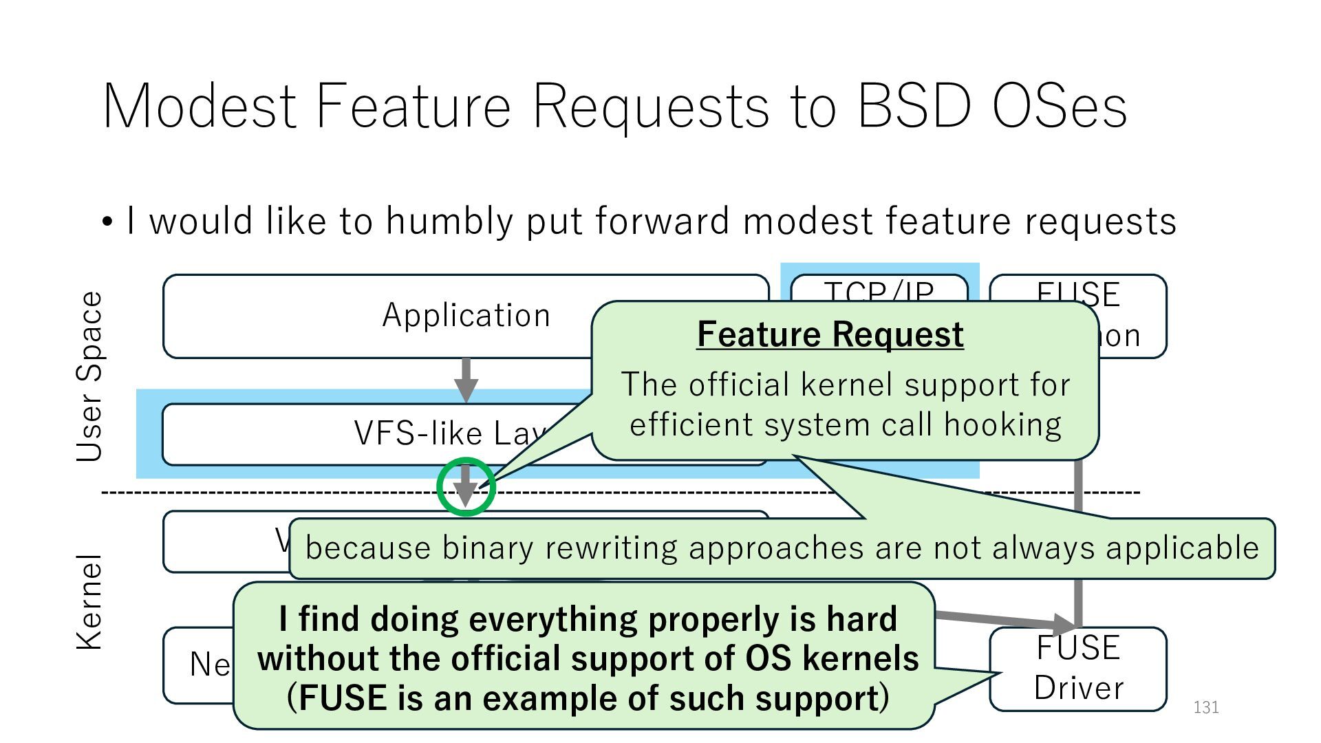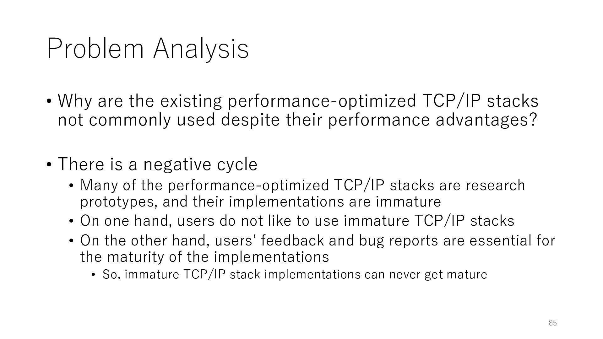 merged in FreeBSD • The speed of packet transmission over a raw socket is 1.05 Mpps • Mpps: million packets per second • netmap achieves the line rate (14.88 Mpps) with one CPU core application costs almost negligible: a packet generator which streams pre-generated packets, and a packet re- ceiver which just counts incoming packets. 5.2 Test equipment We have run most of our experiments on systems equipped with an i7-870 4-core CPU at 2.93 GHz (3.2 GHz with turbo-boost), memory running at 1.33 GHz, and a dual port 10 Gbit/s card based on the Intel 82599 NIC. The numbers reported in this paper refer to the netmap version in FreeBSD HEAD/amd64 as of April 2012. Experiments have been run using di- rectly connected cards on two similar systems. Results are highly repeatable (within 2% or less) so we do not report confidence intervals in the tables and graphs. netmap is extremely efficient so it saturates a 10 Gbit/s interface even at the maximum packet rate, and we need to run the system at reduced clock speeds to determine 0 2 4 6 8 10 12 14 16 0 0.5 1 1.5 2 2.5 3 Tx Rate (Mpps) Clock speed (GHz) netmap on 4 cores netmap on 2 cores netmap on 1 core Linux/pktgen FreeBSD/netsend Figure 5: Netmap transmit performance with 64-byte packets, variable clock rates and number of cores, com- pared to pktgen (a specialised, in-kernel generator avail- able on linux, peaking at about 4 Mpps) and a netsend (FreeBSD userspace, peaking at 1.05 Mpps). 63 Luigi Rizzo, “netmap: a novel framework for fast packet I/O”, USENIX ATC 2012 https://www.usenix.org/conference/atc12/technical-sessions/presentation/rizzo