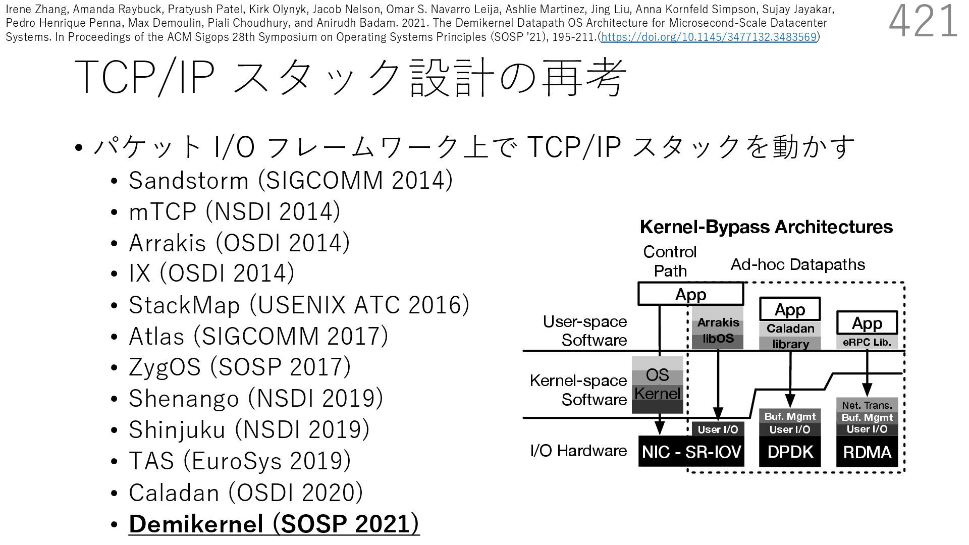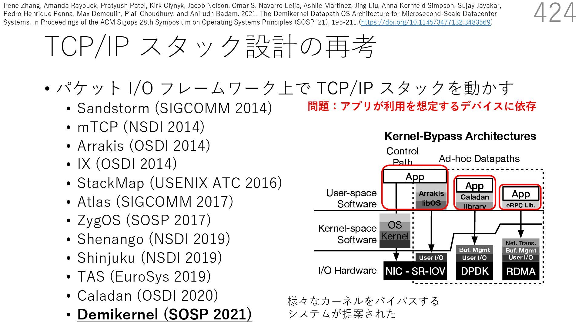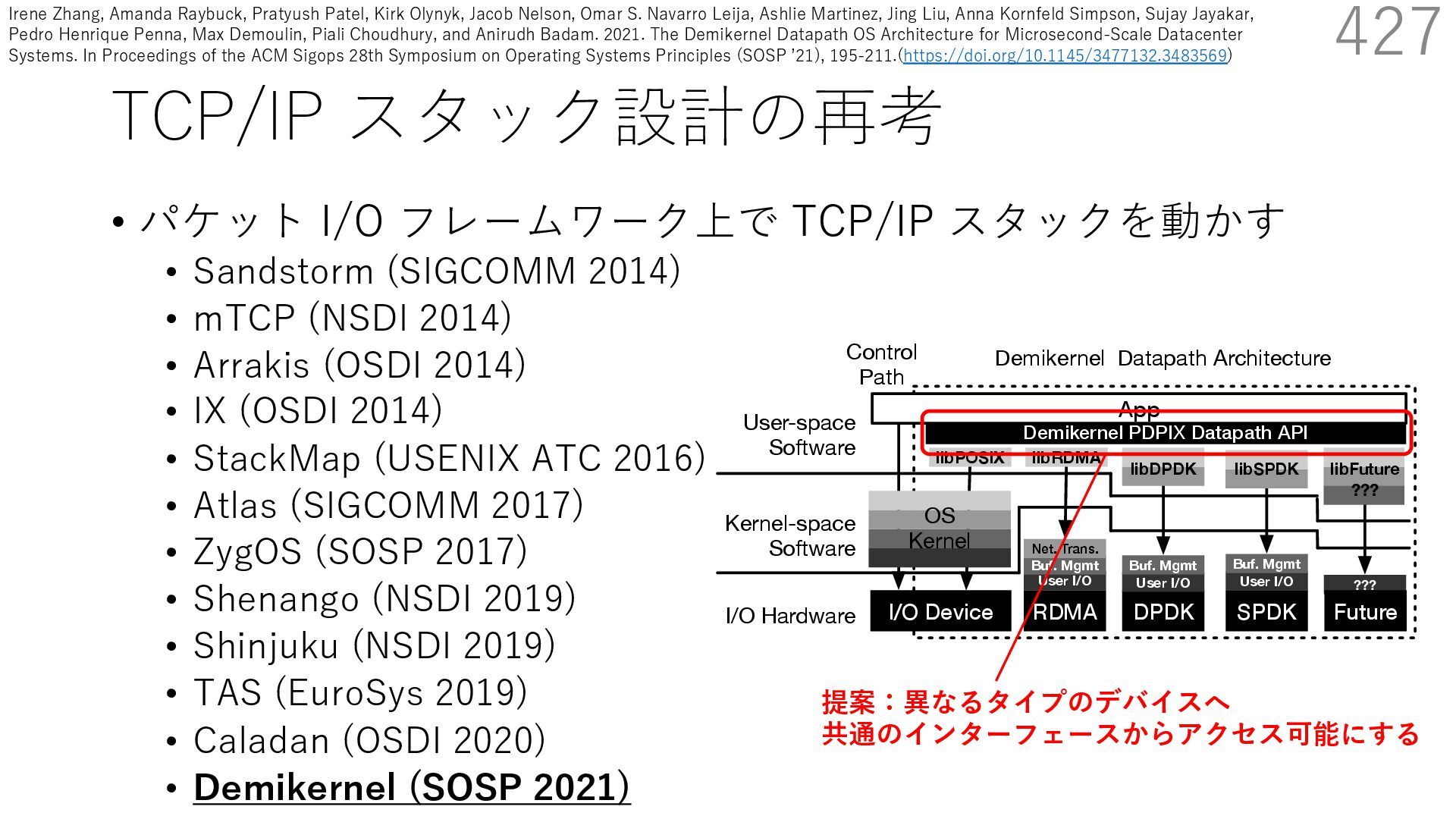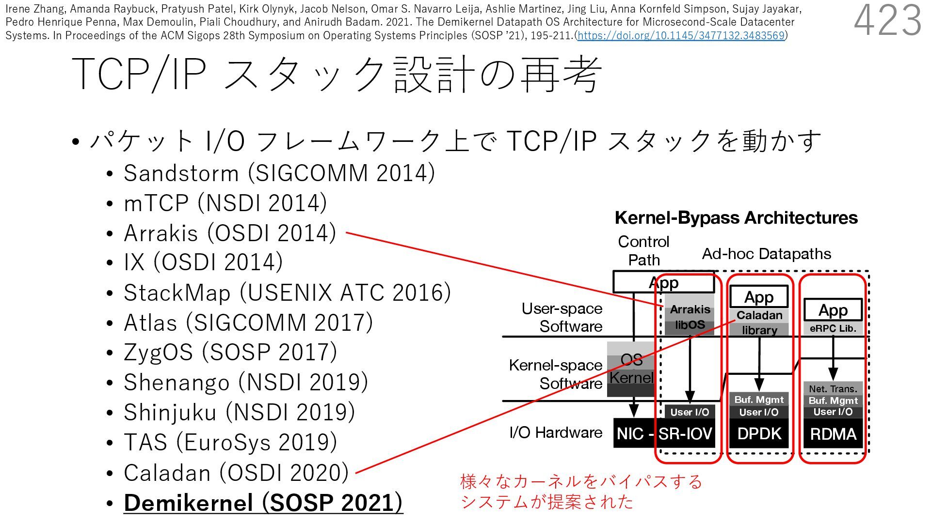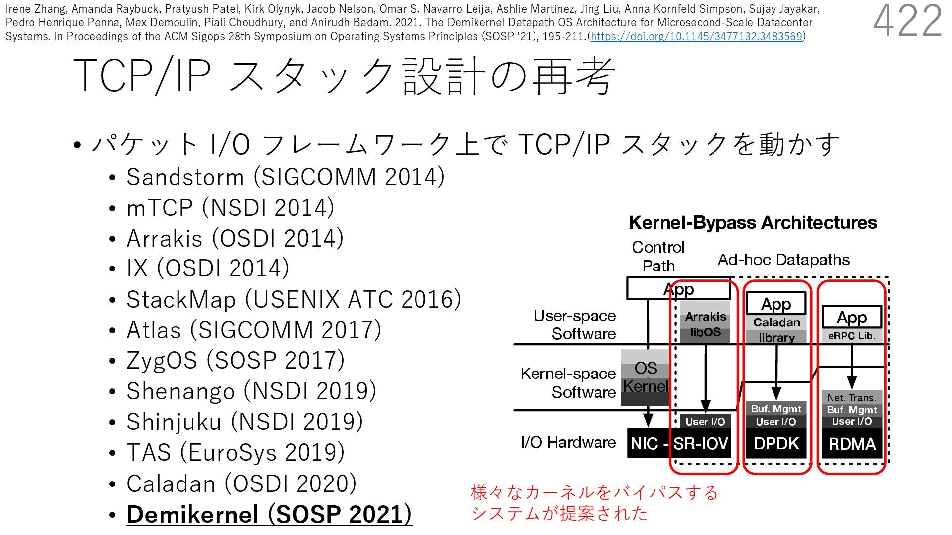 (SIGCOMM 2014) • mTCP (NSDI 2014) • Arrakis (OSDI 2014) • IX (OSDI 2014) • StackMap (USENIX ATC 2016) • Atlas (SIGCOMM 2017) • ZygOS (SOSP 2017) • Shenango (NSDI 2019) • Shinjuku (NSDI 2019) • TAS (EuroSys 2019) • Caladan (OSDI 2020) • Demikernel (SOSP 2021) 427 into a single library for both devices (e.g., RDMAxSPDK). We implemented the bulk of our library OS code in Rust. We initially prototyped several libOSes in C++; however, we found that Rust performs competitively with C++ and achieves ns-scale latencies while offering additional benefits. First, Rust enforces memory safety through language fea- tures and its compiler. Though our libOSes use unsafe code to bind to C/C++ kernel-bypass libraries and applications, User-space Software Kernel-space Software I/O Hardware I/O Device ??? libFuture ??? DPDK User I/O Buf. Mgmt libRDMA RDMA User I/O Buf. Mgmt Net. Trans. OS Kernel Control Path Demikernel Datapath Architecture App libPOSIX libDPDK SPDK User I/O Buf. Mgmt libSPDK Future Demikernel PDPIX Datapath API Figure 3. Demikernel kernel-bypass architecture. Demikernel ac- commodates heterogenous kernel-bypass devices, including poten- tial future hardware, with a flexible library OS-based datapath ar- chitecture.We include a libOS that goes through the OS kernel for 提案:異なるタイプのデバイスへ 共通のインターフェースからアクセス可能にする Irene Zhang, Amanda Raybuck, Pratyush Patel, Kirk Olynyk, Jacob Nelson, Omar S. Navarro Leija, Ashlie Martinez, Jing Liu, Anna Kornfeld Simpson, Sujay Jayakar, Pedro Henrique Penna, Max Demoulin, Piali Choudhury, and Anirudh Badam. 2021. The Demikernel Datapath OS Architecture for Microsecond-Scale Datacenter Systems. In Proceedings of the ACM Sigops 28th Symposium on Operating Systems Principles (SOSP ʼ21), 195-211.(https://doi.org/10.1145/3477132.3483569)