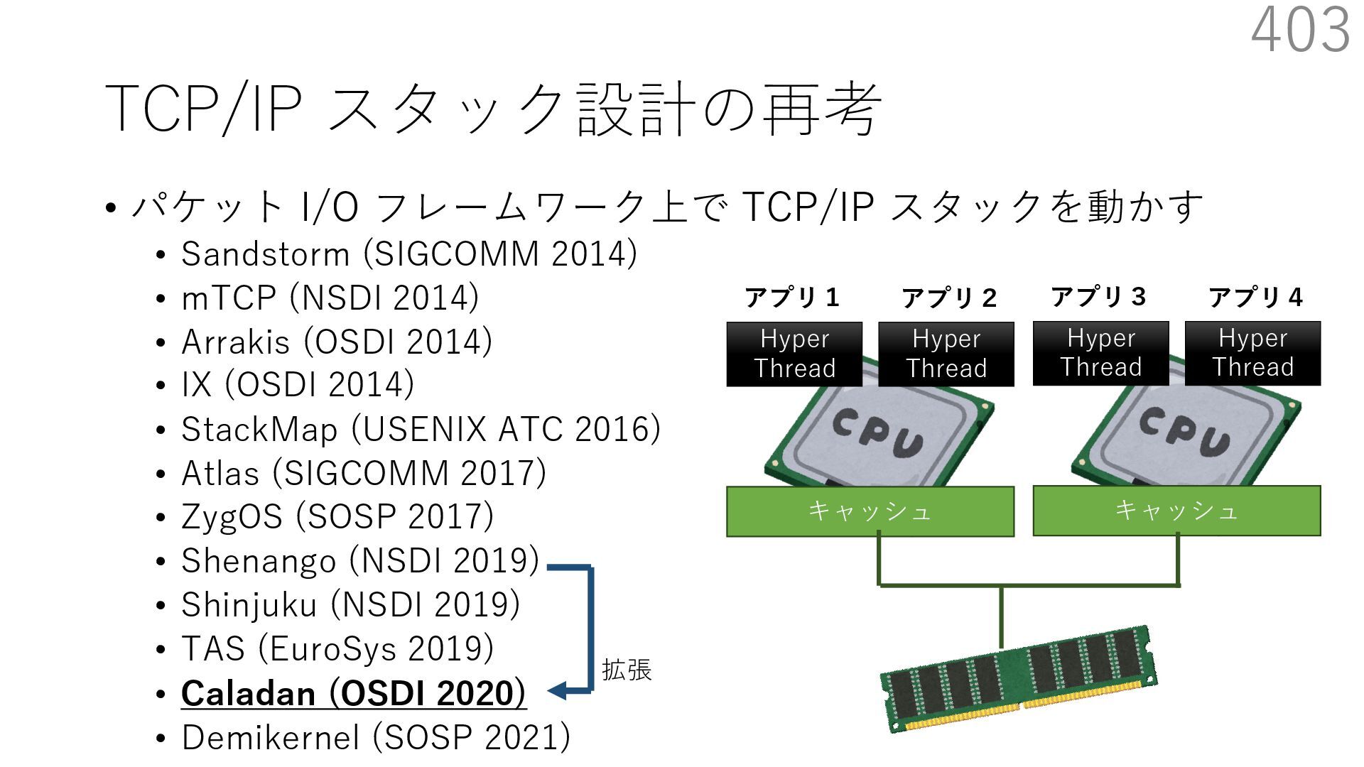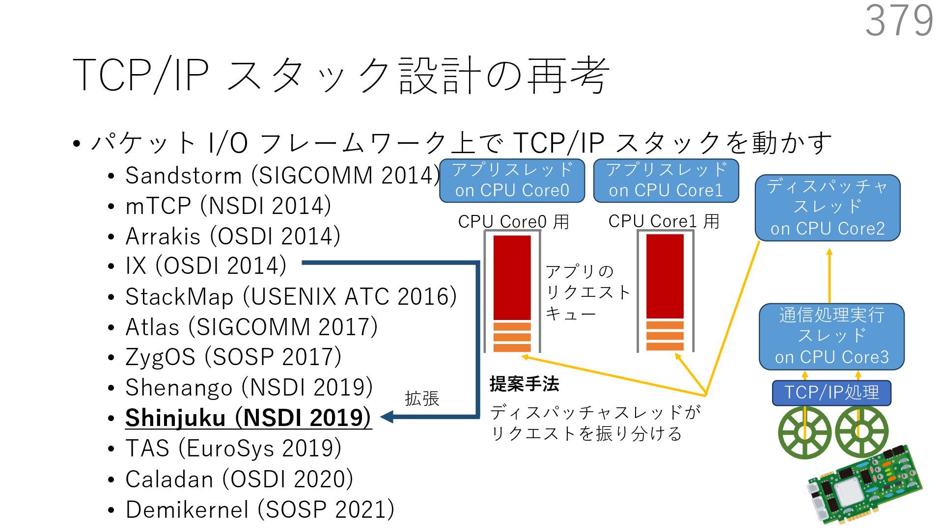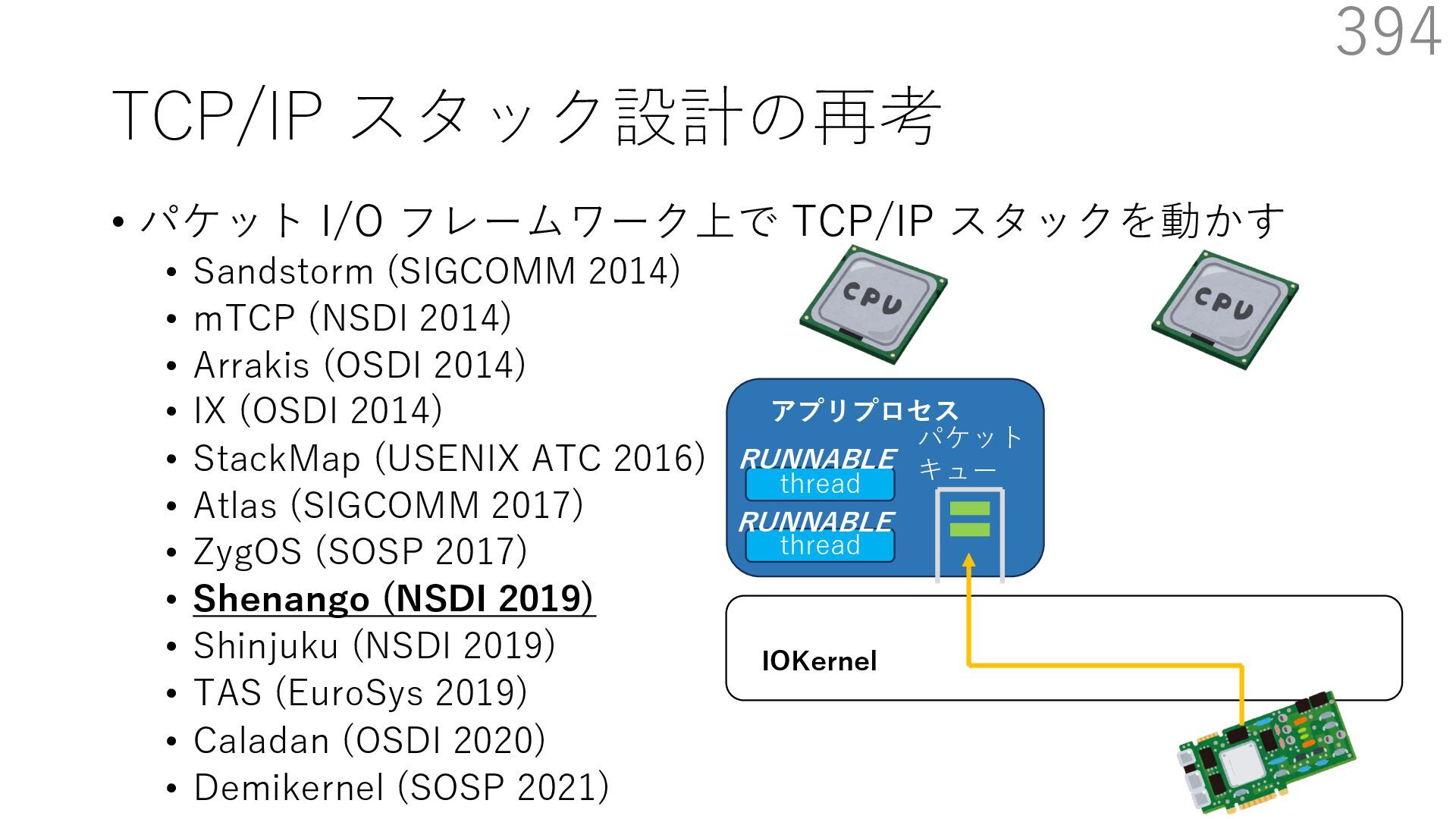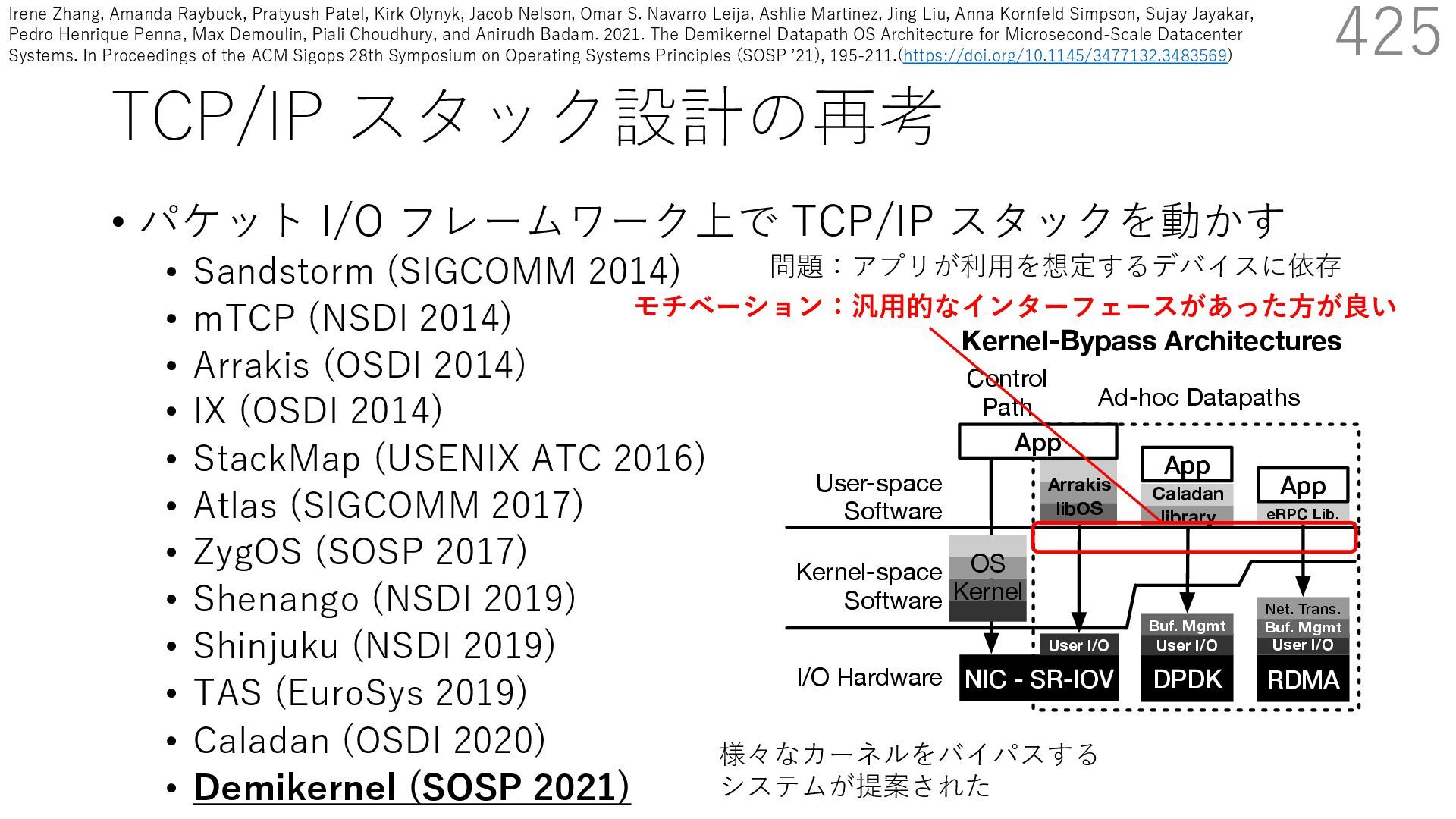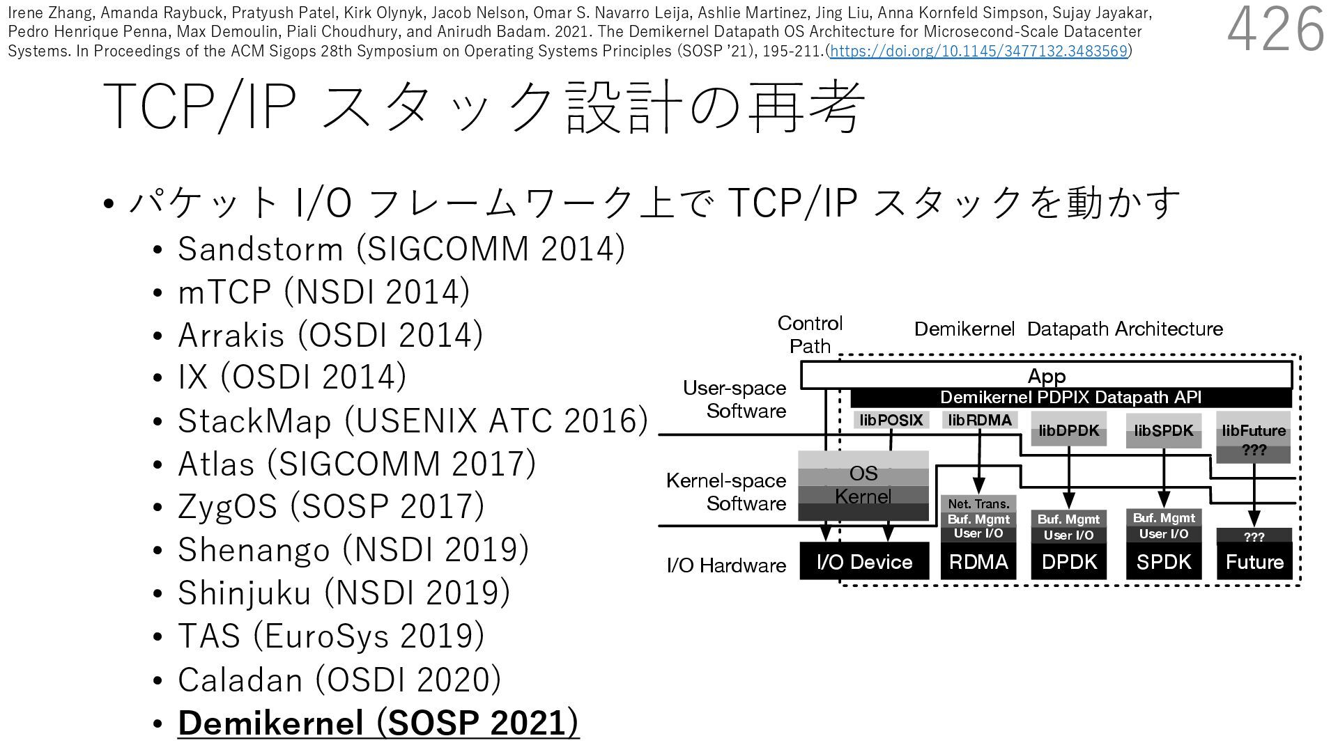(SIGCOMM 2014) • mTCP (NSDI 2014) • Arrakis (OSDI 2014) • IX (OSDI 2014) • StackMap (USENIX ATC 2016) • Atlas (SIGCOMM 2017) • ZygOS (SOSP 2017) • Shenango (NSDI 2019) • Shinjuku (NSDI 2019) • TAS (EuroSys 2019) • Caladan (OSDI 2020) • Demikernel (SOSP 2021) 427 into a single library for both devices (e.g., RDMAxSPDK). We implemented the bulk of our library OS code in Rust. We initially prototyped several libOSes in C++; however, we found that Rust performs competitively with C++ and achieves ns-scale latencies while offering additional benefits. First, Rust enforces memory safety through language fea- tures and its compiler. Though our libOSes use unsafe code to bind to C/C++ kernel-bypass libraries and applications, User-space Software Kernel-space Software I/O Hardware I/O Device ??? libFuture ??? DPDK User I/O Buf. Mgmt libRDMA RDMA User I/O Buf. Mgmt Net. Trans. OS Kernel Control Path Demikernel Datapath Architecture App libPOSIX libDPDK SPDK User I/O Buf. Mgmt libSPDK Future Demikernel PDPIX Datapath API Figure 3. Demikernel kernel-bypass architecture. Demikernel ac- commodates heterogenous kernel-bypass devices, including poten- tial future hardware, with a flexible library OS-based datapath ar- chitecture.We include a libOS that goes through the OS kernel for 提案:異なるタイプのデバイスへ 共通のインターフェースからアクセス可能にする Irene Zhang, Amanda Raybuck, Pratyush Patel, Kirk Olynyk, Jacob Nelson, Omar S. Navarro Leija, Ashlie Martinez, Jing Liu, Anna Kornfeld Simpson, Sujay Jayakar, Pedro Henrique Penna, Max Demoulin, Piali Choudhury, and Anirudh Badam. 2021. The Demikernel Datapath OS Architecture for Microsecond-Scale Datacenter Systems. In Proceedings of the ACM Sigops 28th Symposium on Operating Systems Principles (SOSP ʼ21), 195-211.(https://doi.org/10.1145/3477132.3483569)