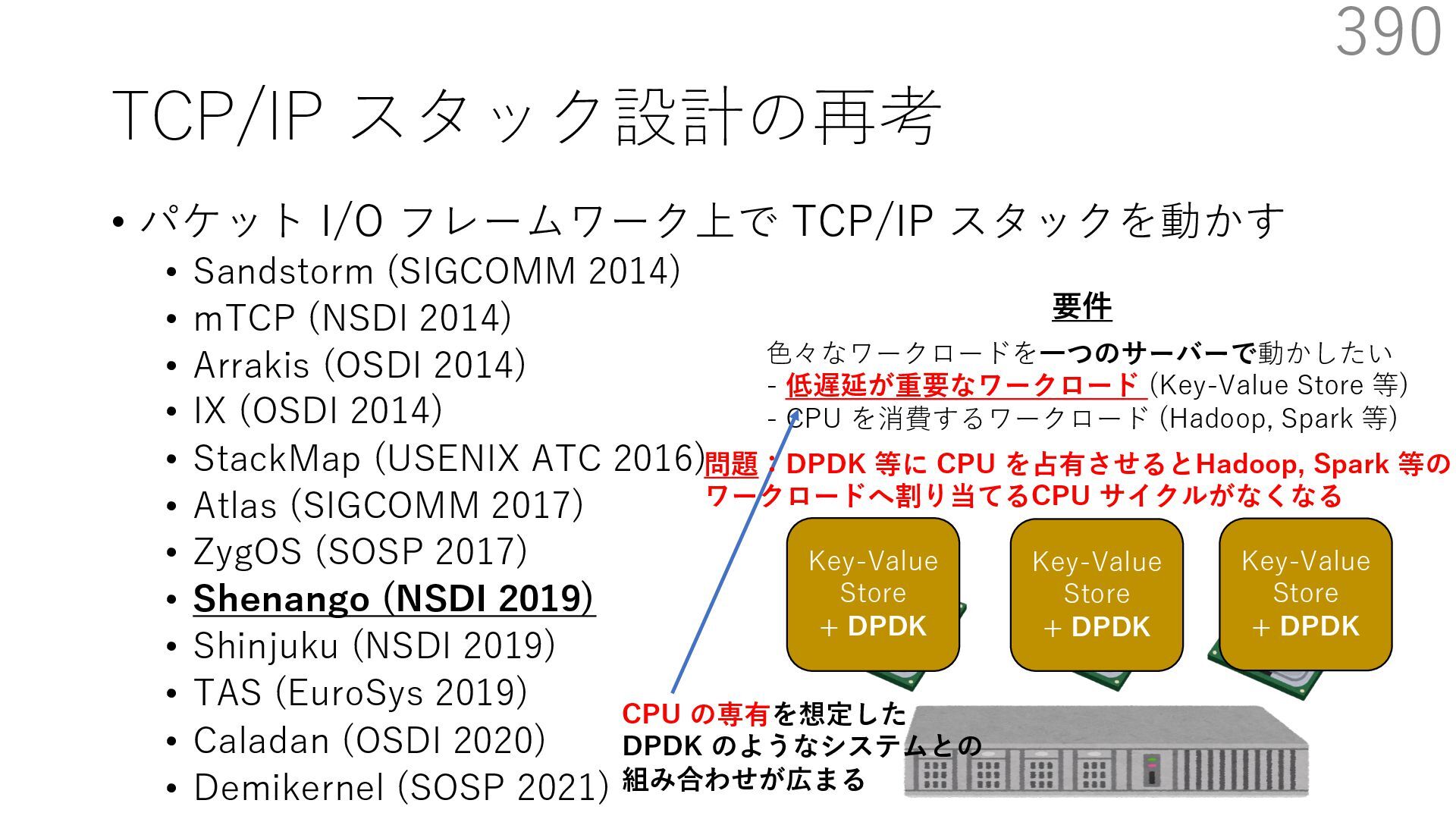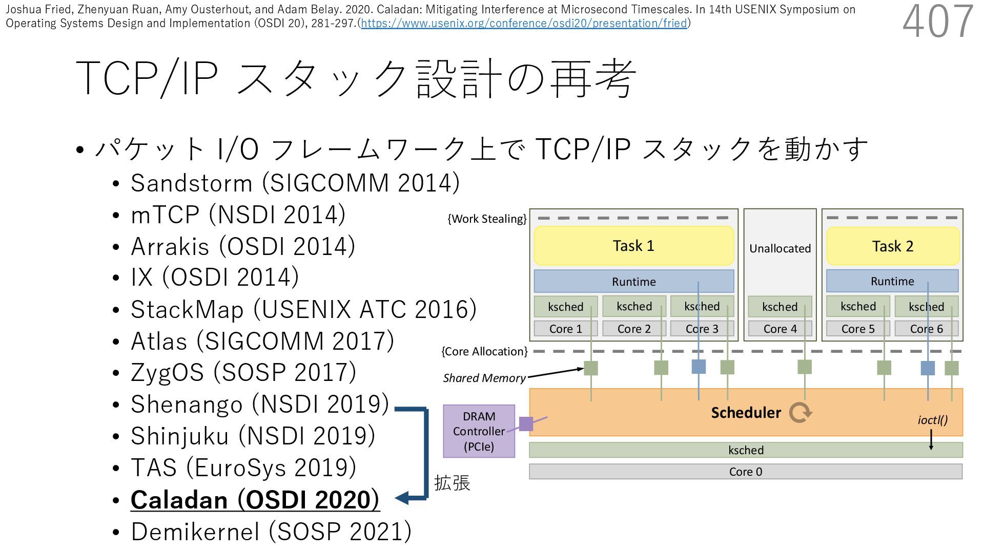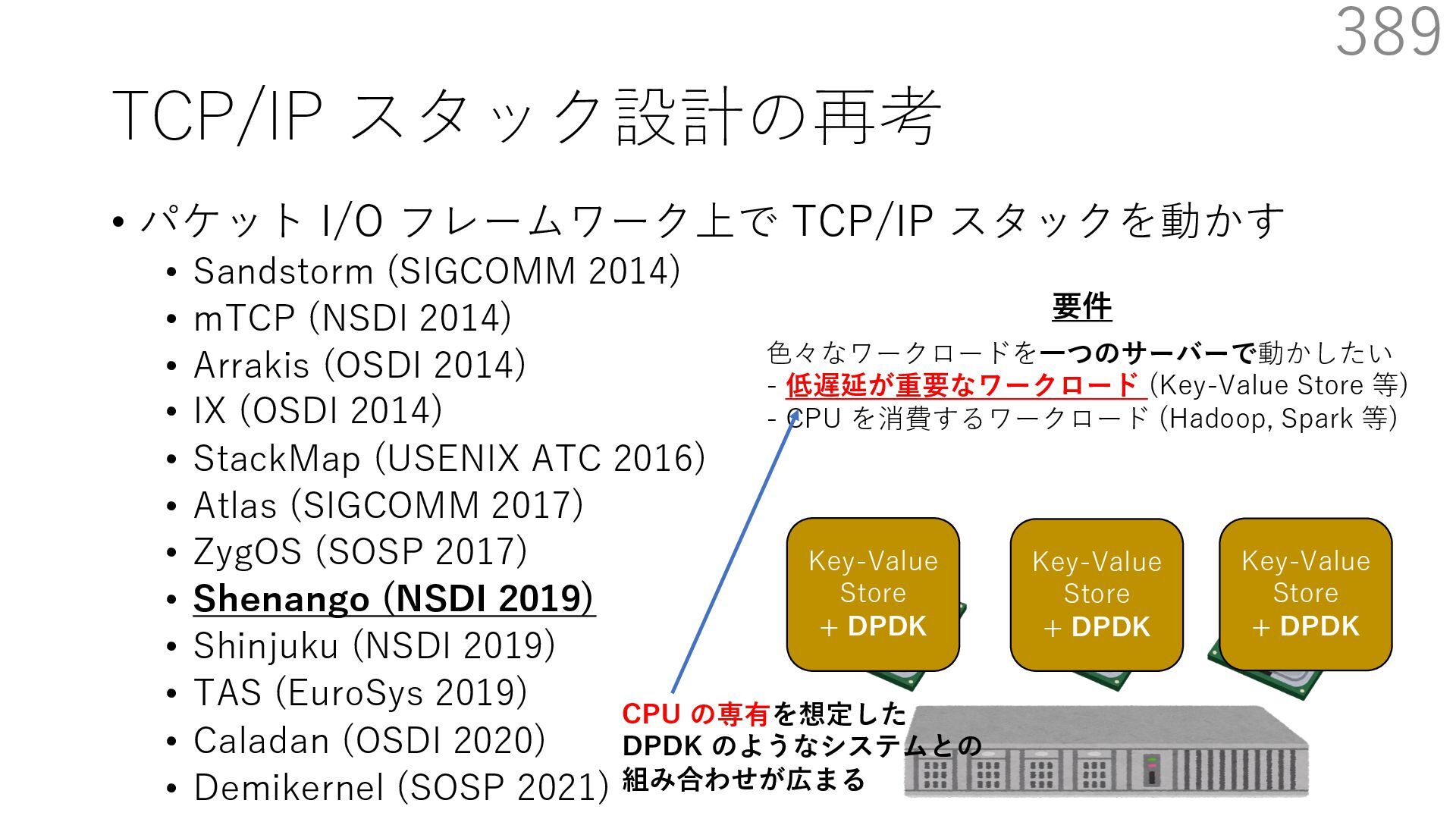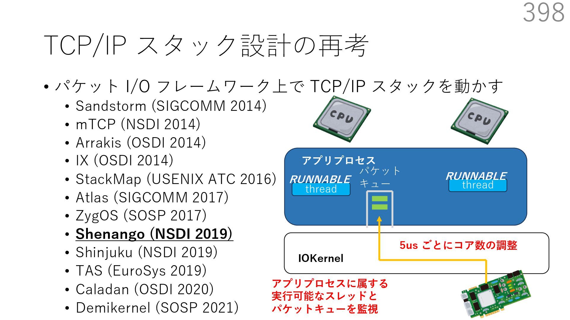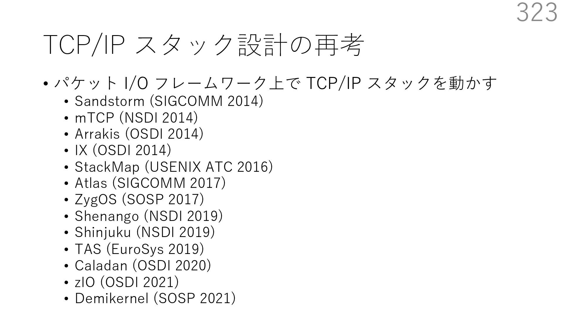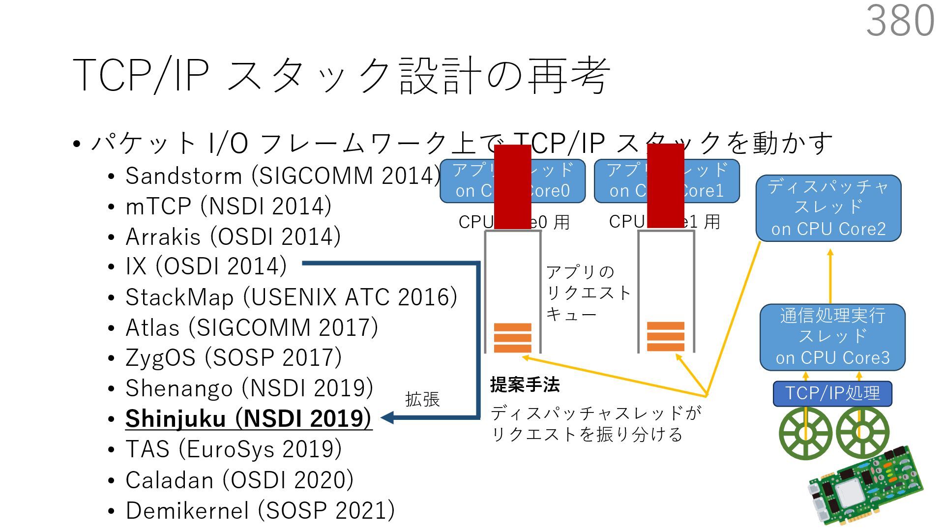 (SIGCOMM 2014) • mTCP (NSDI 2014) • Arrakis (OSDI 2014) • IX (OSDI 2014) • StackMap (USENIX ATC 2016) • Atlas (SIGCOMM 2017) • ZygOS (SOSP 2017) • Shenango (NSDI 2019) • Shinjuku (NSDI 2019) • TAS (EuroSys 2019) • Caladan (OSDI 2020) • Demikernel (SOSP 2021) 427 into a single library for both devices (e.g., RDMAxSPDK). We implemented the bulk of our library OS code in Rust. We initially prototyped several libOSes in C++; however, we found that Rust performs competitively with C++ and achieves ns-scale latencies while offering additional benefits. First, Rust enforces memory safety through language fea- tures and its compiler. Though our libOSes use unsafe code to bind to C/C++ kernel-bypass libraries and applications, User-space Software Kernel-space Software I/O Hardware I/O Device ??? libFuture ??? DPDK User I/O Buf. Mgmt libRDMA RDMA User I/O Buf. Mgmt Net. Trans. OS Kernel Control Path Demikernel Datapath Architecture App libPOSIX libDPDK SPDK User I/O Buf. Mgmt libSPDK Future Demikernel PDPIX Datapath API Figure 3. Demikernel kernel-bypass architecture. Demikernel ac- commodates heterogenous kernel-bypass devices, including poten- tial future hardware, with a flexible library OS-based datapath ar- chitecture.We include a libOS that goes through the OS kernel for 提案:異なるタイプのデバイスへ 共通のインターフェースからアクセス可能にする Irene Zhang, Amanda Raybuck, Pratyush Patel, Kirk Olynyk, Jacob Nelson, Omar S. Navarro Leija, Ashlie Martinez, Jing Liu, Anna Kornfeld Simpson, Sujay Jayakar, Pedro Henrique Penna, Max Demoulin, Piali Choudhury, and Anirudh Badam. 2021. The Demikernel Datapath OS Architecture for Microsecond-Scale Datacenter Systems. In Proceedings of the ACM Sigops 28th Symposium on Operating Systems Principles (SOSP ʼ21), 195-211.(https://doi.org/10.1145/3477132.3483569)