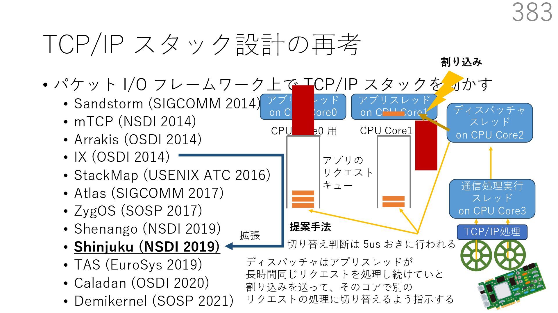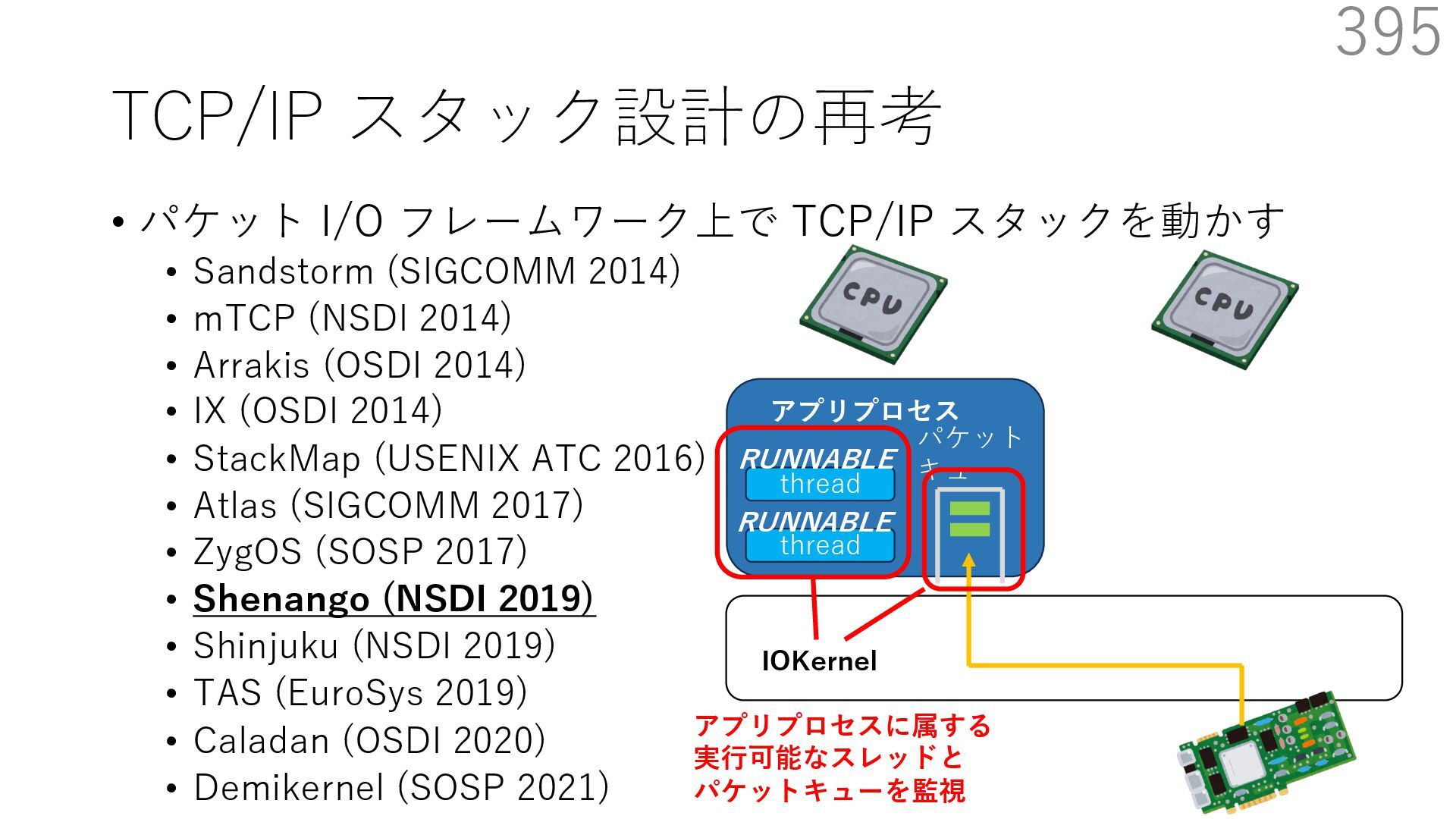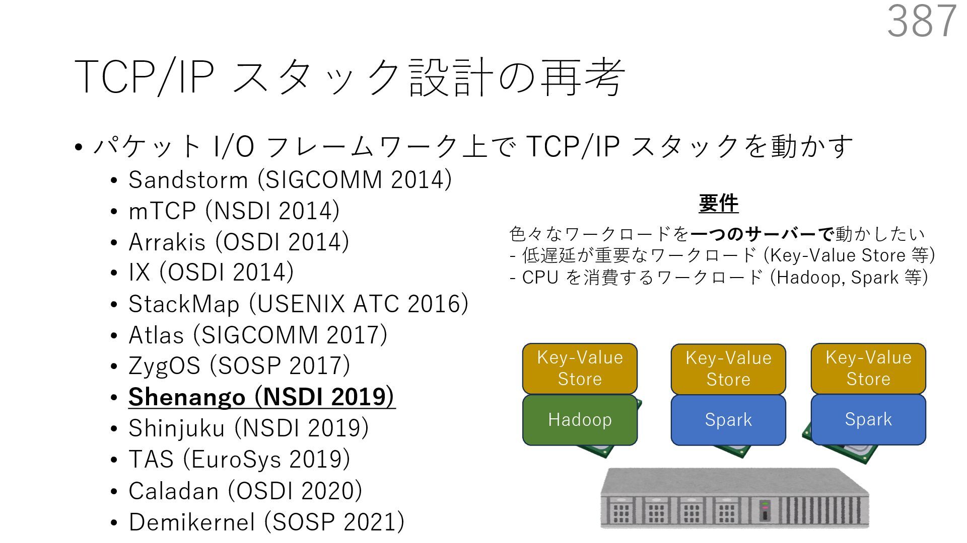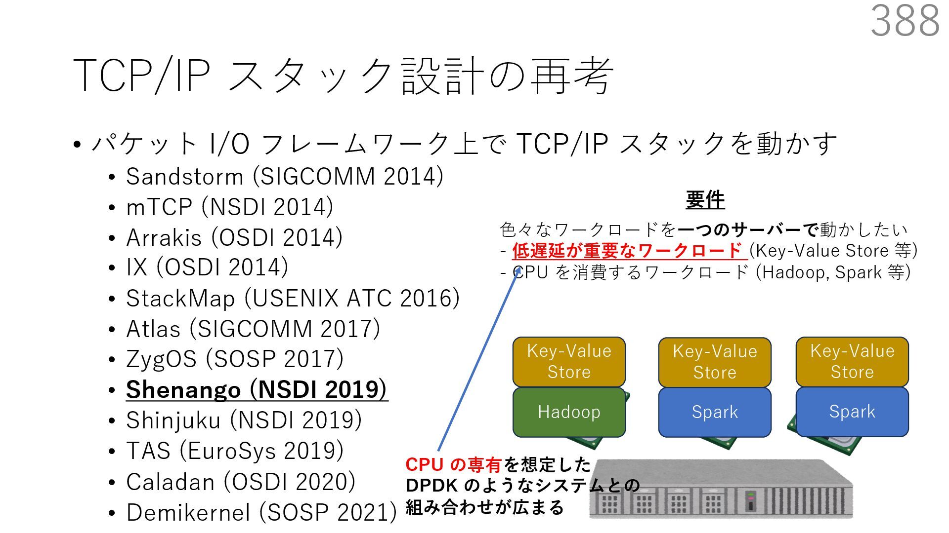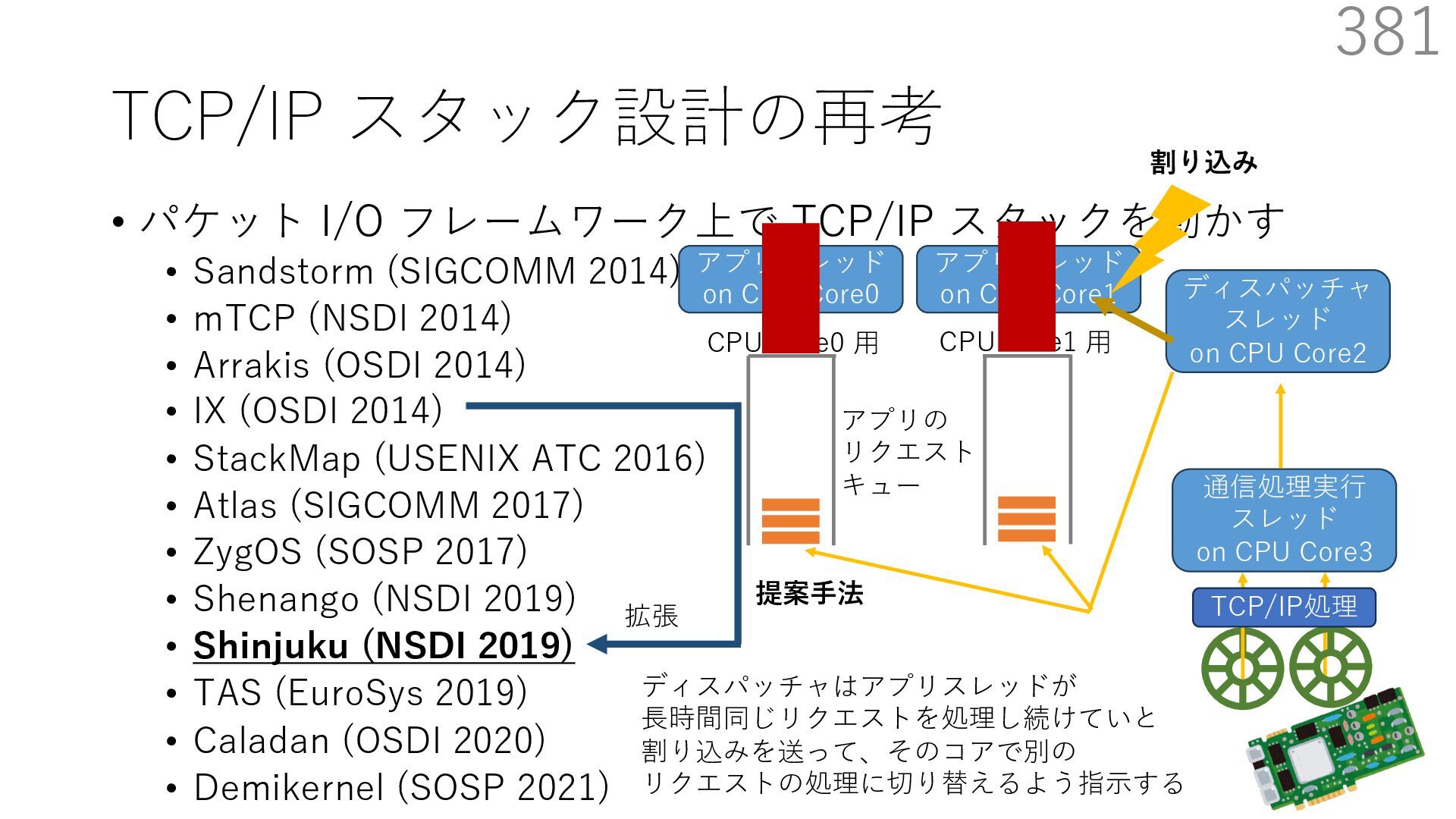 (SIGCOMM 2014) • mTCP (NSDI 2014) • Arrakis (OSDI 2014) • IX (OSDI 2014) • StackMap (USENIX ATC 2016) • Atlas (SIGCOMM 2017) • ZygOS (SOSP 2017) • Shenango (NSDI 2019) • Shinjuku (NSDI 2019) • TAS (EuroSys 2019) • Caladan (OSDI 2020) • Demikernel (SOSP 2021) 427 into a single library for both devices (e.g., RDMAxSPDK). We implemented the bulk of our library OS code in Rust. We initially prototyped several libOSes in C++; however, we found that Rust performs competitively with C++ and achieves ns-scale latencies while offering additional benefits. First, Rust enforces memory safety through language fea- tures and its compiler. Though our libOSes use unsafe code to bind to C/C++ kernel-bypass libraries and applications, User-space Software Kernel-space Software I/O Hardware I/O Device ??? libFuture ??? DPDK User I/O Buf. Mgmt libRDMA RDMA User I/O Buf. Mgmt Net. Trans. OS Kernel Control Path Demikernel Datapath Architecture App libPOSIX libDPDK SPDK User I/O Buf. Mgmt libSPDK Future Demikernel PDPIX Datapath API Figure 3. Demikernel kernel-bypass architecture. Demikernel ac- commodates heterogenous kernel-bypass devices, including poten- tial future hardware, with a flexible library OS-based datapath ar- chitecture.We include a libOS that goes through the OS kernel for 提案:異なるタイプのデバイスへ 共通のインターフェースからアクセス可能にする Irene Zhang, Amanda Raybuck, Pratyush Patel, Kirk Olynyk, Jacob Nelson, Omar S. Navarro Leija, Ashlie Martinez, Jing Liu, Anna Kornfeld Simpson, Sujay Jayakar, Pedro Henrique Penna, Max Demoulin, Piali Choudhury, and Anirudh Badam. 2021. The Demikernel Datapath OS Architecture for Microsecond-Scale Datacenter Systems. In Proceedings of the ACM Sigops 28th Symposium on Operating Systems Principles (SOSP ʼ21), 195-211.(https://doi.org/10.1145/3477132.3483569)